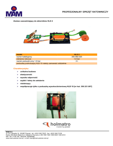 PROFESJONALNY SPRZĘT RATOWNICZY Zestaw uszczelniający do zbiorników HLS 2 model numer katalogowy ciśnienie robocze nacisk poduszki przy 1,5 bar poduszkę podnoszącą HLB 10 naleŜy zamawiać oddzielnie HLS 2 350.582.020 1,5 bar 2t Charakterystyka: unikalna budowa elastyczność wysoka odporność szybki i łatwy do załoŜenia nieiskrzący współpracuje tylko z poduszką wysokociśnieniową HLB 10 [nr kat. 350.321.007] MAM S.C. ul. C.K. Norwida 14, 60-867 Poznań, tel.+ 48 61 842 78 87, fax + 48 61 842 75 56 Konto: ING Bank Śląski S.A. Oddział w Poznaniu nr 98 1050 1520 1000 0023 1340 2212 NIP: 781-17-94-150, REGON: 300484589 www.mam-poznan.com.pl, e-mail: [email protected] PROFESJONALNY SPRZĘT RATOWNICZY Skład zestawu HLS 2: 1. 1 x zestaw pasków mocujących 2. 1 x nakładka uszczelniająca (465 x 465 mm) 3. 1 x pokrywa ochronna, pomarańczowa (do poz. 8) 4. 1 x pokrywa ochronna, zielona (do poz. 9) 5. 4 x pas naroŜny ze sprzączką (I=635) 6. 2 x pas nośny ze sprzączką (I=455) 7. 1 x wąŜ odcinający z zaworem bezpieczeństwa nastawionym na 1,5 bar 8. 1 x pas naciągający z zapadką, pomarańczowy (I=10 m) 9. 1 x pas naciągający z zapadką, zielony (I=10 m) MAM S.C. ul. C.K. Norwida 14, 60-867 Poznań, tel.+ 48 61 842 78 87, fax + 48 61 842 75 56 Konto: ING Bank Śląski S.A. Oddział w Poznaniu nr 98 1050 1520 1000 0023 1340 2212 NIP: 781-17-94-150, REGON: 300484589 www.mam-poznan.com.pl, e-mail: [email protected]