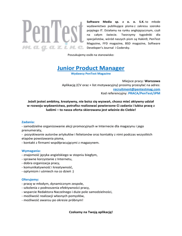 Software Media sp. z o. o. S.K. to młode wydawnictwo publikujące pisma z zakresu szeroko pojętego IT. Działamy na rynku anglojęzycznym, czyli na całym świecie. Tworzymy tygodniki dla specjalistów, wśród naszych pism są Hakin9, PenTest Magazine, FFD magazine, BSD magazine, Software Developer's Journal i Codersky. Poszukujemy osób na stanowisko: Junior Product Manager Wydawcy PenTest Magazine Miejsce pracy: Warszawa Aplikację (CV oraz + list motywacyjny) prosimy przesyłać na adres: [email protected] Kod referencyjny: PRACA/PenTest/JPM Jeżeli jesteś ambitny, kreatywny, nie boisz się wyzwań, chcesz mieć aktywny udział w rozwoju wydawnictwa, potrafisz realizować powierzone Ci zadania i lubisz pracę z ludźmi – to nasza oferta skierowana jest właśnie do Ciebie! Zadania: - samodzielne organizowanie akcji promocyjnych w Internecie dla magazynu i jego prenumeraty, - pozyskiwanie autorów artykułów i felietonów oraz kontakty z nimi podczas wszystkich etapów powstawania pisma, - kontakt z firmami współpracującymi z magazynem. Wymagania: - znajomość języka angielskiego w stopniu biegłym, - sprawne korzystanie z Internetu, - dobra organizacja pracy, - komunikatywność i kreatywność, - optymizm i uśmiech na co dzień :) Oferujemy: - pracę w młodym, dynamicznym zespole, - szkolenia z podnoszenia efektywności pracy, - wsparcie Redaktora Naczelnego i duże pole samodzielności, - możliwość realizacji własnych pomysłów, - możliwość awansu po okresie próbnym! Czekamy na Twoją aplikację! Osoby zainteresowane naszą ofertą prosimy o przesłanie aplikacji (CV oraz + list motywacyjny) na adres: [email protected] w tytule maila proszę wpisać kod referencyjny: PRACA/PenTestMag/JPM Prosimy o dopisanie klauzuli o ochronie danych osobowych: „Wyrażam zgodę na przetwarzanie moich danych osobowych dla potrzeb procesu rekrutacji” (zgodnie z Ustawą z dnia 29.08.1997 r. o Ochronie Danych Osobowych Dz. U. Nr 133 pozycja 883).