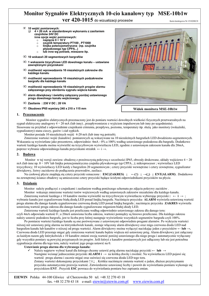 Monitor Sygnałów Elektrycznych 10-cio kanałowy typ MSE-10b1w ver 420-1015 do wizualizacji procesów Karta katalogowa Nr 151028ECE • • • • • • • • • 1. 10 wejść pomiarowych: 4 ÷ 20 mA w standardowym wykonaniu z zasilaniem czujników 24V DC inne opcje wejść pomiarowych: o napięcie 0 ÷ 10 V o czujnik temperatury PT100 , PT1000 o linijka potencjometryczna (np. czujnika pływakowego typ CPPA...) o lub inne wg potrzeb, mieszane itp. 10 wskazań 20 segmentowych bargrafów 1 wskazanie trzycyfrowe LED dowolnego kanału – ustawiane zewnętrznymi przyciskami możliwość wprowadzenia 10 niezależnych zakresów dla każdego kanału możliwość wprowadzenia 10 niezależnych podzakresów bargrafu dla każdego kanału możliwość wprowadzenia 10 niezależnych progów alarmu załączanego przy obniżeniu sygnału wejścia kanału alarm dźwiękowy i świetlny załączany poniżej ustawionego progu dowolnego kanału wejściowego Zasilanie : 230 V DC ; 20 VA Obudowa IP65 wymiary 240 x 210 x 115 mm Widok monitora MSE-10b1w Przeznaczenie Monitor sygnałów elektrycznych przeznaczony jest do pomiaru wartości dowolnych wielkości fizycznych przetwarzalnych na sygnał elektryczny analogowy 4 ÷ 20 mA (lub inny) , przepływomierze z wyjściem impulsowym lub inny po uzgodnieniu). Stosowane na przykład z odpowiednimi czujnikami ciśnienia, przepływu, poziomu, temperatury itp. służą jako monitory (wskaźniki, sygnalizatory) stanu cieczy, gazów i ciał sypkich. Monitor posiada 10 niezależnych wejść 4-20 mA (lub inne wg potrzeb). Zmierzone wartości wejść (kanałów) pomiarowych są wskazywane na 10 niezależnych bargrafach LED dwudziesto-segmentowych. Wskazania są wyświetlane jako procentowe, odpowiednio: 4mA - 0% a 100% według ustawionego podzakresu dla bargrafu. Dodatkowo wartość każdego kanału można wyświetlić na trzycyfrowym wyświetlaczu LED, zgodnie z ustawionym zakresem kanału dla 20mA, poprzez wybranie odpowiedniego kanału przyciskami strzałek ← i →. 2. Budowa Monitor w tej wersji zawiera: obudowę z przeźroczystą pokrywą o szczelności IP65, obwody drukowane, układy wejściowe 4 ÷ 20 mA (lub inne np. 0 ÷ 10V lub linijka potencjometryczna czujnika pływakowego typ CPPA...); mikroprocesor ; wyświetlacz LED trzycyfrowy; 10 wyświetlaczy LED każdy z bargrafem 20 segmentowym ; cztery przyciski wewnętrzne i cztery zewnętrzne, sygnalizator dźwiękowy, listwy zaciskowe do podłączenia przewodów, zasilacz. Na czołowej płycie znajdują się cztery przyciski oznaczone : ESC(ZAKRES) ; ←(↑) ; →(↓) ; ENT(ALARM) . Dodatkowo na zewnętrznej ściance obudowy są umieszczone cztery przyciski będące ścisłymi odpowiednikami przycisków na płycie. 3. Działanie Monitor należy podłączyć z czujnikami i zasilaniem według poniższego schematu po zdjęciu pokrywy zacisków . Monitor wskazuje zmierzone wartości torów wejściowych według ustawionych zakresów niezależnie dla każdego kanału. Zmierzoną wartość każdego z 10 kanałów można wyświetlić na trzycyfrowym wyświetlaczu wybierając przyciski : ← i → ; wybranie kanału jest sygnalizowane białą diodą LED ponad linijką bargrafu. Naciśnięcie przycisku ALARM wyświetla ustawioną wartość progu alarmu dla danego kanału sygnalizowane czerwoną diodą LED ponad linijką bargrafu ; naciśnięcie przycisku ZAKRES wyświetla ustawioną wartość progu zakresu dla danego kanału sygnalizowane miganiem białej diody LED. Zmierzona wartość każdego kanału jest przeliczana według odpowiednio ustawionego zakresu dla danego toru: czyli 4mA odpowiada wartość 0 ; a 20mA ustawiona liczba zakresu, wartości pomiędzy są liniowo przeliczane. Dla każdego zakresu należy ustawić podzakres bargrafu, jest to liczba przy której następuje wyświetlenie wszystkich segmentów bargrafu czyli 100%. Po pomiarze wartości każdego kanału są one porównywane z ustawionymi odpowiednio progami alarmów. Po wykryciu wartości niższej niż ustawiony próg alarmu na którymkolwiek kanale, zostaje włączony alarm dźwiękowy oraz miga czerwona dioda LED nad bargrafem kanału lub kanałów o niższej od progu wartości. Alarm dźwiękowy można wyłączyć naciskając jeden z przycisków ← lub →. Czerwona dioda LED przestaje migać gdy zmierzona wartość kanału będzie większa niż ustawiony próg. Alarm dźwiękowy jest załączany za każdym razem gdy którykolwiek z 10 kanałów zmieni swoją wartość poniżej ustawionego dla niego progu i automatycznie wyłączany gdy wszystkie pomiary są powyżej przypisanych im progów. Jeśli któryś z kanałów pomiarowych jest odłączony lub nie jest potrzebna sygnalizacja alarmu dla tego toru, należy wartość jego progu ustawić na 0. Ustawianie progu alarmu dla wybranego kanału: Należy najpierw wybrać kanał dla którego chcemy ustawić próg alarmu naciskając przyciski ← lub → Następnie wcisnąć jednocześnie przyciski ALARM i → na krótką chwilę i zwolnić. Na wyświetlaczu LED pojawi się wartość progu alarmu i zacznie migać oraz zaświeci się czerwona dioda LED tego toru. Zmiany wartości dokonujemy przyciskami ↑ i ↓ . Krótkie naciśnięcie zmienia wartość o jeden, dłuższe przytrzymanie przycisku automatycznie przewija wartość. Zatwierdzenie ustawionej liczby i powrót do wyświetlania pomiaru wykonuje się przyciskiem ENT . Przycisk ESC powraca do wyświetlania pomiaru bez zapisania zmian. ZACH METALCHEM EIEWIN Polska 44-100 Sp.Gliwice z o.o. Polska ul Chorzowska 44-100 Gliwice 50 tel. +48 ul Chorzowska 32 270 43 1844 C tel. +48 32 270 22 62 fax.fax. +48+48 32 32 270270 43 45 18 28e-mail: [email protected] e-mail: [email protected] www.eiewin.com.pl www.metalchem.pl Monitor Sygnałów Elektrycznych 10-cio kanałowy typ MSE-10b1w ver 420-1015 do wizualizacji procesów Karta katalogowa Nr 151028ECE podłączenie zasilania monitora 230V AC wykonać do zacisków oznaczonych N i L 4. +24V - wyj 4-20m
