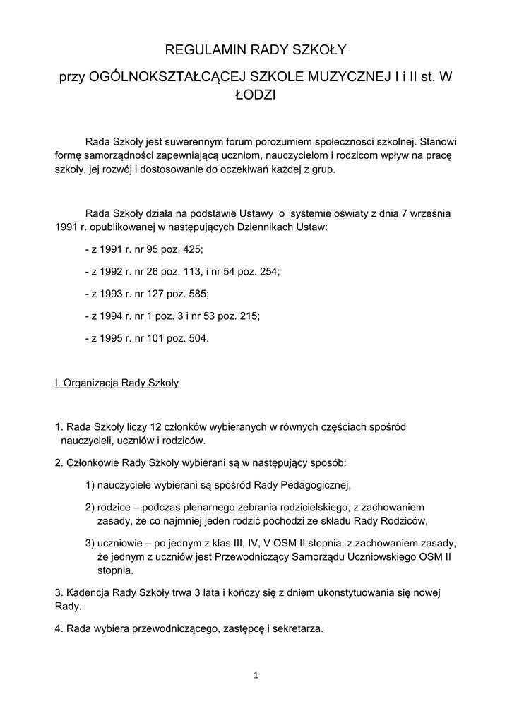 REGULAMIN RADY SZKOŁY przy OGÓLNOKSZTAŁCĄCEJ SZKOLE MUZYCZNEJ I i II st. W ŁODZI Rada Szkoły jest suwerennym forum porozumiem społeczności szkolnej. Stanowi formę samorządności zapewniającą uczniom, nauczycielom i rodzicom wpływ na pracę szkoły, jej rozwój i dostosowanie do oczekiwań każdej z grup. Rada Szkoły działa na podstawie Ustawy o systemie oświaty z dnia 7 września 1991 r. opublikowanej w następujących Dziennikach Ustaw: - z 1991 r. nr 95 poz. 425; - z 1992 r. nr 26 poz. 113, i nr 54 poz. 254; - z 1993 r. nr 127 poz. 585; - z 1994 r. nr 1 poz. 3 i nr 53 poz. 215; - z 1995 r. nr 101 poz. 504. I. Organizacja Rady Szkoły 1. Rada Szkoły liczy 12 członków wybieranych w równych częściach spośród nauczycieli, uczniów i rodziców. 2. Członkowie Rady Szkoły wybierani są w następujący sposób: 1) nauczyciele wybierani są spośród Rady Pedagogicznej, 2) rodzice – podczas plenarnego zebrania rodzicielskiego, z zachowaniem zasady, że co najmniej jeden rodzić pochodzi ze składu Rady Rodziców, 3) uczniowie – po jednym z klas III, IV, V OSM II stopnia, z zachowaniem zasady, że jednym z uczniów jest Przewodniczący Samorządu Uczniowskiego OSM II stopnia. 3. Kadencja Rady Szkoły trwa 3 lata i kończy się z dniem ukonstytuowania się nowej Rady. 4. Rada wybiera przewodniczącego, zastępcę i sekretarza. 1 5. Rada obraduje na posiedzeniach zwoływanych w zależności od potrzeb, ale nie rzadziej niż raz na 3 miesiące. O terminie zebrania członkowie Rady winni być powiadomieni co najmniej 14 dni wcześniej. a) przewodniczący zwołuje nadzwyczajne posiedzenie Rady na wniosek 1/3 jej członków lub z własnej inicjatywna skutek nieprzewidzianych okoliczności. 6. Ustalenia podejmowane są w formie uchwał większością głosów, w obecności co najmniej 6 członków Rady, pod obecność min. 1 przedstawiciela każdej grupy wyborców. a) głosowanie jest jawne, ale każdy członek Rady ma prawo żądać głosowania tajnego, wniosek ten nie podlega głosowaniu; b) głosowanie w sprawach personalnych jest tajne; c) członkowie Rady nie mogą brać udziału w sprawach ich dotyczących. 7. Przewodniczący Rady Szkoły może zwrócić się z prośbą do uczniów zasiadających w Radzie o nieuczestniczenie w obradach dotyczących spraw personalnych osób zatrudnionych w szkole. Uczniowie zostają powiadomieni o wynikach tych obrad i biorą udział w głosowaniu nad uchwałą dotyczącą sprawy. 8. Utrata mandatu członka następuje na skutek rezygnacji lub odwołania przez grupę, która dokonała wyboru członka. 9. Na miejsce członka Rady, który utracił mandat wybiera się innego w ciągu 3 miesięcy, z tej samej grupy wyborczej. 10. Rada Szkoły jest instytucją suwerenną, której rozwiązanie może nastąpić w wyniku decyzji o samorozwiązaniu, jeśli uzna, że nie ma warunków do prowadzenia swojej działalności. Motywy tej decyzji winny być ogłoszone grupom wyborczym. II. Cele i kompetencje Rady Szkoły Radę Szkoły ustanawia się w celu uspołecznienia zarządzanie i kierowania szkołą, koordynacji celów i zamiarów nauczycieli, uczniów i rodziców. Jest miejscem dyskusji na temat spraw programowych, socjalnych, finansowych i innych spraw szkoły. 1. Cele i kompetencje Rady Szkoły określa Art. 50 pkt. 2 Ustawy o systemie oświaty z dnia 7 września 1991 r. jak niżej: Rada Szkoły uczestniczy w rozwiązywaniu spraw wewnętrznych szkoły, a także: 1) uchwala statut szkoły; 2) przestawia wnioski w sprawie rocznego planu finansowego środków specjalnych szkoły i opiniuje plan finansowy szkoły; 3) może występować do organu sprawującego nadzór pedagogiczny nad szkołą z wnioskami o zbadanie i dokonanie oceny działalności szkoły, jej dyrektora 2 lub innego nauczyciela zatrudnionego w szkole, wnioski te mają dla organu charakter wiążący; 4) opiniuje plan pracy szkoły, projekty innowacji i eksperymentów pedagogicznych oraz inne sprawy istotne dla szkoły; 5) z własnej inicjatywy ocenia sytuację oraz stan szkoły i występuje z wnioskami do dyrektora, rady pedagogicznej, organu prowadzącego szkołę oraz do wojewódzkiej rady oświatowej, w szczególności w sprawach zajęć pozalekcyjnych i przedmiotów nadobowiązkowych. 2. W szczególności Rada Szkoły: 1) wnioskuje i opiniuje o kierunkach rozwoju szkoły; 2) w razie potrzeby zgłasza i opiniuje wnioski w sprawach kadrowych; 3) opiniuje podział środków budżetowych przeznaczonych na realizację zadań szkoły; 4) wydaje opinię o sprawach i sposobach wydatkowania na potrzeby szkoły innych środków oraz podejmuje decyzje o wydatkowaniu środków własnych; 5) wypowiada opinię o działalności stowarzyszeń i organizacji działających na terenie szkoły; 6) może występować do wszelkich instytucji i urzędów w interesie szkoły i dla dobra szkoły; 7) sprawy sporne miedzy dyrektorem szkoły a Radą Szkoły rozstrzyga organ założycielski szkoły; 8) przed upływem kadencji Rada podejmuje działania dotyczące wyboru nowej Rady Szkoły; 9) w celu prawidłowego wykonania swych obowiązków rada zobowiązana jest żądać od Dyrekcji informacji objętych przedmiotem działania Rady Szkoły. III. Dokumentacja. 1. Rada prowadzi dokumentację swojej działalności w postaci: a) książki protokółów obrad; b) książki korespondencji, 2. Rada przechowuje dokumentację swej działalności, a po zakończeniu kadencji przekazuje ją następnej Radzie. 3. Rada Szkoły składa sprawozdanie ze swej działalności ogółowi grup wyborczych przynajmniej raz w roku. IV. Przepisy końcowe. W sprawach nieunormowanych niniejszym regulaminem zastosowanie mają przepisy Ustawy o systemie oświaty z dnia 7 września 1991 roku opublikowane w Dzienniku Ustaw z 1991 r. nr 95 z późniejszymi zmianami. 3