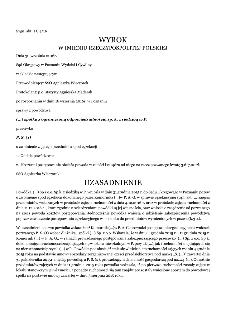Sygn. akt: I C 4/16 WYROK W IMIENIU RZECZYPOSPOLITEJ POLSKIEJ Dnia 30 września 2016r. Sąd Okręgowy w Poznaniu Wydział I Cywilny w składzie następującym: Przewodniczący: SSO Agnieszka Wieczorek Protokolant: p.o. stażysty Agnieszka Maderak po rozpoznaniu w dniu 16 września 2016r. w Poznaniu sprawy z powództwa (...) spółka z ograniczoną odpowiedzialnością sp. k. z siedzibą w P. przeciwko P. S. (1) o zwolnienie zajętego przedmiotu spod egzekucji 1. Oddala powództwo; 2. Kosztami postępowania obciąża powoda w całości i zasądza od niego na rzecz pozwanego kwotę 3.617,00 zł. SSO Agnieszka Wieczorek UZASADNIENIE Powódka (...) Sp z o.o. Sp.k. z siedzibą w P. wniosła w dniu 31 grudnia 2015 r. do Sądu Okręgowego w Poznaniu pozew o zwolnienie spod egzekucji dokonanego przez Komornika (...)w P. A. G. w sprawie egzekucyjnej sygn. akt (...)zajęcia przedmiotów wskazanych w protokole zajęcia ruchomości z dnia 4.12.2016 r. oraz w protokole zajęcia ruchomości z dnia 11.12.2016 r. , które zgodnie z twierdzeniami powódki są jej własnością, oraz wniosła o zasądzenie od pozwanego na rzecz powoda kosztów postępowania. Jednocześnie powódka wniosła o udzielenie zabezpieczenia powództwa poprzez zawieszenie postępowania egzekucyjnego w stosunku do przedmiotów wymienionych w pozwie(k.3-4). W uzasadnieniu pozwu powódka wskazała, iż Komornik (...)w P. A. G. prowadzi postępowanie egzekucyjne na wniosek pozwanego P. S. (1) wobec dłużnika, spółki (...) Sp. z o.o. Wskazała, że w dniu 4 grudnia 2015 r. i 11 grudnia 2015 r. Komornik (...) w P. A. G., w ramach prowadzonego postępowania zabezpieczającego przeciwko (...) Sp. z o.o. Sp.k. dokonał zajęcia ruchomości znajdujących się w lokalu mieszkalnym w P. przy ul. (...), jak i ruchomości znajdujących się na nieruchomości przy ul. (...) w P.. Powódka podniosła, iż stała się właścicielem ruchomości zajętych w dniu 4 grudnia 2015 roku na podstawie umowy sprzedaży zorganizowanej części przedsiębiorstwa pod nazwą „S. (...)” zawartej dnia 31 października 2015r. między powódką, a P. S. (2), prowadzącym działalność gospodarczą pod nazwą (...). Odnośnie przedmiotów zajętych w dniu 11 grudnia 2015 roku powódka wskazała, iż po pierwsze ruchomości zostały zajęte w lokalu stanowczym jej własności, a ponadto ruchomości sią tam znajdujące zostały wniesione aportem do powodowej spółki na postawie umowy zawartej w dniu 3 sierpnia 2015 roku. Postanowieniem z dnia 24 marca 2016 r. Sąd zabezpieczył powództwo i zawiesił postępowanie egzekucyjne prowadzone przez Komornika (...)w P. A. G. z wniosku wierzyciela P. S. (1) przeciwko dłużnikom (...) Sp. z o.o. Sp.k. z siedzibą w P., sygn. akt (...)w części, w stosunku do egzekucji dotyczącej przedmiotów objętych protokołem zajęcia z dnia 4 grudnia 2015 r. w punktach 3-5,7-26 oraz protokołem zajęcia z dnia 11 grudnia 2015 r. w punktach 1-15 (k.82). Pozwany P. S. (1) w odpowiedzi na pozew wniósł o oddalenie powództwa w całości i zasądzenie od powoda na rzecz pozwanego kosztów procesu, w tym kosztów zastępstwa procesowego. W uzasadnieniu odpowiedzi na pozew pozwany wskazał, że powódka nie wywiązała się z ciążącego na niej obowiązku udowodnienia faktu, z którego wywodzi skutki prawne, iż jest właścicielem zajętych składników majątkowych. Odnośnie sprzedaży zorganizowanej części przedsiębiorstwa pozwany podniósł zarzut niedochowania formy tej czynności zgodnie z treścią art. 751 k.c. tj. brak formy pisemnej z podpisami notarialnie poświadczonymi. Pozwany podniósł, że ma również wątpliwości czy powódka zawarła umowę z dłużnikiem we wskazanej dacie, także zakwestionował dołączone do odpowiedzi na pozew kserokopie dokumentów. Powódka w załączeniu pisma z dnia 29 czerwca 2016 r. przedłożyła dokumenty w oryginałach tj. umowa najmu apartamentu (...) a z dnia 13 sierpnia 2015 r., akt notarialny(...)z dnia 3 sierpnia 2015 roku (umowa spółki komandytowej- wniesienie aportów) oraz faktury na poparcie tego, że większość wymienionych w pozwie ruchomości nigdy nie stanowiła własności spółki (...) Sp. z o.o. Sp.k. W odpowiedzi na powyższe pozwany w piśmie z dnia 8 lipca 2016 r. podtrzymał swoje stanowisko co do nieważności umowy sprzedaży zorganizowanej części przedsiębiorstwa z dnia 31 października 2015 roku a nadto odnośnie ruchomości wymienianych w umowie spółki podniósł, iż w dniu 3 sierpnia 2015 roku powodowa spółka nie mogła być podmiotem praw i obowiązków i nabywać skutecznie ruchomości, nieruchomości, przedsiębiorstwa i ich zorganizowane części bowiem nie była jeszcze wpisana do rejestru a tym samym nie posiadała osobowości prawnej i w związku z tym dlatego w §7 spółki wspólnicy zobowiązali się do przeniesienia własności składników majątkowych do spółki w terminie 14 dniu od wpisania spółki do rejestru przedsiębiorstw. Ponadto pozwany na podstawie art. 527 k.p.c. podniósł zarzut bezskuteczności czynności prawnych P. S. (2) dokonanych z pokrzywdzeniem wierzyciela P. S. (1), zarówno w zakresie umowy sprzedaży zorganizowanej części przedsiębiorstwa z dnia 31.10.2015 r. oraz umowy spółki z dnia 3 sierpnia 2015 roku. Sąd ustalił następujący stan faktyczny: P. S. (2) prowadził działalność gospodarczą pod nazwą (...) z siedzibą w P. przy ulicy (...) (NIP (...)) w ramach której prowadził "S. (...)", nadto zajmował się innymi przedsięwzięciami tj. wynajmem lokali mieszkalnych (apartamentów) oraz organizowaniem robót budowlanych np. remonty, przebudowy. Dowód: akt notarialny Rep. A (...) z dnia 03.08.2015 r. (k. 38-52), zeznania świadka P. S. (2) (k. 180-181), zeznania prezesa zarządu powodowej spółki (...) (k. 180-181). W dniu 3 sierpnia 2015 r. P. S. (2) działający w imieniu własnym i prowadzący działalność gospodarczą pod firmą (...) z siedzibą w P. oraz w imieniu i na r