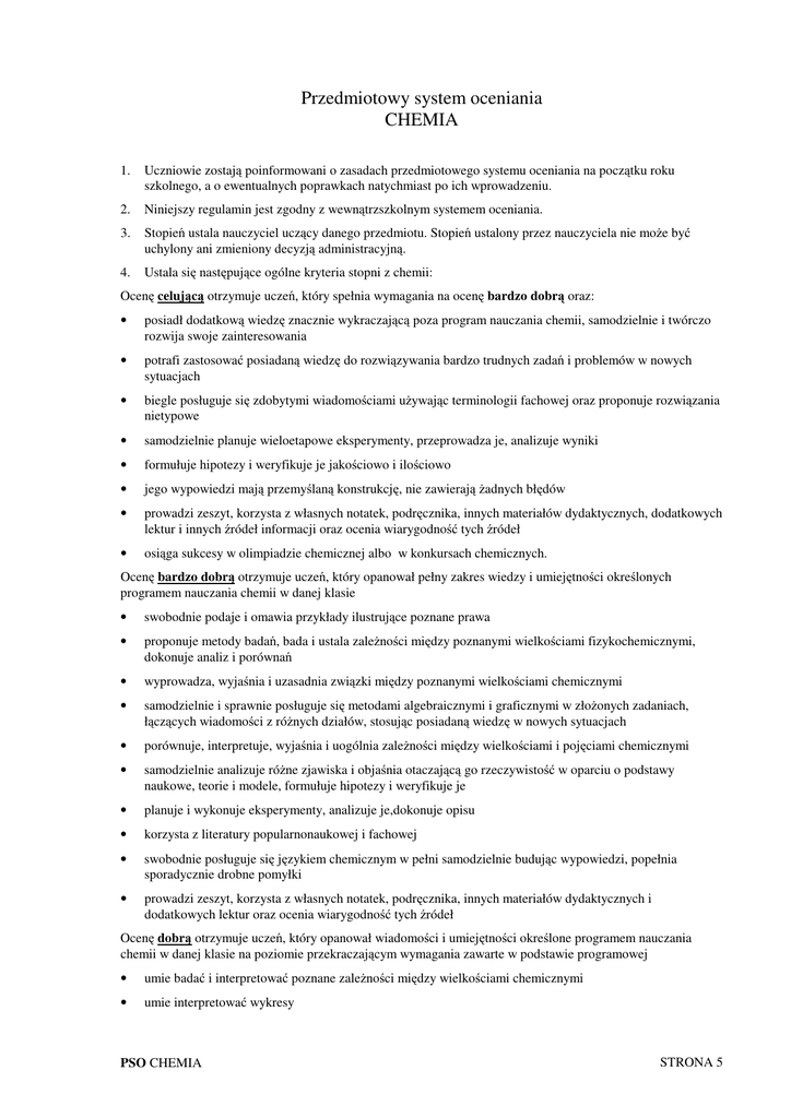 Przedmiotowy system oceniania CHEMIA 1. Uczniowie zostaj poinformowani o zasadach przedmiotowego systemu oceniania na pocz tku roku szkolnego, a o ewentualnych poprawkach natychmiast po ich wprowadzeniu. 2. Niniejszy regulamin jest zgodny z wewn trzszkolnym systemem oceniania. 3. Stopie ustala nauczyciel ucz cy danego przedmiotu. Stopie ustalony przez nauczyciela nie mo e by uchylony ani zmieniony decyzj administracyjn . 4. Ustala si nast puj ce ogólne kryteria stopni z chemii: Ocen celuj c otrzymuje ucze , który spełnia wymagania na ocen bardzo dobr oraz: • posiadł dodatkow wiedz znacznie wykraczaj c poza program nauczania chemii, samodzielnie i twórczo rozwija swoje zainteresowania • potrafi zastosowa posiadan wiedz do rozwi zywania bardzo trudnych zada i problemów w nowych sytuacjach • biegle posługuje si zdobytymi wiadomo ciami u ywaj c terminologii fachowej oraz proponuje rozwi zania nietypowe • samodzielnie planuje wieloetapowe eksperymenty, przeprowadza je, analizuje wyniki • formułuje hipotezy i weryfikuje je jako ciowo i ilo ciowo • jego wypowiedzi maj przemy lan konstrukcj , nie zawieraj • prowadzi zeszyt, korzysta z własnych notatek, podr cznika, innych materiałów dydaktycznych, dodatkowych lektur i innych ródeł informacji oraz ocenia wiarygodno tych ródeł • osi ga sukcesy w olimpiadzie chemicznej albo w konkursach chemicznych. adnych bł dów Ocen bardzo dobr otrzymuje ucze , który opanował pełny zakres wiedzy i umiej tno ci okre lonych programem nauczania chemii w danej klasie • swobodnie podaje i omawia przykłady ilustruj ce poznane prawa • proponuje metody bada , bada i ustala zale no ci mi dzy poznanymi wielko ciami fizykochemicznymi, dokonuje analiz i porówna • wyprowadza, wyja nia i uzasadnia zwi zki mi dzy poznanymi wielko ciami chemicznymi • samodzielnie i sprawnie posługuje si metodami algebraicznymi i graficznymi w zło onych zadaniach, ł cz cych wiadomo ci z ró nych działów, stosuj c posiadan wiedz w nowych sytuacjach • porównuje, interpretuje, wyja nia i uogólnia zale no ci mi dzy wielko ciami i poj ciami chemicznymi • samodzielnie analizuje ró ne zjawiska i obja nia otaczaj c go rzeczywisto naukowe, teorie i modele, formułuje hipotezy i weryfikuje je • planuje i wykonuje eksperymenty, analizuje je,dokonuje opisu • korzysta z literatury popularnonaukowej i fachowej • swobodnie posługuje si j zykiem chemicznym w pełni samodzielnie buduj c wypowiedzi, popełnia sporadycznie drobne pomyłki • prowadzi zeszyt, korzysta z własnych notatek, podr cznika, innych materiałów dydaktycznych i dodatkowych lektur oraz ocenia wiarygodno tych ródeł w oparciu o podstawy Ocen dobr otrzymuje ucze , który opanował wiadomo ci i umiej tno ci okre lone programem nauczania chemii w danej klasie na poziomie przekraczaj cym wymagania zawarte w podstawie programowej • umie bada i interpretowa poznane zale no ci mi dzy wielko ciami chemicznymi • umie interpretowa wykresy PSO CHEMIA STRONA 5 • podaje przykłady ilustruj ce poznane prawa • umie wyja ni na czym polegaj poznane zjawiska • stosuje poznane wzory i prawa samodzielnie i sprawnie posługuj c si metodami algebraicznymi w typowych sytuacjach zadaniowych • wyja nia, uzasadnia, analizuje, porównuje i interpretuje zwi zki mi dzy poznanymi wielko ciami • umie zaplanowa proste eksperymenty, dokona obserwacji i zapisywa ich wyniki • w wypowiedziach sporadycznie popełnia bł dy merytoryczne • prowadzi zeszyt, korzysta z własnych notatek, podr cznika i dodatkowych lektur Ocen dostateczn otrzymuje ucze , który opanował wiadomo ci i umiej tno ci okre lone programem nauczania chemii na poziomie nie przekraczaj cym wymaga zawartych w podstawie programowej • umie posługiwa si nomenklatur chemiczn , wzorami podstawowych zwi zków • zna poj cia i definicje podstawowych poj chemii • umie interpretowa poznane prawa chemiczne • umie odczytywa dane z tablic i prostych wykresów, podaje przykłady ilustruj ce poznane prawa • stosuje poznane wzory i prawa w prostych problemach • umie wykonywa obserwacje i opisywa je jako ciowo • umie wykonywa proste do wiadczenia według instrukcji i zapisywa ich wyniki • w wypowiedziach popełnia bł dy merytoryczne • prowadzi zeszyt, korzysta z notatek i z podr cznika i wielko ci chemicznych wyst puj cych w programie nauczania Ocen dopuszczaj c otrzymuje ucze , który ma braki w opanowaniu podstawy programowej, ale braki te nie przekre laj mo liwo ci uzyskania przez ucznia podstawowej wiedzy z chemii w ci gu dalszej nauki • rozumie pytania i polecenia • umie posługiwa si symbolicznym zapisem pierwiastków, prostych zwi zków i reakcji chemicznych • zna poj cia i definicje podstawowych poj • umie stosowa posiadane wiadomo ci do wykonywania elementarnych oblicze w bardzo prostych sytuacjach zadaniowych o niewielkim stopniu trudno ci • umie wykonywa podstawowe obserwacje prostych eksperymentów i opisywa je jako ciowo • umie wykonywa bardzo proste do wiadczenia pod kierunkiem nauczyciela • w wypowiedziach popełnia liczne bł dy merytoryczne • prowadzi zeszyt i korzysta z podr cznika i wielko ci wyst puj cych w materiale nauczania chemii Ocen niedostateczn otrzymuje ucze , który nie opanował wiadomo ci i umiej tno ci okre lonych w podstawie programowej z chemii a braki w wiadomo ciach uniemo liwiaj dalsze zdobywanie wiedzy z z tego przedmiotu • nie rozumie pyta i polece • w wypowiedziach popełnia bardzo powa ne bł dy merytoryczne • nie umie obserwowa i opisywa zjawisk • nie umie planowa i wykonywa do wiadcze i analizowa ich • nie umie interpretowa wykresów i danych • nie umie korzysta z praw i zasad chemii do wyja niania wybranych zjawisk zachodz cych w przyrodzie PSO CHEMIA STRONA 6 5. Przy ustalaniu stopnia nale y równie bra pod uwag wysiłek wkładany przez ucznia w wykonywanie obowi zków wynikaj cych ze specyfiki przedmiotu, jednak nie ma to decyduj cego znaczenia przy u