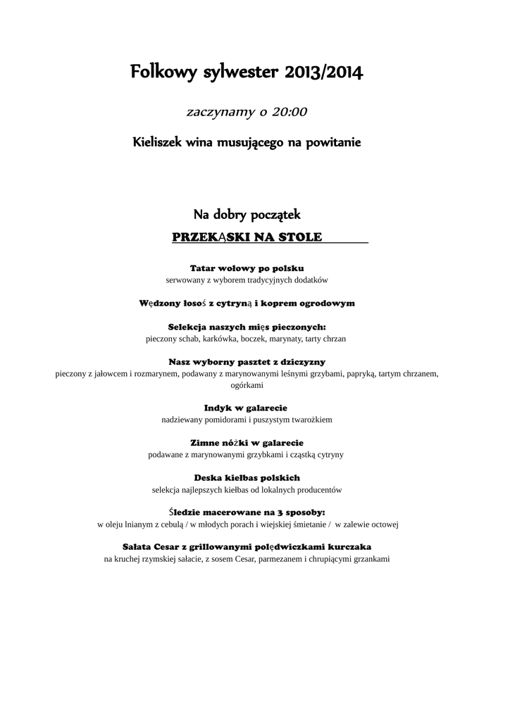 Folkowy sylwester 2013/2014 zaczynamy o 20:00 Kieliszek wina musującego na powitanie Na dobry początek PRZEKĄSKI NA STOLE Tatar wołowy po polsku serwowany z wyborem tradycyjnych dodatków Wędzony łosoś z cytryną i koprem ogrodowym Selekcja naszych mięs pieczonych: pieczony schab, karkówka, boczek, marynaty, tarty chrzan Nasz wyborny pasztet z dziczyzny pieczony z jałowcem i rozmarynem, podawany z marynowanymi leśnymi grzybami, papryką, tartym chrzanem, ogórkami Indyk w galarecie nadziewany pomidorami i puszystym twarożkiem Zimne nóżki w galarecie podawane z marynowanymi grzybkami i cząstką cytryny Deska kiełbas polskich selekcja najlepszych kiełbas od lokalnych producentów Śledzie macerowane na 3 sposoby: w oleju lnianym z cebulą / w młodych porach i wiejskiej śmietanie / w zalewie octowej Sałata Cesar z grillowanymi polędwiczkami kurczaka na kruchej rzymskiej sałacie, z sosem Cesar, parmezanem i chrupiącymi grzankami PRZED PÓŁNOCĄ: Zupa truflowa delikatny krem truflowy, z pieczonym kurczakiem i płatkami Grana Padano lub Zupa "3 grzyby" aromatyczny wywar z grzybów leśnych (borowiki, podgrzybki, kurki) z makaronem własnego wyrobu Polędwiczki wieprzowe w sosie miodowo-musztardowym, z ziemniakami z wody i sałatką ogrodową z mieszanych warzyw sezonowych Sum Mazurski na świeżym szpinaku blanszowanym z czosnkiem, z sosem z białej cebuli i zielonego pieprzu, z ryżem Nowy Rok powitamy kieliszkiem szampana Po północy zaś podamy: Żur gospodziany z jajem i białą kiełbasą warzony na prawdziwkach i wiejskiej wędzonce, doprawiany tartym chrzanem i majerankiem Zrazy z polędwicy wołowej zawijane z boczkiem i grzybami leśnymi, poddawane z kaszą gryczaną Grillowany filet z kurczaka nadziewany szpinakiem i serem feta, z ziemniakami zasmażanymi z majerankiem i sałatką ogrodową z mieszanych warzyw sezonowych Pierogi przeróżne, ręcznie lepione z mięsem, z kapustą i grzybami, ruskie Bigos staropolski ze śliwką i boczkiem Bufet deserowy wybór deserów z naszej cukierni WHISKY and TEQUILLA BAR Johnnie Walker Red Label Sierra Silver Sierra Gold OPEN BAR Wódka czysta Soplica Wino czerwone Sangiovese Del Rubicone Wino białe Trebbiano Del Rubicone Piwo Żywiec Piwo Warka Coca-Cola, Fanta, Sprite Soki owocowe (pomarańcz, grapefruit, czarna porzeczka) Kawa, herbata Najlepsze przeboje lat ubiegłych oraz współczesne hity. Po północy liczne zabawy i konkursy- atrakcyjne nagrody. Biesiada do białego rana! Rano dla wytrwałych Noworoczne śniadanie Jajecznica ze świeżym szczypiorkiem, wiejskim chlebem i masłem naszego wyrobu