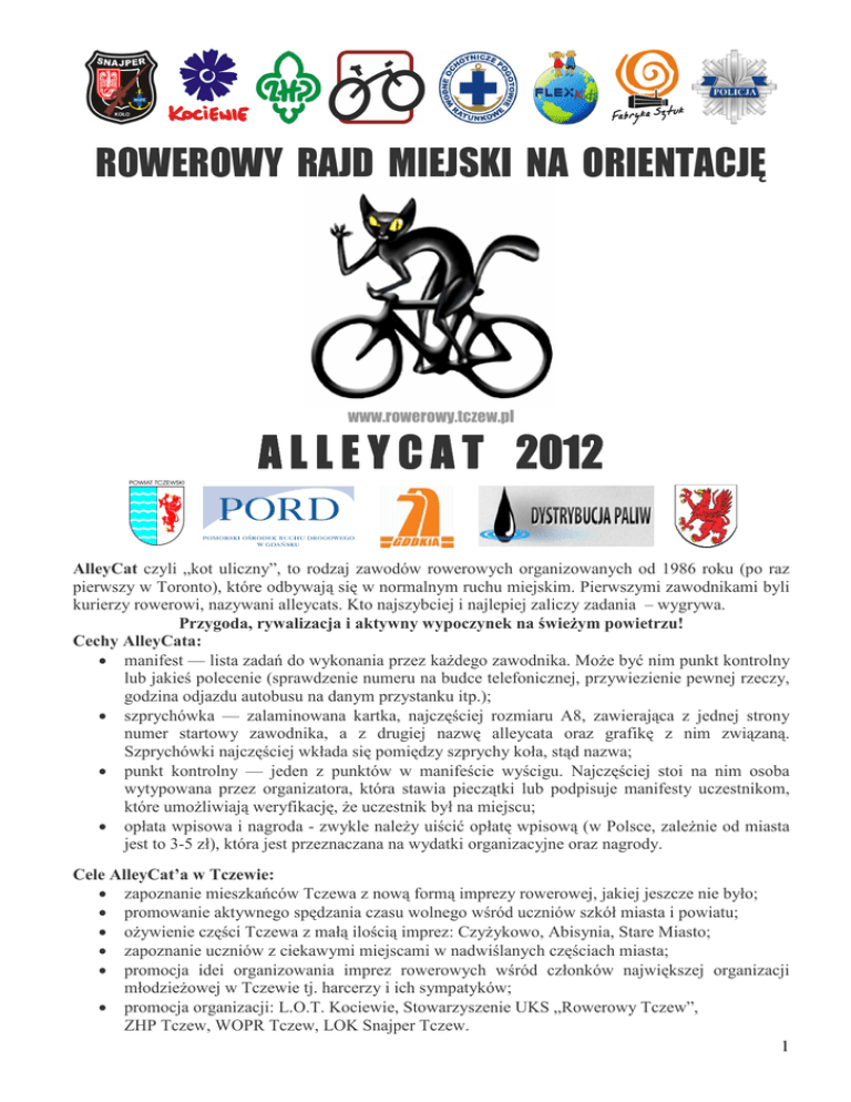 ROWEROWY RAJD MIEJSKI NA ORIENTACJĘ www.rowerowy.tczew.pl A L L E Y C A T 2012 AlleyCat czyli „kot uliczny”, to rodzaj zawodów rowerowych organizowanych od 1986 roku (po raz pierwszy w Toronto), które odbywają się w normalnym ruchu miejskim. Pierwszymi zawodnikami byli kurierzy rowerowi, nazywani alleycats. Kto najszybciej i najlepiej zaliczy zadania – wygrywa. Przygoda, rywalizacja i aktywny wypoczynek na świeŜym powietrzu! Cechy AlleyCata: • manifest — lista zadań do wykonania przez kaŜdego zawodnika. MoŜe być nim punkt kontrolny lub jakieś polecenie (sprawdzenie numeru na budce telefonicznej, przywiezienie pewnej rzeczy, godzina odjazdu autobusu na danym przystanku itp.); • szprychówka — zalaminowana kartka, najczęściej rozmiaru A8, zawierająca z jednej strony numer startowy zawodnika, a z drugiej nazwę alleycata oraz grafikę z nim związaną. Szprychówki najczęściej wkłada się pomiędzy szprychy koła, stąd nazwa; • punkt kontrolny — jeden z punktów w manifeście wyścigu. Najczęściej stoi na nim osoba wytypowana przez organizatora, która stawia pieczątki lub podpisuje manifesty uczestnikom, które umoŜliwiają weryfikację, Ŝe uczestnik był na miejscu; • opłata wpisowa i nagroda - zwykle naleŜy uiścić opłatę wpisową (w Polsce, zaleŜnie od miasta jest to 3-5 zł), która jest przeznaczana na wydatki organizacyjne oraz nagrody. Cele AlleyCat’a w Tczewie: • zapoznanie mieszkańców Tczewa z nową formą imprezy rowerowej, jakiej jeszcze nie było; • promowanie aktywnego spędzania czasu wolnego wśród uczniów szkół miasta i powiatu; • oŜywienie części Tczewa z małą ilością imprez: CzyŜykowo, Abisynia, Stare Miasto; • zapoznanie uczniów z ciekawymi miejscami w nadwiślanych częściach miasta; • promocja idei organizowania imprez rowerowych wśród członków największej organizacji młodzieŜowej w Tczewie tj. harcerzy i ich sympatyków; • promocja organizacji: L.O.T. Kociewie, Stowarzyszenie UKS „Rowerowy Tczew”, ZHP Tczew, WOPR Tczew, LOK Snajper Tczew. 1 Zasady rozgrywania miejskiego rajdu na orientację w Tczewie: Uczestnicy w wieku od 7 do 100 lat PRZED STARTEM otrzymają od organizatora PLAN MIASTA i okolic z naniesionymi Punktami Kontrolnymi (PK) oraz MANIFEST czyli kartę startową, opisującą sposób potwierdzenia bytności na PK, które będą umieszczane w miejscach atrakcyjnych, waŜnych i wartych poznania przez dzieci, młodzieŜ i dorosłych: a) miejsca i obiekty historyczne oraz związane z kulturą tczewską i tradycją kociewską; b) miejsca związane z edukacją przyrodniczą oraz krajobrazową; c) miejsca związane z harcerstwem, młodzieŜowe obiekty sportowe; d) siedziby duŜych miejskich firm (elektronika, szpitalnictwo, gaz, prąd, woda, ścieki itp.); e) miejsca niespodzianki. PK będą umieszczane blisko ścieŜek rowerowych oraz na ulicach o małym natęŜeniu ruchu aut, z wykorzystaniem pomników, tablic informacyjnych, turystycznych, pamiątkowych itp. 1. ORGANIZATORZY - ilość punktów kontrolnych, specjalizacja i atrakcje (kolejność alfabetyczna): Flextronics International Poland - 1 - firma elektroniczna; Klub Strzelecki LOK „Snajper Tczew” - 1 - obronność kraju; Lokalna Organizacja Turystyczna „Kociewie”- 2 - krajoznawstwo kociewskie, turystyka; MłodzieŜowa Rada Miasta Tczewa - 1 - młodzieŜ w Tczewie; Stowarzyszenie UKS „Rowerowy Tczew” - 2 - bezpieczeństwo ruchu drogowego (główny organizator) WOPR Tczew - 1 - bezpieczeństwo nad wodą; ZHP Komenda Hufca w Tczewie - 2 - historia Tczewa; 2. RANGA IMPREZY - zasięg powiatowy. 3. PARTNERZY - Urząd Miasta Tczewa; Starostwo Powiatowe w Tczewie; Flextronics International Poland, "DYSTRYBUCJA PALIW" Sp. z o.o. (Czatkowy), Generalna Dyrekcja Dróg Krajowych i Autostrad – Gdańsk, Pomorski Ośrodek Ruchu Drogowego w Gdańsku, Tczewskie Centrum Sportu i Rekreacji. 4. TERMIN I MIEJSCE: a) termin - sobota, 21 kwietnia 2012, godzina 11.00; b) start - Przystań pasaŜersko – Ŝeglarska, skrzyŜowanie ulic Wodnej / Nad Wisłą c) obszar rywalizacji - Abisynia, Stare Miasto, CzyŜykowo, Knybawa; d) kolejność odwiedzania PK - dowolna; e) długość trasy - zaleŜnie od indywidualnie wybranej kolejności odwiedzania PK 5. WARUNKI UCZESTNICTWA: a) udział w imprezie odbywa się na własną odpowiedzialność, co uczestnicy potwierdzają własnoręcznym podpisem przed startem; b) w imprezie mogą wziąć udział jedynie osoby zdrowe, bez przeciwwskazań do uprawiania sportu; c) impreza odbędzie się bez względu na warunki pogodowe; d) osoby w wieku 16 i 17 lat startują w imprezie za pisemną zgodą rodziców, indywidualnie lub zespołowo; e) osoby niepełnoletnie w wieku od 13 do 15 lat mogą wziąć udział w imprezie pod opieką osób pełnoletnich, tj. które mają ukończony 18 rok Ŝycia, za pisemną zgodą rodziców; przy czym osoby w wieku 14 i 15 lat mogą wystartować, jeśli będą członkami zespołów w swojej kategorii wiekowej (w tym wypadku nie ma wymogu pełnoletniego opiekuna); f) osoby małoletnie w wieku 7-12 lat startują tylko pod opieką prawnego opiekuna tj. rodzica (ów); g) wymagany jest rower wyposaŜony zgodnie z przepisami prawa o ruchu drogowym; h) moŜna startować w zespołach do czterech osób, przy czym kaŜdy zawodnik zapisuje się osobno, podając nazwę teamu. Numery startowe przydzielane będą indywidualnie. Klasyfikacja będzie indywidualna, z moŜliwością miejsc ex aequo (np. dla członków teamów); i) w czasie imprezy uczestników obowiązuje zakaz spoŜywania alkoholu, palenia papierosów, a takŜe zakaz rozmawiania przez telefon w czasie jazdy rowerem oraz jazdy „bez trzymanki” (tj. puszczania kierownicy). 6. ZGŁOSZENIA (imię, nazwisko, adres, wiek, telefon, e-mail, szkoła) + WPISOWE: a) bezpłatnie tylko przed imprezą, zgłaszając w/w dane osobowe od 13go do 20go kwietnia 2012 r: MAILEM: [email protected], TELEFONICZNIE / SMS 504 453 864 oraz 8