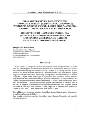 S ł u p s k i e P r a c e B i o l o g i c z n e 9 • 2012 CHARAKTERYSTYKA BIOMETRYCZNA ANODONTA ANATINA (L.) (BIVALVIA, UNIONIDAE) W STREFIE ODDZIAŁYWANIA LĄDU I MORZA JEZIORA GARDNO – PRÓBA OCENY STANU POPULACJI BIOMETRICS OF ANODONTA ANATINA (L.) (BIVALVIA, UNIONIDAE) INHABITING LAND AND MARINE ZONE IN LAKE GARDNO – ATTEMPT CONDITION ASSESSMENT Małgorzata Bochyńska Akademia Pomorska w Słupsku Instytut Biologii i Ochrony Środowiska Zakład Ekologii Wód ul. Arciszewskiego 22b, 76-200 Słupsk [email protected] ABSTRACT Lake Gardno is a large and shallow estuarine lake with a high influence of water from the land (Łupawa river) and from the Baltic Sea. Research on Anodonta anatina was conducted in spring and summer 2011 on a sample of 318 living mussels. A. anatina was the most abundant species of Unionidae in this lake and showed a great range of biometric characters, depending, among others, on different types of bottom sediments. Length, width and height of individuals was examined and all relationships based on these characters indicate positive correlations. A. anatina from Lake Gardno showed distinct shell forms compared to A. anatina from other Polish lacustrine environments. This may result from greater concentration of chloride ions in this lake. Compared to biometrical date obtained in the same lake 25 years earlier, a decline in shell size was recorded. Mean length of A. anatina shell from Lake Gardno in 2011 was 71 mm, whereas in 1986 it was 75 mm. Słowa kluczowe: Anodonta anatina, Unionidae, jezioro Gardno, cechy biometryczne małży, preferencje siedliskowe Key words: Anodonta anatina, Unionidae, Lake Gardno, biometrics of mussels, habitat preferences 57 WSTĘP Jezioro Gardno jest zbiornikiem przymorskim, podlegającym wypływom zarówno lądu, jak i morza. Przepływa przez nie rzeka Łupawa, która od strony wschodniej wnosi znaczne ilości wody słodkiej oraz mułu, co przyczynia się do wypłycania zbiornika. W północno-zachodniej części jeziora Łupawa łączy je z morzem, przez co w czasie cofki następuje wlew wód słonych do zbiornika. W związku z tym jezioro odznacza się dużą zmiennością warunków hydrologicznych – znacznymi wahaniami poziomu wody oraz fizykochemicznych: poziomu zasolenia, temperatury, stężenia tlenu czy zawartości materii organicznej (Jezioro... 2003). Wszystkie te czynniki mają duży wpływ na rozmieszczenie małży i różne aspekty ich biologii. Ponadto Gardno charakteryzuje się wysokim poziomem trofii i klasyfikowane jest jako hipertroficzne (Wielgat-Rychert, Rychert 2008). Jezioro to objęte jest ochroną (leży na terenie Słowińskiego Parku Narodowego), a pomimo to narażone na postępującą degradację głównie ze względu na bezpośrednie sąsiedztwo miejscowości: Rowy, Gardna Wielka i Gardna Mała, z których ścieki były odprowadzane wprost do niego (Burchardt 2004). Ze względu na specyfikę i dużą dynamikę procesów zachodzących w tym jeziorze stało się ono obiektem szeroko zakrojonych badań naukowych, w tym także prowadzonych na małżach (Dyduch, Falniowski 1979, Orzechowski 2002). Tak różne warunki występujące w poszczególnych częściach jeziora mogą bowiem mieć wpływ na określone cechy morfologiczne muszli tych zwierząt (Orzechowski 2002). We wcześniejszych badaniach stwierdzono występowanie sześciu gatunków małży z rodziny Unionidae: Unio pictorum, U. tumidus, U. crassus, Anodonta anatina, A. cygnea oraz A. complanata (Dyduch, Falniowski 1979, Orzechowski 2002), przy czym A. anatina był uważany za dominanta wśród wszystkich Unionidae w tym jeziorze. Ten właśnie gatunek stał się przedmiotem badań w 2011 roku. A. anatina, czyli szczeżuja pospolita, jest słodkowodnym małżem szeroko rozpowszechnionym w całej Polsce, występuje w wodach stojących i wolno płynących. Preferuje podłoża piaszczyste strefy litoralu do 2 m głębokości, ryjąc w dnie, podobnie jak pozostałe małże występujące w Polsce (Piechocki, Dyduch-Falniowska 1993). Postępująca eutrofizacja, zamulenie i zanieczyszczenie wód jeziora Gardno stanowią przesłanki twierdzenia o zagrożeniu tego gatunku (Ożgo 2010). Pierwsze symptomy negatywnych skutków przemian środowisk wodnych przejawiają się karleniem osobników małży, redukcją liczebności ich populacji, a w konsekwencji całkowitym ich wymarciem (Piechocki, Dyduch-Falniowska 1993). Celem pracy było określenie cech biometrycznych populacji A. anatina występujących w różnych strefach oddziaływania lądu i morza jeziora Gardno, z podaniem zakresu i wartości średnich takich wymiarów liniowych muszli, jak długość, szerokość i wysokość wraz z określeniem współzmienności tych cech. Celem oceny stanu populacji małży A. anatina dokonano porównania otrzymanych wyników badań z danymi uzyskanymi 25 lat temu. TEREN, MATERIAŁ I METODY BADAŃ Gardno jest drugim co do wielkości jeziorem przymorskim w Polsce, o powierzchni około 24 km2, głębokości średniej 1,3 i maksymalnej 2,6 m. Znaczna część 58 linii brzegowej (około 80%) porośnięta jest roślinnością wynurzoną, głównie szuwarem trzcinowym. Prawie cała niecka pokryta jest osadami, a największa ich miąższość występuje w południowo-wschodniej i południowo-zachodniej części jeziora i tylko niewielka powierzchnia dna w północno-wschodniej części ma twarde piaszczyste podłoże (Dyduch, Falniowski 1979, Trojanowski 2003). Stan czystości wód Gardna określono jako pozaklasowy na podstawie poziomu BZT5, azotu i fosforu oraz widzialności w zakresie 0,4 m (Burchardt 2004). Osady denne w tym jeziorze cechuje znaczna konsumpcja tlenu, stanowiąca 20-54% zsumowanej respiracji toni wodnej i dna (Rychert, Wielgat-Rychert 2008), a głównym ich składnikiem jest materia organiczna i krzemiany (Trojanowski 2003). Uwzględniając wpływ wód lądowych i morskich, można jezioro podzielić na trzy części. Części południowa i południowo-ws