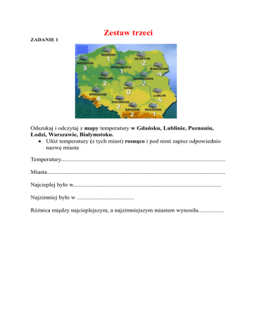 Zestaw trzeci ZADANIE 1 Odszukaj i odczytaj z mapy temperatury w Gdańsku, Lublinie, Poznaniu, Łodzi, Warszawie, Białymstoku. Ułóż temperatury (z tych miast) rosnąco i pod nimi zapisz odpowiednio nazwę miasta Temperatury............................................................................................................. Miasta...................................................................................................................... Najcieplej było w.................................................................................................. Najzimniej było w ...................................... Różnica między najcieplejszym, a najzimniejszym miastem wynosiła................. ZADANIE 2 Temperatura powietrza w nocy spada do - 4o C. Jeżeli w dzień wzrośnie o 9o C, to osiągnie……………………. Zaznacz na termometrach temperatury zgodnie z poleceniami: W nocy temperatura wynosiła 15 0 mrozu. Rano podniosła się o 5 stopni. W południe było najcieplej, termometry pokazywały 4o C. Wieczorem temperatura spadła o 9 0C. Noc Rano Południe Wieczór ZADANIE 3 Odszukaj w tabeli trzy dni 1 marca, 8 marca, 15 marca Pon: Wtó: Śro: Czw: Pią: 09. 10. 11. Sob: Nie: 1Wschód słońca: 06:28 Zachód słońca: 17:24 2Wschód 3Wschód 4Wschód 5Wschód 6Wschód 7Wschód 8Wschód słońca: słońca: słońca: słońca: słońca: słońca: słońca: 06:26 06:24 06:22 06:20 06:18 06:16 06:14 Zachód Zachód Zachód Zachód Zachód Zachód Zachód słońca: słońca: słońca: słońca: słońca: słońca: słońca: 17:26 17:27 17:29 17:31 17:32 17:34 17:35 9Wschód 10Wschód 11Wschód 12Wschód 13Wschód 14Wschód 15Wschód słońca: słońca: słońca: słońca: słońca: słońca: słońca: 06:12 06:10 06:08 06:06 06:04 06:02 05:59 Zachód Zachód Zachód Zachód Zachód Zachód Zachód słońca: słońca: słońca: słońca: słońca: słońca: słońca: 17:37 17:38 17:40 17:41 17:43 17:44 17:46 Odczytaj oraz zaznacz na zegarach wschód i zachód słońca w tych dniach. Oblicz, jak długo będzie trwał dzień. 1 marca wschód 1.03 Długość dnia wynosi:................................................................................. zachód 1.03 8 marca wschód 8.03 zachód 8.03 Długość dnia 8 marca :................................................................................. 15 marca wschód 15.03 zachód 15. 03 Długość dnia 15 marca.:................................................................................... Na podstawie zegarów oblicz i uzupełnij zdania: Najdłuższy dzień będzie(którego?)................................. Najdłuższa noc będzie......................... Najkrótszy dzień będzie (którego) ..................................... Najkrótsza noc będzie...................... Ile wynosi różnica między nadłuższym, a najkrótszym dniem...............................