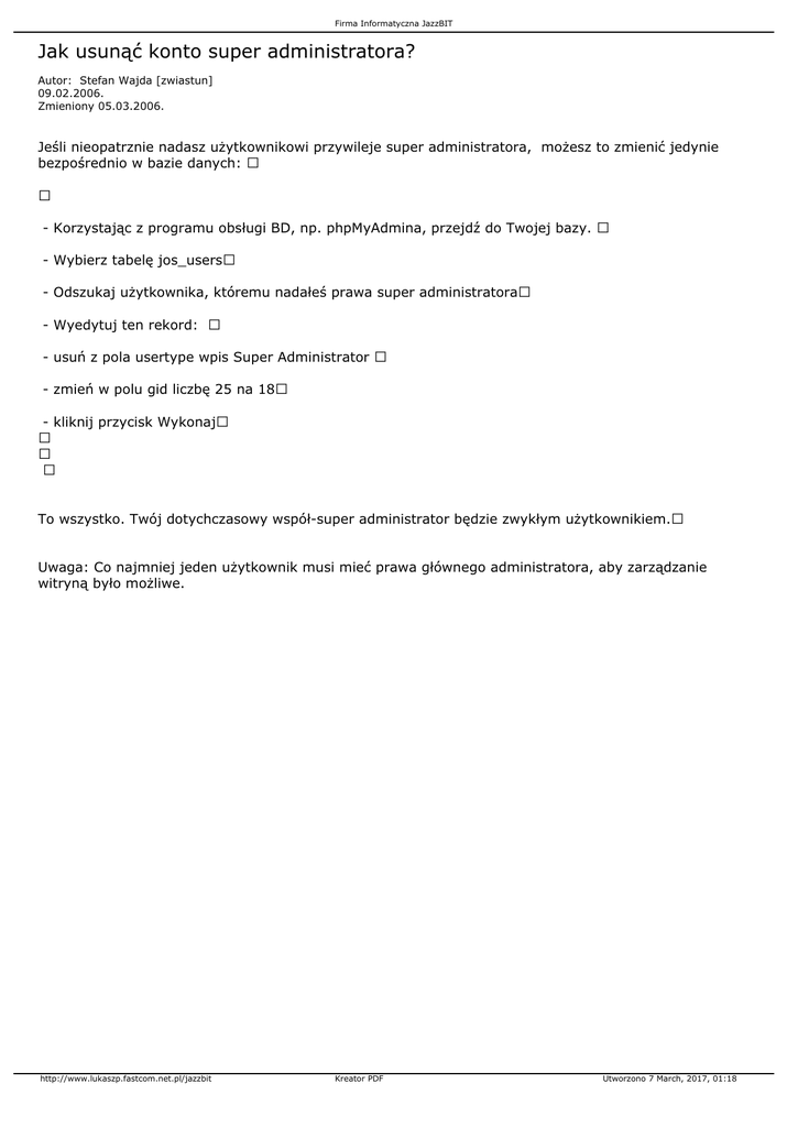 Firma Informatyczna JazzBIT Jak usunąć konto super administratora? Autor: Stefan Wajda [zwiastun] 09.02.2006. Zmieniony 05.03.2006. Jeśli nieopatrznie nadasz użytkownikowi przywileje super administratora, możesz to zmienić jedynie bezpośrednio w bazie danych: - Korzystając z programu obsługi BD, np. phpMyAdmina, przejdź do Twojej bazy. - Wybierz tabelę jos_users - Odszukaj użytkownika, któremu nadałeś prawa super administratora - Wyedytuj ten rekord: - usuń z pola usertype wpis Super Administrator - zmień w polu gid liczbę 25 na 18 - kliknij przycisk Wykonaj To wszystko. Twój dotychczasowy współ-super administrator będzie zwykłym użytkownikiem. Uwaga: Co najmniej jeden użytkownik musi mieć prawa głównego administratora, aby zarządzanie witryną było możliwe. http://www.lukaszp.fastcom.net.pl/jazzbit Kreator PDF Utworzono 7 March, 2017, 01:18