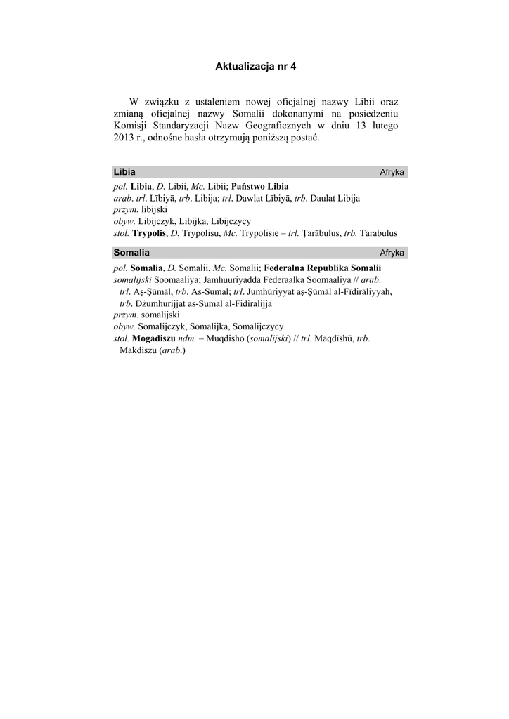 Aktualizacja nr 4 W związku z ustaleniem nowej oficjalnej nazwy Libii oraz zmianą oficjalnej nazwy Somalii dokonanymi na posiedzeniu Komisji Standaryzacji Nazw Geograficznych w dniu 13 lutego 2013 r., odnośne hasła otrzymują poniższą postać. Libia Afryka pol. Libia, D. Libii, Mc. Libii; Państwo Libia arab. trl. Lībiyā, trb. Libija; trl. Dawlat Lībiyā, trb. Daulat Libija przym. libijski obyw. Libijczyk, Libijka, Libijczycy stol. Trypolis, D. Trypolisu, Mc. Trypolisie – trl. Ţarābulus, trb. Tarabulus Somalia Afryka pol. Somalia, D. Somalii, Mc. Somalii; Federalna Republika Somalii somalijski Soomaaliya; Jamhuuriyadda Federaalka Soomaaliya // arab. trl. Aş-Şūmāl, trb. As-Sumal; trl. Jumhūriyyat aş-Şūmāl al-Fīdirāliyyah, trb. Dżumhurijjat as-Sumal al-Fidiralijja przym. somalijski obyw. Somalijczyk, Somalijka, Somalijczycy stol. Mogadiszu ndm. – Muqdisho (somalijski) // trl. Maqdīshū, trb. Makdiszu (arab.)