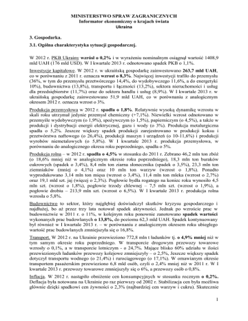 MINISTERSTWO SPRAW ZAGRANICZNYCH Informator ekonomiczny o krajach świata Ukraina 3. Gospodarka. 3.1. Ogólna charakterystyka sytuacji gospodarczej. W 2012 r. PKB Ukrainy wzrósł o 0,2% i w wyrażeniu nominalnym osiągnął wartość 1408,9 mld UAH (176 mld USD). W I kwartale 2013 r. odnotowano spadek PKB o 1,1%. Inwestycje kapitałowe. W 2012 r. w ukraińską gospodarkę zainwestowano 263,7 mld UAH, co w porównaniu z 2011 r. oznacza wzrost o 8,3%. Najwięcej inwestycji trafiło do przemysłu (36%, w tym do przemysłu przetwórczego 14,4%, do wydobywczego 11,6%, a do energetyki 10%), budownictwa (13,8%), transportu i łączności (13,2%), sektora nieruchomości i usług dla przedsiębiorstw (11,7%) oraz do sektora handlu i usług (8,9%). W I kwartale 2013 r. w ukraińską gospodarkę zainwestowano 51,9 mld UAH, co w porównaniu z analogicznym okresem 2012 r. oznacza wzrost o 3%. Produkcja przemysłowa w 2012 r. spadła o 1,8%. Relatywnie wysoką dynamikę wzrostu w skali roku utrzymał jedynie przemysł chemiczny (+7,1%). Niewielki wzrost odnotowano w przemyśle wydobywczym (o 1,9%), spożywczym (o 1,5%), papierniczym (o 4,5%), a także w produkcji i dystrybucji energii elektrycznej, gazu i wody (o 3%). Produkcja metalurgiczna spadła o 5,2%. Jeszcze większy spadek produkcji zarejestrowano w produkcji koksu i przetwórstwa naftowego (o 26,4%), produkcji maszyn i urządzeń (o 10-11,6%) i produkcji wyrobów niemetalowych (o 5,8%). W I kwartale 2013 r. produkcja przemysłowa, w porównaniu do analogicznego okresu roku poprzedniego, spadła o 5%. Produkcja rolna – w 2012 r. spadła o 4,5% w stosunku do 2011 r. Zebrano 46,2 mln ton zbóż (o 18,6% mniej niż w analogicznym okresie roku poprzedniego), 18,3 mln ton buraków cukrowych (spadek o 3,4%), 8,4 mln ton ziarna słonecznika (spadek o 3,5%), 23,3 mln ton ziemniaków (mniej o 4,1%) oraz 10 mln ton warzyw (wzrost o 1,8%). Ponadto wyprodukowano 3,14 mln ton mięsa (wzrost o 3,4%), 11,4 mln ton mleka (wzrost o 2,7%) oraz 19,1 mld szt. jaj (więcej o 2,3%). Pogłowie bydła rogatego na koniec roku wynosiło 4,5 mln szt. (wzrost o 1,8%), pogłowie trzody chlewnej – 7,5 mln szt. (wzrost o 1,9%), a pogłowie drobiu – 213,9 mln szt. (wzrost o 6,5%). W I kwartale 2013 r. produkcja rolna wzrosła o 5,8%. Budownictwo to sektor, który najgłębiej doświadczył skutków kryzysu gospodarczego i najdłużej, bo aż przez trzy lata notował spadek aktywności. Jednak po wzroście prac w budownictwie w 2011 r. o 11%, w kolejnym roku ponownie zanotowano spadek wartości wykonanych prac budowlanych o 13,8%, do poziomu 62,3 mld UAH. Spadek kontynuowany był również w I kwartale 2013 r. – w porównaniu z analogicznym okresem roku ubiegłego wartość prac budowlanych zmniejszyła się o 16,8%. Transport. W 2012 r. na Ukrainie przewieziono 772,8 mln t ładunków tj. o 4,9% mniej niż w tym samym okresie roku poprzedniego. W transporcie drogowym przewozy towarowe wzrosły o 0,1%, a w transporcie lotniczym - o 24,7%. Mające blisko 60% udziału w ilości przewiezionych ładunków przewozy kolejowe zmniejszyły – o 2,5%, Jeszcze większy spadek dotyczył transportu wodnego (o 21,4%) i rurociągowego (o 17,1%). W omawianym okresie transportem pasażerskim przewieziono 6,8 mld osób, czyli o 2,4% mniej niż w 2011 r. W I kwartale 2013 r. przewozy towarowe zmniejszyły się o 6%, a przewozy osób o 0,8%. Inflacja. W 2012 r. nastąpiło obniżenie cen konsumpcyjnych w stosunku rocznym o 0,2%. Deflacja była notowana na Ukrainie po raz pierwszy od 2002 r. Stabilizacja cen była możliwa głównie dzięki spadkowi cen żywności o 2,3% (najbardziej cen warzyw i cukru). Skutecznie 1 MINISTERSTWO SPRAW ZAGRANICZNYCH Informator ekonomiczny o krajach świata Ukraina zniwelowało to wzrost cen alkoholu i tytoniu (o 7%), opłat komunalnych (głównie dostawy wody i kanalizacja – wzrost o 6-6,5%) oraz cen paliw (o 6,9%). Ceny produkcji przemysłowej (PPI) wzrosły w 2012 r. o 0,3%. Na koniec maja 2013 r. spadek cen w stosunku rocznym wynosił 0,4%. Handel wewnętrzny. Obroty przedsiębiorstw zajmujących się handlem hurtowym w 2012 r. wyniosły 1065,5 mld UAH i były niższe o 4,4% w porównaniu z rokiem poprzednim. W I kwartale 2013 r. obroty w handlu hurtowym zmniejszyły się o 5,4%. Obroty handlu detalicznego w 2012 r. wyniosły 804,3 mld UAH, co oznacza wzrost o 15,9% w stosunku do 2011 r. W I kwartale 2013 r. wzrost w handlu detalicznym wyniósł 13,4%. Handel zagraniczny. W 2012 r. ukraiński eksport towarowy osiągnął wartość 68,8 mld USD, co oznacza jego wzrost w porównaniu z tym samym okresem roku 2011 o 0,6%. Import wzrósł o 2,5% i osiągnął wartość 84,7 mld USD. Ujemne saldo w handlu towarami wyniosło 15,85 mld USD (w roku poprzednim deficyt wynosił 14,2 mld USD). Udział krajów WNP w ukraińskim eksporcie towarowym w omawianym okresie wyniósł 36,8%, państw azjatyckich 25,7%, a państw UE – 24,8%. Spośród głównych partnerów handlowych Ukrainy najbardziej w omawianym okresie wzrósł eksport do Egiptu (+117%), Kazachstanu (+32,4%) i Białorusi (+17,1%); zmniejszył się eksport do Włoch (o 18,4%), Rosji (o 11%), Polski (o 7,8%) i Turcji (o 1,7%). Największy udział w ukraińskim eksporcie miały: Rosja (25,6%), Turcja (5,4%), Egipt (4,2%), Polska (3,7%), Włochy (3,6%), Kazachstan (3,6%) oraz Indie (3,3%). Największy udział w strukturze towarowej eksportu miały wyroby metalurgiczne (27,5%), artykuły rolno-spożywcze (26%), produkty mineralne (11,1%), maszyny i urządzenia (10,2%), artykuły przemysłu chemicznego, w tym tworzywa sztuczne (8,9%) i środki transportu (8,7%). Po stronie importu na Ukrainę udział państw WNP wynosił 40,7%, państw UE 30,9%, a państw azjatyckich 20,2%. Najbardziej, wśród głównych partnerów handlowych Ukrainy, zwiększył się import z Chin (o 26%), Białorusi (o 20,3%), USA (o 12,1%), z Polski (o 12,1%) i Włoch (o 11,4%). Dostawy z Rosji zmniejszyły się o 5,9%. Kraj ten nada