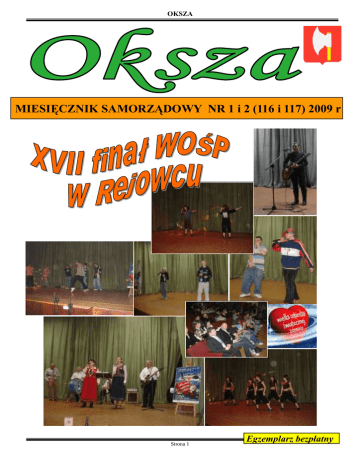 OKSZA MIESIĘCZNIK SAMORZĄDOWY NR 1 i 2 (116 i 117) 2009 r Strona 1 Egzemplarz bezpłatny OKSZA Zespół „Driada” ze Szkoły Podstawowej w Rejowcu III miejsce— Szkoła Podstawowa w Zawadówce Integracyjne Warsztaty Plastyczne Strona 2 OKSZA winny wzrosnąć na początku każ- i prowadzenie półkoloni dego roku kalendarzowego. - zmieniająca uchwałę w sprawie Wieloletniego Planu InwestycyjGmina ma budżet Od 27 nego Gminy na lata 2007-2013, na 2009 r. stycznia 2009 do dostosowując ja do zmienionych 26 stycznia 2010 Budżet Gminy na 2009 r. wymogów obowiązują nowe stawki za 1m³ został przyjęty przez Rade gminy - w sprawie określenia górnych wody – 2,23 zł + VAT co daje jednogłośnie. Wcześniej analizostawek opłat ponoszonych przez 2,39 zł i 1m³ odprowadzanych wany był szczegółowo na posiewłaścicieli nieruchomości za ścieków 3,32 zł + VAT co daje dzeniach Komisji Rady Szczegóusługi w zakresie odbierania od3,55zł. Konieczność wprowadze- ły dotyczące budżetu Gminy padów komunalnych oraz opróżnia przez Radę Gminy zmienio- w artykule na stronie 4 i 5. niania zbiorników bezodpływonych stawek wynika z kalkulacji, wych i transportu nieczystości szczegóły której znajdują się arstałych Rada podjęła uchwały tykule na stronie 6. - w sprawie programu współpra- - w sprawie wyrażenia zgody na Diety w dół cy gminy z organizacjami poza- zawarcie kolejnych umów dzierBiorąc pod uwagę fakt, że rządowymi oraz podmiotami, co żawy nieruchomości stanowiąkryzys gospodarczy obejmujący pozwoli na upowszechnienie kul- cych własność gminy na okres trzech lat. kraj ujemnie rzutuje na budżet tury fizycznej i sportu- sekcji gmin, Rada podjęła uchwałę na sportowych w piłce nożnej, lekmocy której obniżyła z dniem kiej atletyce; 1 stycznia 2009 r. wysokość diet - wspieranie i dofinansowanie Janina Danielczuk radnych. Pozostaną one na tym obozów sportowych, organizację samym poziomie do końca kaimprez rekreacyjno-sportowych dencji, mimo że ustawowo po- Nowe stawki za wodę w drodze wywłaszczenia. Działki do zamiany zajmują powierzchnię 0,6369 ha. Tereny, dla których właściciele regulują stan prawny, to 0,5206 ha, natomiast grunty o nieuregulowanym Dobiega końca nabywa- stanie prawnym zajmują obszar nie gruntów pod budowę zbiorni- 1,1050 ha – zostaną one nabyte ka małej retencji w Rejowcu. w drodze wywłaszczenia. Grunty stanowiące własność Następnym etapem bęGminy obejmują obszar 17,7606 dzie zlecenie opracowania dokuha, w tym 2,2715 ha nabyte mentacji projektowej zbiornika. Do chwili obecnej wykonane zostały badanie geologiczne i dokumentacja geologiczno-hydrologiczna terenu. Opracowano również koncepcję zbiornika wodnego. Będzie on zajmował powierzchnię 14,0 ha lustra wody, przy średnim głębokości napełnienia 1,5 m. szar znajdujący się w granicach administracyjnych Gminy i przedstawiony jest w postaci: ustaleń planu (stanowiących treść w/ w uchwały) i rysunku planu . Przedmiotem ustaleń planu jest Rada Gminy w Rejowcu przeznaczenie terenów wraz z uchwała nr XXII/111/04 z dnia liniami rozgraniczającymi te tere17.10.2004 r. uchwaliła miejsco- ny, warunki zabudowy i zagospowy plan zagospodarowania prze- darowania terenów i obiektów strzennego Gminy Rejowiec. podlegających ochronie, Miejscowy plan zagospodarowa- zasady obsługi w zakresie infrania przestrzennego obejmuje ob- struktury technicznej. Zabudowę poszczególnych miejscowości stanowi głównie zabudowa zagrodowa i usługi. Jedynie w miejscowościach: Rejowiec, Zawadówka, Hruszów występuje zabudowa wielorodzinna, jednorodzinna, zagrodowa i usługi. Tereny pod zabudowę występują, w każdej miejscowości przy drogach 100 m w głąb działki. Informacja o zbiorniku małej retencji w Rejowcu Strona 3 Alicja Semeniuk ciąg dalszy artykułu na następnej stronie OKSZA Obowiązki gminy w zakresie budownictwa ograniczają się do wydawania wypisów i wyrysów z miejscowego planu zagospodarowania przestrzennego gminy Rejowiec, dotyczące warunków zabudowy działki i do celów notarialnych. W celu otrzymania wypisu i wyrysu z działki należy wypełnić stosowny wniosek podając jednocześnie numery działek i obręb geodezyjny miejscowości. Do wniosku należy dołączyć kopię mapy zasadniczej. Pozwolenia na budowę i zgłoszenia wydaje Starostwo Powiatowe w Chełmie. Teresa-Anna Kula §1 Określa się dochody budżetu gminy w kwocie 18 426 977 zł (osiemnaście milionów czterysta dwadzieścia sześć tysięcy dziewięćset siedemdziesiąt siedem złotych), z tego dochody bieżące 15 395 977 zł (piętnaście milionów trzysta dziewięćdziesiąt pięć tysięcy dziewięćset siedemdziesiąt siedem złotych) i dochody majątkowe 3 0 31 000 zł (trzy miliony trzydzieści jeden tysięcy złotych): - dotacje celowe na realizację zadań z zakresu administracji rządowej i innych zadań zleconych gminie ustawami w kwocie 2 425 468 zł (dwa miliony czterysta dwadzieścia pięć tysięcy czterysta sześćdziesiąt osiem złotych) - dochody z tytułu wydawania zezwoleń na sprzedaż napojów alkoholowych, w kwocie 53 000zł (pięćdziesiąt trzy tysiące) - określa się dotacje celowe na realizację zadań przyjętych od innych j.s.t. w drodze umowy lub porozumienia w kwocie 18 792 zł (osiemnaście tysięcy siedemset dziewięćdziesiąt dwa złote) §2 Określa się wydatki budżetu gminy w kwocie 18 092 669 zł (osiemnaście milionów dziewięćdziesiąt dwa tysiące sześćset sześćdziesiąt dziewięć), z tego wydatki bieżące 14 200 088 zł (czternaście milionów dwieście tysięcy osiemdziesiąt osiem) i wydatki majątkowe 3 892 581 zł (trzy miliony osiemset dziewięćdziesiąt dwa tysiące pięćset osiemdziesiąt jeden) w tym: - wydatki na zadania w zakresie administracji rządowej i inne zadania zlecone gminie ustawami w kwocie 2 425 468 zł (dwa miliony czterysta dwadzieścia pięć tysięcy czterysta sześćdziesi