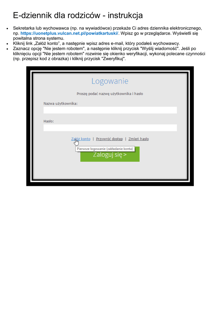 E-dziennik dla rodziców - instrukcja Sekretarka lub wychowawca (np. na wywiadówce) przekaże Ci adres dziennika elektronicznego, np. https://uonetplus.vulcan.net.pl/powiatkartuski/. Wpisz go w przeglądarce. Wyświetli się powitalna strona systemu. Kliknij link „Załóż konto”, a następnie wpisz adres e-mail, który podałeś wychowawcy. Zaznacz opcję "Nie jestem robotem", a następnie kliknij przycisk "Wyślij wiadomość". Jeśli po kliknięciu opcji "Nie jestem robotem" rozwinie się okienko weryfikacji, wykonaj polecane czynności (np. przepisz kod z obrazka) i kliknij przycisk "Zweryfikuj". Zapoznaj się z treścią komunikatu wyświetlonego na stronie "Podsumowanie operacji". Sprawdź skrzynkę swojej poczty elektronicznej. Przeczytaj wiadomość i kliknij link podany w treści, aby nadać hasło. W oknie "Aktywacja konta" w polach "Nowe hasło" oraz "Powtórz nowe hasło" wprowadź swoje hasło, stosując się do podpowiadanych wymagań. Zaznacz opcję "Nie jestem robotem" i kliknij przycisk "Ustaw nowe hasło". Od tego momentu możesz logować się do systemu, korzystając z adresu e-mail i ustalonego przez siebie hasła.