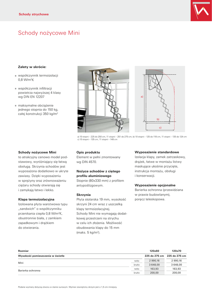 Schody strychowe Schody nożycowe Mini Zalety w skrócie: współczynnik termoizolacji 0,8 W/m2K współczynnik infiltracji powietrza najwyższej 4 klasy wg DIN EN 12207 a) maksymalne obciążenie jednego stopnia do 150 kg, całej konstrukcji 350 kg/m2 b) c) a) 10 stopni – 225 do 250 cm, 11 stopni – 251 do 275 cm, b) 10 stopni – 125 do 118 cm, 11 stopni – 135 do 124 cm c) 10 stopni – 135 cm, 11 stopni – 148 cm Schody nożycowe Mini to atrakcyjny cenowo model podstawowy, wyróżniający się łatwą obsługą. Skrzynia schodów jest wyposażona dodatkowo w ukryte zawiasy. Dzięki wyposażeniu w sprężyny oraz zrównoważeniu ciężaru schody otwierają się i zamykają łatwo i lekko. Klapa termoizolacyjna Izolowana płyta warstwowa typu „sandwich” o współczynniku przenikania ciepła 0,8 W/m2K, obustronnie biała, z zamkiem zapadkowym i drążkiem do otwierania. Opis produktu Element w pełni zmontowany wg DIN 4570. Nożyce schodów z ciętego profilu aluminiowego Stopnie (80x330 mm) z profilem antypoślizgowym. Skrzynia Płyta stolarska 19 mm, wysokość skrzyni 24 cm wraz z uszczelką klapy termoizolacyjnej. Schody Mini nie wymagają dodatkowej przestrzeni na strychu w celu ich złożenia. Możliwość obudowania klapy do 15 mm (maks. 5 kg/m2). Wyposażenie standardowe Izolacja klapy, zamek zatrzaskowy, drążek, łatwe w montażu listwy maskujące ukośnie przycięte, instrukcja montażu, obsługi i konserwacji. Wyposażenie opcjonalne Barierka ochronna (przewidziana w prawie budowlanym), poręcz teleskopowa. Rozmiar Wysokość pomieszczenia w świetle Mini Barierka ochronna Podane wymiary dotyczą otworu w stanie surowym. Wymiar zewnętrzny skrzyni jest o 1,5 cm mniejszy. 120x60 120x70 225 do 275 cm 225 do 275 cm netto 2 990,16 2 990,16 brutto 3 648,00 3 648,00 netto 163,93 163,93 brutto 200,00 200,00 Schody Strychowe Roto Frank Okna Dachowe Sp. z o.o. ul. Lubelska 104 21-100 Lubartów tel. 081 855 05 22, 24, 25 fax 081 855 05 28 [email protected] www.roto.pl Markowe produkty Roto oferują swoim klientom najwyższą jakość niemieckiej technologii. Nasze okna dachowe, schody strychowe, systemy solarne i akcesoria produkowane są z najlepszych materiałów, dzięki czemu na długie lata zapewniają bezawaryjne użytkowanie i estetyczny wygląd. Autoryzowany Partner Roto Sunroof Chętnie odpowiemy na Państwa pytania. Numer Infolinii Roto: 0801 011 470* * (0,24 PLN/min.) www.roto.pl Zawdzięczamy to surowym normom w procesie produkcyjnym i wnikliwej kontroli jakości już gotowych produktów. Sprzedaż i montaż markowych produktów Roto powierzamy wyłącznie profesjonalistom, zgodnie z zasadą: „profesjonalny producent, profesjonalny dystrybutor, profesjonalny dekarz”. Schody strychowe Roto Schody strychowe Funkcjonalność i innowacja dzięki 70-letniemu doświadczeniu Zasada Roto: Więcej swobody. Więcej komfortu. Schody strychowe Schody Escamod WD-RC Zalety w skrócie: wykonanie zgodnie z DIN 4570 współczynnik termoizolacji 1,30 W/m2K c) maksymalne obciążenie do 150 kg a) d) element gotowy do wbudowania b) a) od 220 do 288 cm, b) od 137 do 88 cm, c) od 162 do 153 cm, d) od 22,5° do 16,5° Seryjna termoizolacja Trzyczęściowe schody strychowe Escamod WD-RC są wyposażone w termoizolacyjną klapę typu „sandwich“. Klapa termoizolacyjna Zbudowana z płyty warstwowej o grubości 26 mm i o współczynniku przenikania ciepła 1,30 W/m2K. Dolna część w kolorze białym, górna w kolorze brązowym. Zamknięcie: uchwyt zaciskowy. Schody z drewna świerkowego Stopnie (82x340 mm) z profilem antypoślizgowym, belki policzkowe (28x84 mm). Skrzynia Drewno świerkowe, wysokość skrzyni 12 cm; uszczelnienie klapy. Możliwość obudowania klapy do 16 mm (maks. 6 kg/m2). Wyposażenie standardowe Drążek do otwierania, instrukcja montażu, obsługi i konserwacji. Wyposażenie opcjonalne Barierka zabezpieczająca wejście na strych (przewidziana w prawie budowlanym), poręcz bezpieczeństwa. Rozmiar Wysokość pomieszczenia w świetle Escamod WD-RC Barierka ochronna Poręcz dodatkowa Podane wymiary dotyczą otworu w stanie surowym. Wymiar zewnętrzny skrzyni jest o 2 cm mniejszy. 120x60 120x70 220 do 288 cm 220 do 288 cm netto 395,08 395,08 brutto 482,00 482,00 netto 163,93 163,93 brutto 200,00 200,00 netto 40,98 40,98 brutto 50,00 50,00 Schody strychowe Schody Esca ISO-RC Zalety w skrócie: współczynnik termoizolacji 0,85 W/m2K współczynnik infiltracji powietrza najwyższej 4 klasy c) a) maksymalne obciążenie do 150 kg d) element gotowy do wbudowania b) a) od 220 do 286 cm, b) od 131 do 87 cm, c) od 161 do 152 cm, d) od 21° do 16° Trzyczęściowe składane schody drewniane Roto Esca ISO-RC posiadają izolowaną, warstwową i szczelną klapę termoizolacyjną o współczynniku infiltracji powietrza w 4 najwyższej klasie wg DIN 12207. Klapa termoizolacyjna Obustronnie biała płyta warstwowa typu „sandwich” (36 mm) o współczynniku przenikania ciepła: 0,85 W/m2K i współczynniku infiltracji powietrza w 4 najwyższej klasie wg DIN 12207. Zamek zapadkowy zwiększający bezpieczeństwo w standardzie. Schody z drewna świerkowego Stopnie (82x340 mm) z profilem antypoślizgowym, belki policzkowe (28x84 mm). Skrzynia Drewno świerkowe 18 mm; wysokość skrzyni 14 cm; uszczelnienie klapy; schody 3-częściowe składane nie wymagają dodatkowej przestrzeni na strychu w celu ich złożenia. Po zamknięciu klapy wszystkie części schodów mieszczą się w obrysie skrzyni. Możliwość obudowania klapy do 16 mm (maks. 8 kg/m2). Wyposażenie standardowe Poręcz przymocowana do schodów po prawej stronie, drążek, stopki drabiny (nasadki ochronne), łatwe w montażu listwy maskujące, instrukcja montażu, obsługi i konserwacji. Wyposażenie opcjonalne Barierka zabezpieczająca wejście na strych (przewidziana w prawie budowlanym), poręcz bezpieczeństwa. Najwyższa jakość Rozmiar Wysokość pomieszczenia w świetle Esca ISO-RC Barierka ochronna Poręcz d