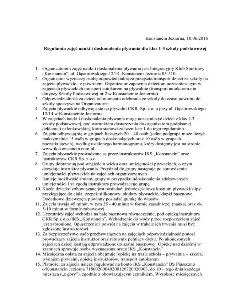 Konstancin Jeziorna, 10.06.2016 Regulamin zajęć nauki i doskonalenia pływania dla klas 1-3 szkoły podstawowej 1. Organizatorem zajęć nauki i doskonalenia pływania jest Integracyjny Klub Sportowy „Konstancin”, ul. Gąsiorowskiego 12/14, Konstancin Jeziorna 05-510. 2. Organizator wyznaczy osobę odpowiedzialną za przejście/transport dzieci ze szkoły na zajęcia pływackie i z powrotem. Organizator zapewnia dzieciom uczestniczącym w zajęciach pływackich transport autokarem na pływalnię (transport autokarem nie dotyczy Szkoły Podstawowej nr 2 w Konstancinie Jeziornie) 3. Odpowiedzialność za dzieci od momentu odebrania ze szkoły do czasu powrotu do szkoły spoczywa na Organizatorze. 4. Zajęcia pływackie odbywają się na pływalni CKR Sp. z o. o przy ul. Gąsiorowskiego 12/14 w Konstancinie Jeziornie. 5. W zajęciach nauki i doskonalenia pływania mogą uczestniczyć dzieci z klas 1-3 szkoły podstawowej, pod warunkiem dostarczenia do organizatora podpisanej deklaracji członkowskiej, która stanowi załącznik nr 1 do tego regulaminu. 6. Zajęcia odbywają się w grupach liczących 20 – 40 osób (jedna podgrupa może liczyć maksymalnie 15 osób w grupach doskonalących oraz 10 osób w grupach początkujących), według ustalonego harmonogramu, który dostępny jest na stronie www.ikskonstancin.com.pl 7. Zajęcia pływackie prowadzone są przez instruktorów IKS „Konstancin” oraz instruktorów CKR Sp. z o.o. 8. Grupy dobrane są pod względem wieku oraz umiejętności pływackich, o czym decyduje instruktor pływania. Przydział do grupy następuje po sprawdzeniu umiejętności pływackich na zajęciach organizacyjnych. 9. Istnieje możliwość zmiany grupy w przypadku udoskonalenia zdobywanych umiejętności i za zgodą instruktora prowadzącego grupę. 10. Każde dziecko zobowiązane jest posiadać: jednoczęściowy kostium pływacki/slipy przylegające do ciała, czepek silikonowy, okulary pływackie, klapki basenowe. Dodatkowo dziewczęta powinny posiadać gumkę do włosów. 11. Zajęcia trwają 45 minut, w tym 35 - 40 minut w formie zasadniczej (nauka) oraz ok. 5-10 minut w formie zabawowej. 12. Uczestnicy zajęć wchodzą na halę basenową równocześnie, pod opieką instruktora CKR Sp z o.o./IKS „Konstancin”. Wchodzenie do wody przed rozpoczęciem zajęć jest zabronione. Opuszczenie i powrót na zajęcia w trakcie ich trwania musi być zgłoszone instruktorowi. 13. Za bezpieczeństwo osób przebywających na zajęciach odpowiedzialność ponosi prowadzący zajęcia instruktor oraz ratownik pełniący dyżur. Po ukończonych zajęciach dzieci zostają odprowadzone do szatni basenowej. Opiekę nad dziećmi w szatniach sprawuje osoba wyznaczona przez IKS „Konstancin” 14. Miesięczna opłata za zajęcia obejmuje: opiekę na trasie szkoła – pływalnia – szkoła, wynajem pływalni, opiekę instruktorów, transport autokarem 15. Płatności za zajęcia należy regulować na konto IKS „Konstancin” BS Piaseczno o/Konstancin Jeziorna 71800200040200126720020003, do 10 – tego dnia każdego miesiąca („z góry”), zgodnie z obowiązującym cennikiem. Wysokość miesięcznych opłat reguluje uchwała IKS „Konstancin” i jest dostępna na stronie www.ikskonstancin.com.pl 16. Nie przewiduje się zwolnień z opłat w przypadku nieobecności dziecka na zajęciach, bez względu na powód nieobecności. Nie ma także możliwości odrobienia zajęć z inną grupą. 17. Zaleganie z wpłatami za zajęcia skutkuje wezwaniem do zapłaty drogą mailową. W przypadku braku płatności w ciągu 7 dni od wezwania, organizator ma prawo nie dopuścić dziecka do uczestnictwa w zajęciach. 18. Rodzice zobowiązani są kontrolować stan zdrowia dziecka korzystającego z zajęć nauki i doskonalenia pływania. W przypadku wystąpienia przeciwwskazań do uczestnictwa w zajęciach, Rodzice zobowiązani są poinformować organizatora na piśmie w trybie natychmiastowym 19. Każdy uczestnik zajęć zobowiązany jest przestrzegać Regulaminu Pływalni CKR oraz Regulaminu zajęć nauki i doskonalenia pływania dla klas 1-3 szkoły podstawowej. 20. W przypadku rezygnacji z zajęć, Rodzic zobowiązany jest poinformować organizatora na piśmie lub mailem ([email protected]). Zwolnienie z płatności następuje od kolejnego pełnego okresu rozliczeniowego (tj rezygnacja w marcu skutkuje zwolnieniem z płatności od kwietnia) 21. Inne sprawy reguluje Statut IKS Konstancin oraz Regulamin sekcji pływackiej IKS Konstancin.