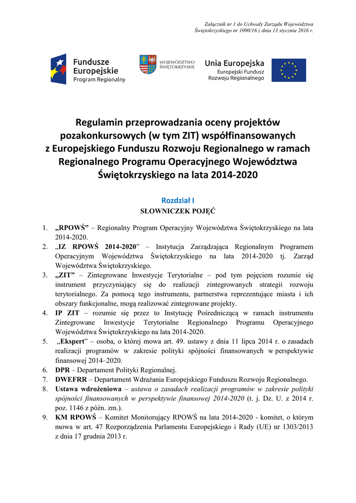 Załącznik nr 1 do Uchwały Zarządu Województwa Świętokrzyskiego nr 1090/16 z dnia 13 stycznia 2016 r. Regulamin przeprowadzania oceny projektów pozakonkursowych (w tym ZIT) współfinansowanych z Europejskiego Funduszu Rozwoju Regionalnego w ramach Regionalnego Programu Operacyjnego Województwa Świętokrzyskiego na lata 2014-2020 Rozdział I SŁOWNICZEK POJĘĆ 1. 2. 3. 4. 5. 6. 7. 8. 9. „RPOWŚ” – Regionalny Program Operacyjny Województwa Świętokrzyskiego na lata 2014-2020. „IZ RPOWŚ 2014-2020” – Instytucja Zarządzająca Regionalnym Programem Operacyjnym Województwa Świętokrzyskiego na lata 2014-2020 tj. Zarząd Województwa Świętokrzyskiego. „ZIT” – Zintegrowane Inwestycje Terytorialne – pod tym pojęciem rozumie się instrument przyczyniający się do realizacji zintegrowanych strategii rozwoju terytorialnego. Za pomocą tego instrumentu, partnerstwa reprezentujące miasta i ich obszary funkcjonalne, mogą realizować zintegrowane projekty. IP ZIT – rozumie się przez to Instytucję Pośredniczącą w ramach instrumentu Zintegrowane Inwestycje Terytorialne Regionalnego Programu Operacyjnego Województwa Świętokrzyskiego na lata 2014-2020. „Ekspert” – osoba, o której mowa art. 49. ustawy z dnia 11 lipca 2014 r. o zasadach realizacji programów w zakresie polityki spójności finansowanych w perspektywie finansowej 2014–2020. DPR – Departament Polityki Regionalnej. DWEFRR – Departament Wdrażania Europejskiego Funduszu Rozwoju Regionalnego. Ustawa wdrożeniowa – ustawa o zasadach realizacji programów w zakresie polityki spójności finansowanych w perspektywie finansowej 2014-2020 (t. j. Dz. U. z 2014 r. poz. 1146 z późn. zm.). KM RPOWŚ – Komitet Monitorujący RPOWŚ na lata 2014-2020 - komitet, o którym mowa w art. 47 Rozporządzenia Parlamentu Europejskiego i Rady (UE) nr 1303/2013 z dnia 17 grudnia 2013 r. Rozdział II POSTANOWIENIA OGÓLNE 1. Regulamin określa zasady oceny projektów pozakonkursowych (w tym ZIT) RPOWŚ 2014-2020. Regulamin sporządzono w oparciu o zapisy Instrukcji Wykonawczej Instytucji Zarządzającej oraz Instytucji Certyfikującej Regionalny Program Operacyjny Województwa Świętokrzyskiego na lata 2014 – 2020, Porozumienie w sprawie powierzenia zadań Instytucji Pośredniczącej w ramach instrumentu Zintegrowane Inwestycje Terytorialne Regionalnego Programu Operacyjnego Województwa Świętokrzyskiego na lata 2014-2020 zawartego w dniu 29 czerwca 2015 r. oraz zapisy Wytycznych w zakresie trybów wyboru projektów na lata 2014-2020 wydanych przez Ministra Infrastruktury i Rozwoju (zwane dalej Wytycznymi). Rozdział III ZASADA POUFNOŚCI I BEZSTRONNOŚCI 1. Osoby uczestniczące w procesie oceny projektów pozakonkursowych (w tym ZIT), przed przystąpieniem do prac, zobowiązane są do podpisania deklaracji poufności stanowiącej załącznik nr 1 do niniejszego Regulaminu. 2. Osoby dokonujące oceny projektów, będące pracownikami IZ RPOWŚ 2014-2020/IP ZIT, przed przystąpieniem do oceny projektu, są zobowiązane do podpisania oświadczenia o bezstronności w odniesieniu do każdego ocenianego przez siebie projektu, wg wzoru stanowiącego załącznik nr 2. Nie podpisanie ww. oświadczenia przez pracownika pozbawia go możliwości oceny danego projektu. Ocena projektów opracowywanych i składanych w ramach jednej instytucji (projekty własne) odbywa się z zachowaniem rozdzielności funkcjonalnej zadań, tj. projekt pozakonkursowy nie może być opracowywany i oceniany przez pracowników mających tego samego bezpośredniego przełożonego (podrozdział 8.3 pkt 4 Wytycznych). 3. W przypadku ekspertów uczestniczących w ocenie projektów deklaracja poufności i oświadczenie o bezstronności podpisywane są na wzorze stanowiącym załącznik nr 3 do niniejszego Regulaminu. Nie podpisanie ww. dokumentów przez eksperta pozbawia go możliwości oceny danego projektu. Rozdział IV WERYFIKACJA FORMALNA I OCENA FORMALNA 1. Przed przystąpieniem do oceny formalnej pracownicy Oddziału Wdrażania Projektów dokonują weryfikacji wymogów formalnych w oparciu o Kartę weryfikacji wymogów formalnych wniosku o dofinansowanie realizacji projektu w ramach osi priorytetowych 1-7 Regionalnego Programu Operacyjnego Województwa Świętokrzyskiego na lata 2014-2020 na zasadzie „dwóch par oczu”. 2. W przypadku stwierdzenia niedopełnienia przez Beneficjenta wymogów formalnych, pracownicy Oddziału Wdrażania Projektów wzywają Beneficjenta do uzupełnienia braków formalnych w terminie nie krótszym niż 7 dni kalendarzowych pod rygorem pozostawienia wniosku bez rozpatrzenia. 3. Projekty, które pozytywnie przeszły weryfikację wymogów formalnych podlegają ocenie formalnej. Ocena dokonywana jest przez pracowników Oddziału Wdrażania Projektów zgodnie z kryteriami formalnymi zatwierdzonymi przez KM RPOWŚ po wcześniejszym podpisaniu przez oceniających Deklaracji poufności i Oświadczenia o bezstronności. 4. Weryfikacja wymogów formalnych oraz ocena formalna prowadzona jest w terminie nie dłuższym niż 60 dni roboczych. W uzasadnionych przypadkach termin ten może zostać wydłużony. Decyzję o przedłużeniu terminu oceny formalnej podejmuje Marszałek Województwa/Członek Zarządu nadzorujący pracę DW EFRR. Informacja o przedłużeniu terminu oceny formalnej zamieszczana jest na stronie internetowej www.rpo-świętokrzyskie.pl oraz Portalu Funduszy Europejskich. 5. Ocena formalna wniosków dokonywana jest zgodnie z zasadą „dwóch par oczu” na karcie oceny formalnej wraz z podaniem terminu dokonania oceny i nadaniem odpowiedniego statusu wniosku. Po dokonaniu oceny pracownicy podpisują się pod kartą oceny formalnej. W zależności od wyników dokonanej oceny formalnej i nadanego statusu podejmowana jest decyzja o: przekazaniu wniosku do oceny merytorycznej (w przypadku gdy wniosek spełnia wszystkie kryteria formalne), odrzuceniu wniosku ze względu na negatywną ocenę formal