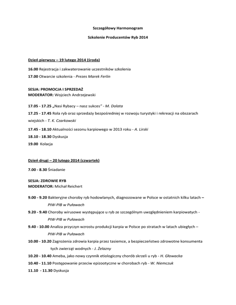 Szczegółowy Harmonogram Szkolenie Producentów Ryb 2014
