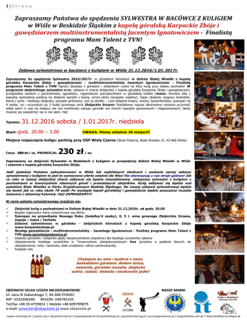 1|Strona Zapraszamy Państwa do spędzenia SYLWESTRA W BACÓWCE Z KULIGIEM w Wiśle w Beskidzie Śląskim z kapelą góralską Karpackie Zbóje i gawędziarzem multiinstrumentalistą Jacentym Ignatowiczem - Finalistą programu Mam Talent z TVN! Zabawa sylwestrowa w bacówce z kuligiem w Wiśle 31.12.2016/1.01.2017r. Zapraszamy do spędzenia Sylwestra 2016/2017r. w góralskich klimatach w dolinie Białej Wisełki z kapelą góralską Karpackie Zbóje i gawędziarzem - multiinstrumentalistą Jacentym Ignatowiczem - Finalistą programu Mam Talent z TVN! Oprócz biesiady z góralami i zbójnikami czeka na Was kulig przy blasku pochodni! W programie zbójnickiego sylwestra m.in. zabawa w chacie zbójeckiej z kapelą góralską Karpackie Zbóje i gawędziarzem, przejażdżka saniami z pochodniami, ogniskiem, regionalnym poczęstunkiem w góralskiej kolibie (menu: świńska kita z kapustą zasmażaną podaną na zbójecki sposób z kaszą, zimna płyta (swojskie wędliny), bigos zbójecki, bogracz beskidzki, dania z grilla - kiełbasa zbójecka, oscypek grilowany, coś na słodko – czyli zbójecki kołacz, owoce, kawa/herbata, szampan na 4 osoby, no i oczywiście po 2 kubki grzanego wina Zbójeckie Grzane! Dodatkowe napoje alkoholowe możecie przynieść sobie sami! U nas na miejscu nie ma możliwości zakupu gorzałki ani innych napojów gazowanych i niegazowanych, także musicie się zaopatrzyć się w nie sami. Hej! Termin: Start: 31.12.2016 sobota / 1.01.2017r. niedziela godz. 20.00 – 3.00 UWAGA: Mamy ostatnie 30 miejsc!!! Miejsce rozpoczęcia kuligu: parking przy OSP Wisły Czarne (Straż Pożarna, Biała Wisełka 22, 43-460 Wisła) Cena: 285 zł / os. PROMOCJA: 230 zł / os. Zapraszamy na zbójnicki Sylwester w Beskidach z kuligiem w przepięknej dolinie Białej Wisełki w Wiśle i zabawie z kapelą góralską Karpackie Zbóje. Jeśli jesteście Państwo zakwaterowani w Wiśle lub najbliższych okolicach i szukacie samej zabawy sylwestrowej z kuligiem to jest to wymarzona oferta właśnie dla Was! Nie obowiązują u nas stroje galowe! Jak co roku w naszej zbójeckiej chacie odbywać się będzie nieszablonowy, nietypowy sylwester z kuligiem z pochodniami w towarzystwie rdzennych górali i prawdziwych zbójników. Kulig odbywać się będzie nad potokiem Biała Wisełka w Parku Krajobrazowym Beskidu Śląskiego. Na naszej zabawie sylwestrowej będzie się bawić jak co roku około 70 osób! Po występie kapeli góralskiej i gawędziarza będzie puszczana muzyka taneczna z aktywnej kolumny. Hej! ZAPRASZAMY!!! W cenie pakietu sylwestrowego znajduje się: Zbójnicki kulig z pochodniami w Dolinie Białej Wisełki w dniu 31.12.2016r. od godz. 20.00 Bogate regionalne menu sylwestrowe wg oferty Szampan na przywitanie Nowego Roku (butelka/4 osoby), 0, 5 l. wina grzanego Zbójnickie Grzane, napoje – kawa / herbata Zabawa sylwestrowa w góralsko - zbójnickich klimatach z kapelą góralską Karpackie Zbóje www.karpackiezboje.pl Występ gawędziarza - multiinstrumentalisty - Jacentego Ignatowicza - finalisty programu Mam Talent z TVN www.jacentyignatowicz.pl Gadżety góralskie i zbójeckie glejty bezpieczeństwa (dyplomy) dla każdego uczestnika zabawy Ubezpieczenie każdego uczestnika w Towarzystwie ubezpieczeniowym Axa (prosimy o podanie danych do ubezpieczenia: imię i nazwisko, data urodzenia i adres zamieszkania); Podatek Vat; Chybojcie ku nom i bydźcie s nami, beskidzkimi góralami. Bedom tańce, swawole, góralska muzyka, zbójecka watra, radość, śleboda i smakowite jadło! ZBÓJNICKI SZLAK LESZEK MŁODZIANOWSKI Ul. Jana III Sobieskiego 7, 34-300 ŻYWIEC NIP: 5532306340 REGON: 240745145 Tel/fax +48 33 4759652 | Mobile +48 609789879 e-mail: [email protected] www.zbojnickie.pl NASZE MARKI zywiec.turystyka.pl | zywiec.org | zbojnickitravel.pl | karpackigazda.pl |karpackiezboje.pl | goralskicatering.pl | jacentyignatowicz.pl | kuligi.beskidy.com.pl | zbojnickisklep.na.allegro.pl 2|Strona Rezerwacja i kontakt do organizatora zbójnickiej zabawy sylwestrowej z kuligiem w Wiśle tel. +48 606 786 213, 33 475 96 52, e-mail: [email protected] Opis miejsca kuligu sylwestrowego: Dolina Białej Wisełki to jedna z najbardziej malowniczych dolin w Beskidzie Śląskim i najpiękniejsza dolina w Wiśle. Płynie tędy jeden ze źródłowych potoków Wisły, Biała Wisełka, która wypływa na północnym stoku Baraniej Góry, na wysokości ok. 1080 m. n.p.m., w swym środkowym odcinku tworząc szereg wodospadów i progów skalnych, zwanych Kaskadami Rodła. Trasa kuligu znajduje się na terenie Baraniogórskiego Rezerwatu Przyrody. To miejsce dla wielbicieli przyrody i zwierząt. Przy odrobinie szczęścia można tu spotkać jelenia, głuszca, sarnę czy rysia. W potoku, wzdłuż trasy kuligu pływa pstrąg potokowy i pluska się pluszcz. Dolina porośnięta jest między innymi pomnikowymi świerkami i jodłami. Doliną Białej Wisełki biegnie szlak turystyczny, zamknięty dla ruchu samochodowego. Dzięki temu nie usłyszymy tutaj dźwięku silnika samochodowego. Spacery i przejażdżki ułatwia utwardzona nawierzchnia. Jest to miejsce położone na Szlaku Zbójników Karpackich www.zbojnickiszlak.pl Opis miejsca biesiady sylwestrowej: Nasza zbójnicka koliba położona jest w dolinie Białej Wisełki w Wiśle-Czarne. Wokół znajduje się mała polanka w sam raz do zabawy. Karczma stanowi zamknięte, drewniane pomieszczenie z paleniskami. Dookoła ogniska znajdują się ławy i stoły, przy których można wygodnie usiąść. Czas pobytu w chacie góralskiej jest dostosowany do oczekiwań grupy. Podczas ogniska / grilla będzie przygrywać kapela góralska Karpackie Zbóje. W środku naszej zbójeckiej chaty panuje iście swojski, góralski klimat. Wnętrza są bardzo przytulne. W noc Sylwestrową zbójnicy napalą w kominku, aby Wom dupki nie zmarzły. Hej! W naszej chacie zbójeckiej znajdują się 2 góralskie izby, które mogą pomieścić 70 osób, parkiet do tańców, harców i innych swawo