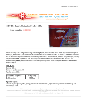Utworzono: 2017-03-07 01:18:27 MET-RX - Pure L-Glutamine Powder - 300g Cena produktu: 59,00 PLN Produkt firmy MET-RX pozbawiony został zbędnych ywpełniaczy, toteż może być stosowany przez każdego, bez obaw o jakiekolwiek skutki uboczne. Glutamina zawarta w Pure L-Glutamine Powder ma za zadanie wspomóc odnowę uszkodzonych struktur mięśniowych, a także przyspieszyć procesy antykataboliczne. Suplement ten wykazuje również silne działanie anaboliczne, dlatego też suplementacja nim przyniesie dodatkowe korzyści w postaci rozbudowy i wzmocnienia komórek mięśniowych. Składniki: Porcja: 4,5 g Porcji w opakowaniu: 66 Opakowanie: 300 g Składniki aktywne L-Glutamina w 1 porcji 4500mg Sposób użycia: Zaleca się spożywać jedną porcję do dwóch razy dziennie, wymieszanej wraz z 250ml wody lub ulubionego soku. Oświadczamy, że opis produktu oraz zdjęcia zostały stworzone przez firmę Muscle Power. Kopiowanie, przetwarzanie i rozpowszechnianie tych materiałów w całości lub w części bez naszej zgody jest zabronione i stanowi naruszenie praw autorskich. Podstawa prawna: Dz. U. 94 nr 24 poz. 83, sprost.: Dz. U. 94 nr 43 poz. 170. Adres: http://www.muscle.trustnet.pl/ Telefon: 34 36 43 000, 782 010 880 Email: [email protected]