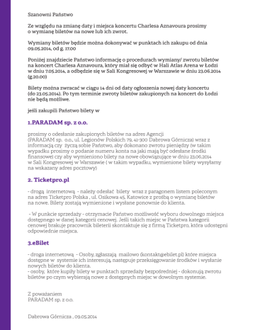 Szanowni Państwo Ze względu na zmianę daty i miejsca koncertu Charlesa Aznavoura prosimy o wymianę biletów na nowe lub ich zwrot. Wymiany biletów będzie można dokonywać w punktach ich zakupu od dnia 09.05.2014, od g. 17.00 Poniżej znajdziecie Państwo informację o procedurach wymiany/ zwrotu biletów na koncert Charlesa Aznavoura, który miał się odbyć w Hali Atlas Arena w Łodzi w dniu 7.05.2014, a odbędzie się w Sali Kongresowej w Warszawie w dniu 23.06.2014 (g.20.00) Bilety można zwracać w ciągu 14 dni od daty ogłoszenia nowej daty koncertu (do 23.05.2014). Po tym terminie zwroty biletów zakupionych na koncert do Łodzi nie będą możliwe. jeśli zakupili Państwo bilety w 1.PARADAM sp. z o.o. prosimy o odesłanie zakupionych biletów na adres Agencji (PARADAM sp. o.o., ul. Legionów Polskich 79, 41-300 Dabrowa Górnicza) wraz z informacją czy życzą sobie Państwo, aby dokonano zwrotu pieniędzy (w takim wypadku prosimy o podanie numeru konta na jaki mają być odesłane środki finansowe) czy aby wymieniono bilety na nowe obowiązujące w dniu 23.06.2014 w Sali Kongresowej w Warszawie ( w takim wypadku, wymienione bilety wysyłamy na wskazany adres pocztowy) 2. Ticketpro.pl - drogą internetową - należy odesłać bilety wraz z paragonem listem poleconym na adres Ticketpro Polska , ul. Osikowa 45, Katowice z prośbą o wymianę biletów na nowe. Bilety zostają wymienione i wysłane ponownie do klienta. - W punkcie sprzedaży - otrzymacie Państwo możliwość wyboru dowolnego miejsca dostępnego w danej kategorii cenowej. Jeśli takich miejsc w Państwa kategorii cenowej brakuje pracownik bileterii skontaktuje się z firmą Ticketpro, która udostępni odpowiednie miejsca. 3.eBilet - droga internetową - Osoby, zgłaszają mailowo ([email protected]) które miejsca dostępne w systemie ich interesują, następuje przeksięgowanie środków i wysłanie nowych biletów do klienta. - osoby, które kupiły bilety w punktach sprzedaży bezpośredniej - dokonują zwrotu biletów po czym wybierają nowe z dostępnych miejsc w dowolnym systemie. Z poważaniem PARADAM sp. z o.o. Dabrowa Górnicza , 09.05.2014