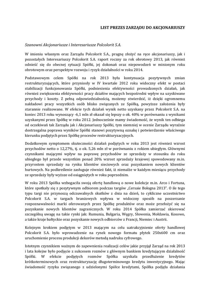 LIST PREZES ZARZĄDU DO AKCJONARIUSZY Szanowni Akcjonariusze i Interesariusze Polcolorit S.A. W imieniu własnym oraz Zarządu Polcolorit S.A., pragnę złożyć na ręce akcjonariuszy, jak i pozostałych Interesariuszy Polcolorit S.A. raport roczny za rok obrotowy 2013, jak również odnieść się do obecnej sytuacji Spółki, jej dokonań oraz niepowodzeń w minionym roku obrotowym oraz perspektyw rozwoju i ryzyk działalności w roku 2014. Podstawowym celem Spółki na rok 2013 była kontynuacja pozytywnych zmian restrukturyzujących, które przyniosły w IV kwartale 2012 roku widoczny efekt w postaci stabilizacji funkcjonowania Spółki, podniesienia efektywności prowadzonych działań, jak również zwiększenia efektywności pracy działów mających bezpośredni wpływ na uzyskiwane przychody i koszty. Z pełną odpowiedzialnością, możemy stwierdzić, iż dzięki ogromnemu nakładowi pracy wszystkich osób blisko związanych ze Spółką, powyższe założenia były starannie realizowane. W efekcie tych działań wynik netto uzyskany przez Polcolorit S.A. na koniec 2013 roku wynoszący -6,1 mln zł okazał się lepszy o ok. 40% w porównaniu z wynikami uzyskanymi przez Spółkę w roku 2012. Jednocześnie mamy świadomość, że wynik ten odbiega od oczekiwań tak Zarządu jak i Akcjonariuszy Spółki, tym niemniej w ocenie Zarządu wyraźnie dostrzegalna poprawa wyników Spółki stanowi pozytywną oznakę i potwierdzenie właściwego kierunku podjętych przez Spółkę procesów restrukturyzacyjnych. Dodatkowym symptomem skuteczności działań podjętych w roku 2013 jest również wzrost przychodów netto o 12,27%, tj. o ok. 5,26 mln zł w porównaniu z rokiem ubiegłym. Głównymi czynnikami mającymi wpływ na poprawę przychodów ze sprzedaży w stosunku do roku ubiegłego był przede wszystkim ponad 20% wzrost sprzedaży krajowej spowodowany m.in. przyrostem sprzedaży na rynku klientów sieciowych oraz pozyskaniem nowych klientów hurtowych. Na podkreślenie zasługuje również fakt, iż niemalże w każdym miesiącu przychody ze sprzedaży były wyższe od osiągniętych w roku poprzednim. W roku 2013 Spółka wzbogaciła swoją ofertę handlową o nowe kolekcje m.in. Arco i Fortuna, które spotkały się z pozytywnym odbiorem podczas targów „Cersaie Bologna 2013”. O ile tego typu targi nie przynoszą odczuwalnych skutków z dnia na dzień, to cykliczne uczestnictwo Polcolorit S.A. w targach branżowych wpływa w widoczny sposób na poszerzanie rozpoznawalności marki oferowanych przez Spółkę produktów oraz może przełożyć się na pozyskanie nowych klientów zagranicznych. W roku 2014 Spółka zamierzać skierować szczególną uwagę na takie rynki jak: Rumunia, Bułgaria, Węgry, Słowenia, Mołdawia, Kosowo, a także kraje bałtyckie oraz pozyskanie nowych odbiorców z Francji, Niemiec i Austrii. Kolejnym krokiem podjętym w 2013 mającym na celu uatrakcyjnienie oferty handlowej Polcolorit S.A. było wprowadzenie na rynek nowego formatu płytek 250x600 cm oraz uruchomienie procesu produkcji dekorów metodą nadruku cyfrowego. Istotnym czynnikiem ważnym do zapewnienia realizacji celów jakie przyjął Zarząd na rok 2013 i lata kolejne było podjęcie z sukcesem rozmów z głównym bankiem kredytującym działalność Spółki. W efekcie podjętych rozmów Spółka uzyskała przedłużenie kredytów krótkoterminowych oraz restrukturyzację długoterminowego kredytu inwestycyjnego. Mając świadomość ryzyka związanego z udzielonymi Spółce kredytami, Spółka podjęła działania zmierzające do dywersyfikacji ryzyka w zakresie finansowania dłużnego zmierzającego do poszukiwanie alternatywnego źródła finansowania. Nie dalej jak w dniu 20 marca 2014 r. Spółka podpisała z Citronex I Sp. z o.o. z siedzibą w Zgorzelcu List intencyjny, na mocy którego strony wyraziły wolę zawarcia w terminie do dnia 30 kwietnia 2014 r. odpowiednio umów pożyczek oraz umowy o współpracy. Zasadniczym zmartwieniem Spółki w roku 2013 był brak możliwości pełnego wykorzystania mocy produkcyjnych zakładu produkcyjnego oraz nieznaczny, ale zawsze spadek sprzedaży eksportowej. W związku z powyższym, w roku 2014 Zarząd Polcolorit S.A. planuje przyspieszoną ekspansję na rynki eksportowe i znaczną poprawę sprzedaży zagranicznej. Najważniejszym celem Zarządu Polcolorit S.A. w roku 2014 r. jest kontynuacja procesów, których skutkiem ma być stała poprawa efektywności funkcjonowania Spółki i powrót na drogę rentowności. Liczymy, że pomogą nam w tym pozytywne prognozy w zakresie sytuacji makroekonomicznej w kraju i zagranicą. Ponadto Spółka planuje wdrożenie nowych produktów do bogatej już dziś oferty handlowej oraz zwiększenie sprzedaży oraz pozyskanie nowych klientów zagranicznych, przy jednoczesnej dalszej optymalizacji zmian w strukturze organizacyjnej Spółki wprowadzającej większą efektywność. W tym miejscu chciałabym skierować szczególne podziękowania do naszych Akcjonariuszy za wsparcie dla wszelkich działań prowadzonych przez Spółkę. Wyrazy szacunku składam naszym klientom i partnerom handlowym za owocną współpracę, zaufanie i lojalność. Słowa uznania należą się całej załodze Polcolorit S.A., dzięki której zaangażowaniu i ofiarności osiągnęliśmy wymierne rezultaty. Pozostaję z poważaniem, Prezes Zarządu Polcolorit S.A. Barbara Urbaniak – Marconi