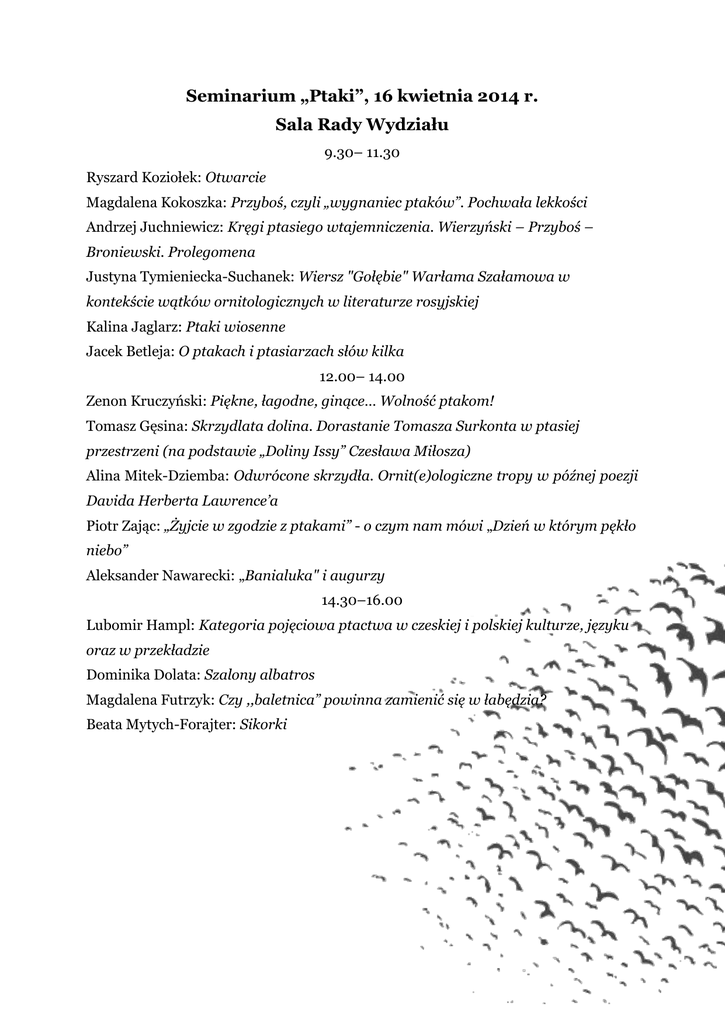 Seminarium „Ptaki”, 16 kwietnia 2014 r. Sala Rady Wydziału 9.30– 11.30 Ryszard Koziołek: Otwarcie Magdalena Kokoszka: Przyboś, czyli „wygnaniec ptaków”. Pochwała lekkości Andrzej Juchniewicz: Kręgi ptasiego wtajemniczenia. Wierzyński – Przyboś – Broniewski. Prolegomena Justyna Tymieniecka-Suchanek: Wiersz "Gołębie" Warłama Szałamowa w kontekście wątków ornitologicznych w literaturze rosyjskiej Kalina Jaglarz: Ptaki wiosenne Jacek Betleja: O ptakach i ptasiarzach słów kilka 12.00– 14.00 Zenon Kruczyński: Piękne, łagodne, ginące… Wolność ptakom! Tomasz Gęsina: Skrzydlata dolina. Dorastanie Tomasza Surkonta w ptasiej przestrzeni (na podstawie „Doliny Issy” Czesława Miłosza) Alina Mitek-Dziemba: Odwrócone skrzydła. Ornit(e)ologiczne tropy w późnej poezji Davida Herberta Lawrence’a Piotr Zając: „Żyjcie w zgodzie z ptakami” - o czym nam mówi „Dzień w którym pękło niebo” Aleksander Nawarecki: „Banialuka" i augurzy 14.30–16.00 Lubomir Hampl: Kategoria pojęciowa ptactwa w czeskiej i polskiej kulturze, języku oraz w przekładzie Dominika Dolata: Szalony albatros Magdalena Futrzyk: Czy ,,baletnica” powinna zamienić się w łabędzia? Beata Mytych-Forajter: Sikorki