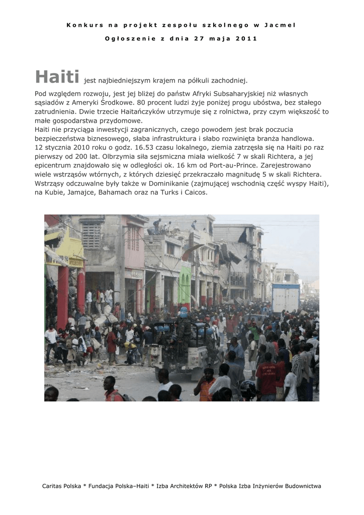 Konkurs na projekt Ogłoszenie Haiti zespołu z dnia szkolnego 27 maja w Jacmel 2011 jest najbiedniejszym krajem na półkuli zachodniej. Pod względem rozwoju, jest jej bliżej do państw Afryki Subsaharyjskiej niż własnych sąsiadów z Ameryki Środkowe. 80 procent ludzi żyje poniżej progu ubóstwa, bez stałego zatrudnienia. Dwie trzecie Haitańczyków utrzymuje się z rolnictwa, przy czym większość to małe gospodarstwa przydomowe. Haiti nie przyciąga inwestycji zagranicznych, czego powodem jest brak poczucia bezpieczeństwa biznesowego, słaba infrastruktura i słabo rozwinięta branża handlowa. 12 stycznia 2010 roku o godz. 16.53 czasu lokalnego, ziemia zatrzęsła się na Haiti po raz pierwszy od 200 lat. Olbrzymia siła sejsmiczna miała wielkość 7 w skali Richtera, a jej epicentrum znajdowało się w odległości ok. 16 km od Port-au-Prince. Zarejestrowano wiele wstrząsów wtórnych, z których dziesięć przekraczało magnitudę 5 w skali Richtera. Wstrząsy odczuwalne były także w Dominikanie (zajmującej wschodnią część wyspy Haiti), na Kubie, Jamajce, Bahamach oraz na Turks i Caicos. Caritas Polska * Fundacja Polska–Haiti * Izba Architektów RP * Polska Izba Inżynierów Budownictwa Konkurs na projekt Ogłoszenie zespołu z dnia szkolnego 27 maja w Jacmel 2011 Zniszczeniu uległa większość historycznych budynków w Port-au-Prince, m.in. Pałac Prezydencki, siedziba Zgromadzenia Narodowego i katedra Notre-Dame. Mniejsze szkody zanotowano także w budynkach Ministerstwa Finansów, Ministerstwa Robót Publicznych, Ministerstwa Komunikacji i Kultury, Ministerstwa Sprawiedliwości, a także na międzynarodowym lotnisku w stolicy. Zniszczeniu uległ szpital w Pétionville, na bogatych przedmieściach oraz większość innych placówek leczniczych w centrum miasta. Zniszczeniu uległo także przepełnione główne więzienie w Port-au-Prince, w wyniku czego więźniowie uciekli. Zniszczenia dotknęły też siedzibę stabilizacyjnej misji ONZ, mieszczącej się w Christopher Hotel, oraz urzędy Banku Światowego. Hôtel Montana, w którym znajdowało się około 300 gości, zawalił się, a los około 200 osób jest nieznany. Port, w którym znajdowały się statki, uległ poważnemu uszkodzeniu; do morza wydostała się ropa z zacumowanych statków. Po trzęsieniu ziemi w Port-au-Prince zapanował chaos, a nad ruinami unosiła się chmura szarego pyłu. Caritas Polska * Fundacja Polska–Haiti * Izba Architektów RP * Polska Izba Inżynierów Budownictwa Konkurs na projekt Ogłoszenie zespołu z dnia szkolnego 27 maja w Jacmel 2011 Dotychczas potwierdzono śmierć 230 000 osób. Około trzech milionów ludzi mogło ucierpieć w inny sposób: odniosło obrażenia lub zostało bez dachu nad głową. Caritas Polska * Fundacja Polska–Haiti * Izba Architektów RP * Polska Izba Inżynierów Budownictwa Konkurs na projekt Ogłoszenie Inspiracją powstania zespołu z dnia szkolnego 27 maja w Jacmel 2011 Fundacji Polska-Haiti było owo tragiczne trzęsienie ziemi z 12 stycznia 2010 roku, które nawiedziło wyspę, wyrządzając katastrofalne szkody. Działalność Fundacji jest sformalizowaną formą kontynuacji aktywności grona osób wstrząśniętych tym wydarzeniem. Ich żywiołowa reakcja zaowocowała m.in. realizacją kampanii medialnej „Solidarni z Haiti”, która zorganizowana została we współpracy z Caritas Polska. Fundację powołano do życia 19 lutego 2010 roku, jej prezesem jest Zofia Pinchinat-Witucka. Celem Fundacji jest wsparcie mieszkańców Haiti w długoterminowych projektach odbudowy kraju oraz w procesie tworzenia społeczeństwa obywatelskiego, rozwoju nowoczesnego szkolnictwa, a także promocji kultury i sztuki. W założeniu pomoc ta ma posłużyć przede wszystkim kształceniu przyszłych elit gospodarczych, naukowych i kulturalnych, z naciskiem na uświadamianie młodym Haitańczykom konieczności podjęcia funkcji społecznych dla dobra całego społeczeństwa. Aby osiągnąć te cele Fundacja chce w swojej działalności skupić się na wspieraniu różnorodnych działań naukowych, dydaktycznych i kulturalnych. Caritas Polska * Fundacja Polska–Haiti * Izba Architektów RP * Polska Izba Inżynierów Budownictwa Konkurs na projekt Ogłoszenie Konkurs zespołu z dnia szkolnego 27 maja w Jacmel 2011 zakłada wykonanie projektu zespołu szkół podstawowej i gimnazjum dla około 400 dzieci w miejscowości Jacmel położonej na południowy-zachód od Port-au-Prince, stolicy Haiti. Współorganizatorami konkursu są: Fundacja Polska-Haiti, Izba Architektów RP oraz Polska Izba Inżynierów Budownictwa. Konkurs jest otwarty i jedynym warunkiem uczestnictwa w nim dla architekta jest przynależność do Izby Architektów, a przypadku inżyniera budownictwa do Izby Inżynierów Budownictwa. Zespół wykonujący projekt ma również obowiązek wybrać spośród jego członków jednego architekta, który przez cały okres trwania konkursu, a później ewentualnej misji będzie pełnił funkcję głównego autora projektu. Inwestorem Bezpośrednim jest Biskupstwo Jacmel na Haiti Konkurs jest dwuetapowy, a decyzja Sądu Konkursowego ma charakter wiążący dla instytucji zamawiającej. Etap I: Wykonanie koncepcji architektonicznej z podstawowymi założeniami branżowymi. Termin przekazania prac: 05 września 2011 Zakres: według warunków konkursowych Nagrody : 3 nagrody po 3.500 PLN Etap II: Wykonanie projektu wielobranżowego o szczegółowości projektu budowlanego. Termin przekazania prac: 30 listopada 2011 Zakres: według warunków konkursowych Nagrody : Nagroda I : zlecenie na wykonanie (negocjacja z wolnej stopy) projektu wykonawczego i 3 płatnych (z pokryciem kosztów włącznie) 1-tygodniowych nadzorów autorskich Nagroda II : 7.000 PLN Nagroda III : 5.000 PLN Caritas Polska * Fundacja Polska–Haiti * Izba Architektów RP * Polska Izba Inżynierów Budownictwa Konkurs na projekt Ogłoszenie zespołu z dnia szkolnego 27 maja w Jacmel
