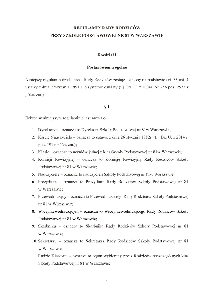 REGULAMIN RADY RODZICÓW PRZY SZKOLE PODSTAWOWEJ NR 81 W WARSZAWIE Rozdział I Postanowienia ogólne Niniejszy regulamin działalności Rady Rodziców zostaje ustalony na podstawie art. 53 ust. 4 ustawy z dnia 7 września 1991 r. o systemie oświaty (t.j. Dz. U. z 2004r. Nr 256 poz. 2572 z późn. zm.) §1 Ilekroć w niniejszym regulaminie jest mowa o: 1. Dyrektorze – oznacza to Dyrektora Szkoły Podstawowej nr 81w Warszawie; 2. Karcie Nauczyciela – oznacza to ustawę z dnia 26 stycznia 1982r. (t.j. Dz. U. z 2014 r. poz. 191 z późn. zm.); 3. Klasie – oznacza to uczniów jednej z klas Szkoły Podstawowej nr 81w Warszawie; 4. Komisji Rewizyjnej – oznacza to Komisję Rewizyjną Rady Rodziców Szkoły Podstawowej nr 81 w Warszawie; 5. Nauczyciele – oznacza to nauczycieli Szkoły Podstawowej nr 81w Warszawie; 6. Prezydium – oznacza to Prezydium Rady Rodziców Szkoły Podstawowej nr 81 w Warszawie; 7. Przewodniczący – oznacza to Przewodniczącego Rady Rodziców Szkoły Podstawowej nr 81 w Warszawie; 8. Wiceprzewodniczącym – oznacza to Wiceprzewodniczącego Rady Rodziców Szkoły Podstawowej nr 81 w Warszawie; 9. Skarbniku – oznacza to Skarbnika Rady Rodziców Szkoły Podstawowej nr 81 w Warszawie; 10. Sekretarzu – oznacza to Sekretarza Rady Rodziców Szkoły Podstawowej nr 81 w Warszawie; 11. Radzie Klasowej – oznacza to organ wybierany przez Rodziców poszczególnych klas Szkoły Podstawowej nr 81 w Warszawie; 1 12. Radzie Pedagogicznej – oznacza to Radę Pedagogiczną Szkoły Podstawowej nr 81 w Warszawie; 13. Rodzicach – oznacza to rodziców lub opiekunów prawnych uczniów Szkoły Podstawowej nr 81 w Warszawie; 14. Samorządzie Uczniowskim – oznacza to Samorząd Uczniowski Szkoły Podstawowej nr 81 w Warszawie; 15. Społeczności Szkolnej – oznacza to Rodziców, uczniów, Dyrektora oraz Radę Pedagogiczną Szkoły Podstawowej nr 81 w Warszawie; 16. Statucie – oznacza to statut Szkoły Podstawowej nr 81 w Warszawie; 17. Szkole – oznacza to Szkołę Podstawową nr 81 w Warszawie; 18. Ustawie – oznacza to ustawę z dnia 7 września 1991 r. o systemie oświaty (t. j. Dz. U. z 2004r. Nr 256 poz. 2572 z późn. zm.) Rozdział II Zakres i przedmiot działania Rady §2 1. Rada jest społeczną, niezależną i samorządną reprezentacją Rodziców uczniów Szkoły. 2. Rada reprezentuje Rodziców w zakresie swoich kompetencji ustawowych i zapisów niniejszego Regulaminu. 3. Podstawowym celem Rady jest podejmowanie działań na rzecz dobra uczniów i społeczności szkolnej oraz współdziałanie z Dyrektorem, Radą Pedagogiczną i Rodzicami w procesie nauczania, opieki i wychowania. 4. Rada realizuje swoje cele w szczególności poprzez: 1) pobudzanie aktywności Społeczności Szkolnej i organizowanie różnorodnych form działania na rzecz rozwoju Szkoły; 2) zapewnienie Rodzicom wpływu na działalność Szkoły poprzez wyrażanie w formie uchwał stanowiska w sprawach związanych z działalnością Szkoły Dyrektorowi, innym organom Szkoły, organowi prowadzącemu i organowi sprawującemu nadzór pedagogiczny; 3) formułowanie opinii w sprawach przewidywanych innymi przepisami; 4) współpracę z Dyrektorem i Radą Pedagogiczną i Samorządem Uczniowskim; 2 5) gromadzenie funduszy niezbędnych dla wspierania działalności Szkoły i ustalenie zasad ich wydatkowania. §3 1. Kompetencje Rady określają przepisy Ustawy oraz jej akty wykonawcze. 2. Do kompetencji Rady Rodziców należy w szczególności: 1) występowanie we wszystkich sprawach dotyczących Szkoły do Dyrektora oraz pozostałych organów szkoły, a także do organu prowadzącego i organu sprawującego nadzór pedagogiczny nad Szkołą; 2) uchwalanie w porozumieniu z Radą Pedagogiczną programu wychowawczego Szkoły i programu profilaktyki; 3) opiniowanie szkolnego zestawu programów nauczania i podręczników; 4) opiniowanie programu i harmonogramu poprawy efektywności kształcenia lub wychowania; 5) określanie w porozumieniu z Dyrektorem wzoru jednolitego stroju noszonego przez uczniów na terenie Szkoły jak również sytuacji, w których przebywanie ucznia na terenie Szkoły nie wymaga noszenia przez niego jednolitego stroju; 6) występowanie z wnioskami o dokonanie oceny pracy Nauczycieli Szkoły; 7) udział przedstawiciela Rady w komisji konkursowej powołanej przez organ prowadzący w celu wyłonienia kandydata na Dyrektora; 8) opiniowanie projektu planu finansowego składanego przez Dyrektora; 9) uchwalanie corocznego preliminarza Rady lub jego zmian; 10) powoływanie Zespołów Zadaniowych Rady; 11) opiniowanie możliwości podjęcia w szkole działalności przez stowarzyszenia lub inne organizacje, w szczególności organizacje harcerskie; 12) występowanie z wnioskiem o utworzenie Rady Szkoły; 13) porozumiewanie się z Radami Rodziców innych szkół w szczególności lokalnych, ustalając zasady i zakres współpracy; 14) zatwierdzanie rocznego sprawozdania finansowego Rady. Rozdział III 3 i placówek Zasady wyboru i pracy Rady §4 1. Podstawą powołania Rady są przeprowadzone wybory do wszystkich Rad Klasowych. 2. Wybory do Rad Klasowych i Rady odbywają się w sposób tajny i demokratyczny. 3. Wybory do Rad Klasowych i Rady przeprowadza się na pierwszym zebraniu Rodziców każdej Klasy na początku roku szkolnego, nie później niż do dnia 30 września każdego roku. 4. W wyborach do Rad Klasowych i Rady jednego ucznia reprezentuje jeden Rodzic. 5. Rada Klasowa wybiera spośród siebie przewodniczącego, wiceprzewodniczącego i skarbnika. 6. Każda klasa reprezentowana jest w Radzie przez jednego przedstawiciela. 7. Zebranie, podczas którego dokonuje się wyboru lub odwołania członków Rady, prowadzi Rodzic, wybrany w głosowaniu jawnym jako przewodniczący zebrania. 8. Dla przeprowadzenia tajnych wyborów powołuje się Komisję Skrutacyjną. 9. W celu przeprowadzenia tajnego głosowania Komisja Skrutacyjna sporządza karty do głosowania, które następnie wydaje ucz