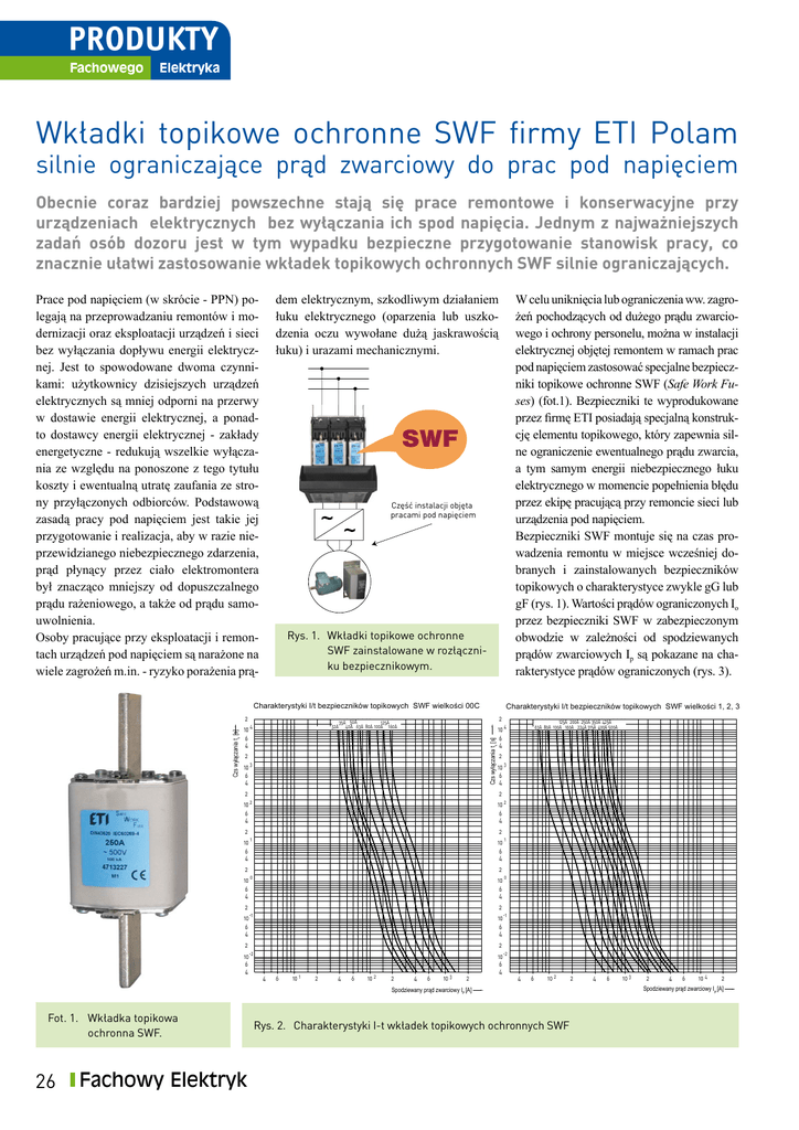 PRODUKTY Wkładki topikowe ochronne SWF firmy ETI Polam silnie ograniczające prąd zwarciowy do prac pod napięciem Obecnie coraz bardziej powszechne stają się prace remontowe i konserwacyjne przy urządzeniach elektrycznych bez wyłączania ich spod napięcia. Jednym z najważniejszych zadań osób dozoru jest w tym wypadku bezpieczne przygotowanie stanowisk pracy, co znacznie ułatwi zastosowanie wkładek topikowych ochronnych SWF silnie ograniczających. Prace pod napięciem (w skrócie - PPN) polegają na przeprowadzaniu remontów i modernizacji oraz eksploatacji urządzeń i sieci bez wyłączania dopływu energii elektrycznej. Jest to spowodowane dwoma czynnikami: użytkownicy dzisiejszych urządzeń elektrycznych są mniej odporni na przerwy w dostawie energii elektrycznej, a ponadto dostawcy energii elektrycznej - zakłady energetyczne - redukują wszelkie wyłączania ze względu na ponoszone z tego tytułu koszty i ewentualną utratę zaufania ze strony przyłączonych odbiorców. Podstawową zasadą pracy pod napięciem jest takie jej przygotowanie i realizacja, aby w razie nieprzewidzianego niebezpiecznego zdarzenia, prąd płynący przez ciało elektromontera był znacząco mniejszy od dopuszczalnego prądu rażeniowego, a także od prądu samouwolnienia. Osoby pracujące przy eksploatacji i remontach urządzeń pod napięciem są narażone na wiele zagrożeń m.in. - ryzyko porażenia prą- dem elektrycznym, szkodliwym działaniem łuku elektrycznego (oparzenia lub uszkodzenia oczu wywołane dużą jaskrawością łuku) i urazami mechanicznymi. SWF W celu uniknięcia lub ograniczenia ww. zagrożeń pochodzących od dużego prądu zwarciowego i ochrony personelu, można w instalacji elektrycznej objętej remontem w ramach prac pod napięciem zastosować specjalne bezpieczniki topikowe ochronne SWF (Safe Work Fuses) (fot.1). Bezpieczniki te wyprodukowane przez firmę ETI posiadają specjalną konstrukcję elementu topikowego, który zapewnia silne ograniczenie ewentualnego prądu zwarcia, a tym samym energii niebezpiecznego łuku elektrycznego w momencie popełnienia błędu przez ekipę pracującą przy remoncie sieci lub urządzenia pod napięciem. Bezpieczniki SWF montuje się na czas prowadzenia remontu w miejsce wcześniej dobranych i zainstalowanych bezpieczników topikowych o charakterystyce zwykle gG lub gF (rys. 1). Wartości prądów ograniczonych Io przez bezpieczniki SWF w zabezpieczonym obwodzie w zależności od spodziewanych prądów zwarciowych Ip są pokazane na charakterystyce prądów ograniczonych (rys. 3). SWF SWF Część instalacji objęta pracami pod napięciem Rys. 1. Wkładki topikowe ochronne SWF zainstalowane w rozłączniku bezpiecznikowym. Charakterystyki I/t bezpieczników topikowych SWF wielkości 00C Ý Charakterystyki I/t bezpieczników topikowych SWF wielkości 1, 2, 3 ! ! ! ! ! ! ! ! ! Ý Ý Ý Ý Ý Ý Ý Ý ! ! ! ! ! ! ! ! ! ! ! ! ! Ý Czs wyłączania tv [s] Czs wyłączania tv [s] Ý Ý Ý Ý Spodziewany prąd zwarciowy IP [A] Fot. 1. Wkładka topikowa ochronna SWF. 26 Fachowy Elektryk Rys. 2. Charakterystyki I-t wkładek topikowych ochronnych SWF Ý Ý Spodziewany prąd zwarciowy IP [A] PRODUKTY Charakterstyka prądów ograniczonych bezpieczników SWF wielkości 00C, 1,2,3 Ý 2 2I K ! Ý I N /A Ý Energia pod kont ontrolą olą ! ! ! ! ! energia pod kontrola ! ! ! ! ! ! ! ! ! Ý REKLAMA 2I , 0ReDÝOGRANICZONYÝ)/Ý;!=Ý Ý Ý Ý Ý Ý Ý Spodziewany prąd zwarciowy IP [A] Obudowy GT Rys. 3. Charakterystyki prądów ograniczonych wkładek topikowych ochronnych SWF inż. Roman Kłopocki Product Manager ETI Polam Pułtusk - malowanie proszkowe RAL 7036 ETILOGIC serii LOGIC - prosta nawigacja - maksymalnie 44 we/wy - dodatk oprogramowanie ENERGET YKA ENERGOELEKTRON IKA BU DOWNICTWO I PRZEMYSŁ Bezpieczniki SWF wyłączają prąd zwarciowy w czasie krótszym niż 1/4 okresu, nie dopuszczając do przepływu prądu udarowego. Silne ograniczanie prądu zwarciowego przez bezpieczniki SWF wiąże się z ich niewielką znamionową całką Joule’a, która wyraża energię wydzieloną przez prąd zwarciowy płynący w obwodzie na jego jednostkę rezystancji. Jest to cecha szczególnie istotna również dla urządzeń wrażliwych na elektrodynamiczne skutki zwarć. Energia łuku elektrycznego ograniczonego przez wkładki SWF jest ok. 30-krotnie mniejsza od energii łuku elektrycznego ograniczonego przez wkładki topikowe gG. Wkładki topikowe SWF chroniące przed skutkami łuku elektrycznego posiadają następujące zalety eksploatacyjne: silnie ograniczają prąd zwarciowy, posiadają krótki czas zadziałania przy zwarciach i przeciążeniach - (charakterstyka I-t pokazana jest na rys. 2), dostępne są w rozmiarach 00C: 32 A - 160 A, 1: 63 A - 250 A, 2: 125 A - 400 A, 3: 250 A - 500 A, oznaczone na etykiecie jako SWF, wyposażone w standardowy wskaźnik przepalenia. Aby prawidłowo dobrać prąd znamionowy wkładek topikowych SWF w celu obniżenia ewentualnego prądu zwarciowego na czas przeprowadzenia remontu należy przyjąć taką samą wielkość i prąd znamionowy, jak wkładki gG lub gF: In (SWF) = In (gG, gF). Z uwagi na to, że wkładki SWF posiadają wyższe znamionowe straty mocy ΔP niż wkładki NH gG lub gF można używać ich tylko w czasie remontu lub konserwacji sieci pod napięciem. Po zakończeniu tych prac należy ponownie wymienić wkładki SWF na wkładki NH gG lub gF, które były zamontowane przed pracami remontowymi. Obudowy metalowe typu GT -hermetyczne IP-65 EPF-43, EPF-44 - - w sieci 3-fazowej we wej 230/400V AC - wybór zasilania priorytetowego styków 16A 801 501 571 www.etipolam.com.pl Fachowy Elektryk 27