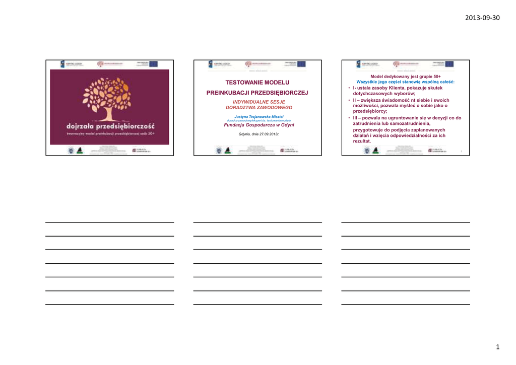 2013-09-30 TESTOWANIE MODELU PREINKUBACJI PRZEDSIĘBIORCZEJ INDYWIDUALNE SESJE DORADZTWA ZAWODOWEGO Justyna Trojanowska-Misztal doradca zawodowy/ekspert ds. testowania modelu Fundacja Gospodarcza w Gdyni Gdynia, dnia 27.09.2013r. Model dedykowany jest grupie 50+ Wszystkie jego części stanowią wspólną całość: • I- ustala zasoby Klienta, pokazuje skutek dotychczasowych wyborów; • II – zwiększa świadomość nt siebie i swoich możliwości, pozwala myśleć o sobie jako o przedsiębiorcy; • III – pozwala na ugruntowanie się w decyzji co do zatrudnienia lub samozatrudnienia, przygotowuje do podjęcia zaplanowanych działań i wzięcia odpowiedzialności za ich rezultat. 3 1 2013-09-30 Źródło wiedzy Korzyści dla doradców zawodowych *Innowacyjne narzędzia z zakresu wspierania klienta na platformie: http://www.dojrzalaprzedsiebiorczosc.pl/ Model Biznesowy TY- doradztwo zawodowe nowych możliwości „Raport nt. nowoczesnych metod motywacji osób starszych w aspekcie wejścia na rynek pracy” Autorzy: mgr Aleksandra Bujacz, dr Maciej Macko *Wiedza z zakresu przedsiębiorczości w pigułce w jednym miejscu: http://www.dojrzalaprzedsiebiorczosc.pl/poradnik/ w tym informacje nt . źródeł finansowania firm http://www.silverteam.dobrekadry.pl/dokumenty/Raport_na_temat_metod_motywa cji_%283%29.pdf „SEMAFOR NOWYCH MOŻLIWOŚCI” *Materiały szkoleniowe, m.in. z obszaru rozwoju osobistego, sprzedaży oraz przedsiębiorczości w jednym miejscu: http://www.dojrzalaprzedsiebiorczosc.pl/strefa-dla-doradcow-zawodowych/ http://fim.org.pl/projekt/semafor/opis-projektu/ http://fim.org.pl/wp-content/uploads/2012/09/Podrecznik_Coaching1.pdf *Strefa Dojrzałego Przedsiębiorcy wspierająca Twojego Klienta • http://www.dojrzalaprzedsiebiorczosc.pl/strefa-dojrzalego-przedsiebiorcy/ „Model Biznesowy TY” – doradztwo zawodowe nowych możliwości. • 4 http://www.karierapodkontrola.pl/recenzja-model-biznesowy-ty/ 5 6 2 2013-09-30 Model Biznesowy TYdoradztwo zawodowe nowych możliwości Grupy klientów Klienci aktywnie zabezpieczający potrzeby rodziny, z planami na przyszłość. 7 Projekt współfinansowany przez Unię Europejską w ramach Europejskiego Funduszu Społecznego Model pozwala na aktywne doradztwo, promuje: *założenie własnej firmy, *pozyskanie dofinansowania na ten cel, *umiejętności sprzedania siebie, swoich umiejętności, *planowanie rozwoju swojej działalności. Tej grupie Klientów model jest rekomendowany w całości 9 3 2013-09-30 Grupy klientów • Klienci aktywnie zabezpieczający potrzeby rodziny Model pozwala między innymi na: • zaprojektowanie kompleksowego wsparcia indywidualnego klienta; • wykorzystanie elementów wsparcia coachingowego, aby poradzić sobie z biernością, niepokojem, często odbudowaniem relacji interpersonalnych; • przygotowanie do pracy między innymi w Klubach Pracy; • przygotowanie do reorientacji zawodowej, • uruchomienie zasobów klienta (np. pasja staje się źródłem dochodów). Grupy klientów Grupy klientów Klienci pozornie aktywni, eksponujący swoje umiejętności • Klienci niezaangażowani, skoncentrowani na trudnościach w znalezieniu pracy Na poziomie: • I moduł- ustalania zasobów, • III moduł- gotowości do działania i wzięcia odpowiedzialności za jego rezultaty model pozwala na pokazanie szerokiego spectrum możliwości i podjęcie decyzji o zmianie. Model pozwala stosować elementy coachingu, m.in. do określenia celu podejmowanych działań, utrzymania motywacji, otrzymania wzmocnienia z zewnątrz. Rozważane dodatkowe wsparcie specjalistyczne: • Terapeutyczne, • Zabezpieczenie świadczeń zdrowotno-bytowych, • Pośrednictwo pracy, • Wsparcie rodzinne opieka nad dziećmi, rodzicami. • Tej grupie Klientów model jest rekomendowany w całości 10 11 12 4 2013-09-30 Jak pracowaliśmy? Grupy klientów 45 uczestników projektu w Fundacji Gospodarczej 15 uczestników w Powiatowym Urzędzie Pracy w Gdyni Klienci bierni skoncentrowani na utracie pracy • Model na I poziomie – ustalenia zasobów, pozwala dostrzec nowe możliwości, • próbować uniezależnić się od swoich trudnych doświadczeń życiowych, • szukać nowych form aktywności zawodowej. Indywidualne spotkania doradcze w Fundacji Gospodarczej w Gdyni od lutego do września 2013r. I-sze II-gie III-cie III-cie i IV-te spotkanie doradcze 13 14 15 5 2013-09-30 INDYWIDUALNE SPOTKANIA DORADCZE Pierwsze spotkanie indywidualne z doradcą zawodowym (I Moduł Kapitał Kariery) Ustalamy zasoby klienta, pokazujemy skutek dotychczasowych wyborów Budujemy wywiad Kapitał Kariery I- sze spotkanie doradcze, czas ok. 2-3 godz. Drugie spotkanie indywidualne z doradcą zawodowym (II Moduł Architekt szkoleń i doradztwa) . • Ustala zasoby klienta, pokazuje skutek dotychczasowych wyborów • Budujemy wywiad Dzięki temu masz czas zadać pytania określające: *W skali od 1 do 10 na ile oceniłbyś poziom satysfakcji w tej sferze na ten dzień? *Gdybyś miał podnieść jakość swojego życia na wyższy poziom, to jakie 2 lub 3 sfery swojego życia chciałbyś przetransformować w ciągu najbliższych 3-6 miesięcy? *Gdybyś miał się skoncentrować tylko na jednej z nich, to która jest dla ciebie najważniejsza? • Moduł: skraca czas diagnozy potencjału i obszarów do rozwoju osoby badanej. • Poszerza możliwości Klienta. Indywidualne doradztwo utrwalające efekty dotychczasowych szkoleń Trzecie indywidualne spotkanie z doradcą zawodowym (III Moduł Projektant Kariery) • • • • 16 Zawiera narzędzia: Moje kwalifikacje i doświadczenia. Moje kompetencje- co wiem potrafię i chcę robić? Gotowość do prowadzenia własnej firmy. 17 18 6 2013-09-30 Ustalamy zasoby klienta, pokazujemy skutek dotychczasowych wyborów Budujemy wywiad • Ile cię będzie kosztować nie zajęcie się tą sferą życia? Jeśli nie osiągniesz swoich najważniejszych celów, jaka cenę za to zapłacisz? • Na kogo będzie to miało 