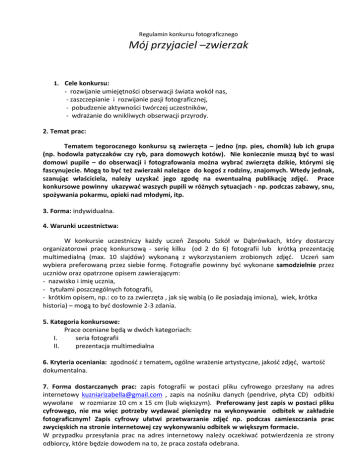 Regulamin konkursu fotograficznego Mój przyjaciel –zwierzak 1. Cele konkursu: - rozwijanie umiejętności obserwacji świata wokół nas, - zaszczepianie i rozwijanie pasji fotograficznej, - pobudzenie aktywności twórczej uczestników, - wdrażanie do wnikliwych obserwacji przyrody. 2. Temat prac: Tematem tegorocznego konkursu są zwierzęta – jedno (np. pies, chomik) lub ich grupa (np. hodowla patyczaków czy ryb, para domowych kotów). Nie koniecznie muszą byd to wasi domowi pupile – do obserwacji i fotografowania można wybrad zwierzęta dzikie, którymi się fascynujecie. Mogą to byd też zwierzaki należące do kogoś z rodziny, znajomych. Wtedy jednak, szanując właściciela, należy uzyskad jego zgodę na ewentualną publikację zdjęd. Prace konkursowe powinny ukazywad waszych pupili w różnych sytuacjach - np. podczas zabawy, snu, spożywania pokarmu, opieki nad młodymi, itp. 3. Forma: indywidualna. 4. Warunki uczestnictwa: W konkursie uczestniczy każdy uczeo Zespołu Szkół w Dąbrówkach, który dostarczy organizatorowi pracę konkursową - serię kilku (od 2 do 6) fotografii lub krótką prezentację multimedialną (max. 10 slajdów) wykonaną z wykorzystaniem zrobionych zdjęd. Uczeo sam wybiera preferowaną przez siebie formę. Fotografie powinny byd wykonane samodzielnie przez uczniów oraz opatrzone opisem zawierającym: - nazwisko i imię ucznia, - tytułami poszczególnych fotografii, - krótkim opisem, np.: co to za zwierzęta , jak się wabią (o ile posiadają imiona), wiek, krótka historia) – mogą to byd dosłownie 2-3 zdania. 5. Kategoria konkursowe: Prace oceniane będą w dwóch kategoriach: I. seria fotografii II. prezentacja multimedialna 6. Kryteria oceniania: zgodnośd z tematem, ogólne wrażenie artystyczne, jakośd zdjęd, wartośd dokumentalna. 7. Forma dostarczanych prac: zapis fotografii w postaci pliku cyfrowego przesłany na adres internetowy [email protected] , zapis na nośniku danych (pendrive, płyta CD) odbitki wywołane w rozmiarze 10 cm x 15 cm (lub większym). Preferowany jest zapis w postaci pliku cyfrowego, nie ma więc potrzeby wydawad pieniędzy na wykonywanie odbitek w zakładzie fotograficznym! Zapis cyfrowy ułatwi przetwarzanie zdjęd np. podczas zamieszczania prac zwycięskich na stronie internetowej czy wykonywaniu odbitek w większym formacie. W przypadku przesyłania prac na adres internetowy należy oczekiwad potwierdzenia ze strony odbiorcy, które będzie dowodem na to, że praca została odebrana. 8. Terminy: Prace powinny byd dostarczone organizatorowi najpóźniej do 27 maja 2015 r. Najmłodsze dzieci przekazują je za pośrednictwem wychowawcy, starsze mogą dostarczad bezpośrednio organizatorowi konkursu. Uroczyste ogłoszenie wyników nastąpi w czerwcu podczas akademii z okazji Międzynarodowego Dnia Ochrony Środowiska. 9. Nagrody: dyplomy i nagrody rzeczowe dla autorów najlepszych prac, ekspozycja najciekawszych prac na stronie internetowej i szkolnej wystawie pokonkursowej, uhonorowanie zwycięskiej pracy stałym miejscem ekspozycji w budynku szkoły. 10. Organizator: opiekun Szkolnego Koła Ekologicznego - Izabella Kuźniar.