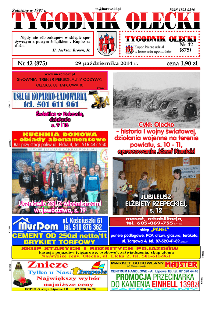[email protected] Założony w 1997 r. Nigdy nie rób zakupów w sklepie spożywczym z pustym żołądkiem . Kupisz za dużo. H. Jackson Brown, Jr. Nr 42 (875) ISSN 1505-0246 Kupon bierze udział w losowaniu upominków 29 października 2014 r. Nr 42 (875) cena 1,90 zł www.mezomorf.pl SIŁOWNIA TRENER PERSONALNY ODŻYWKI OLECKO, UL. TARGOWA 10 V28015 V24410 K99501 Świetlica w Kukowie, działania s. 9 i 18 Uczniowie ZSLiZ wicemistrzami województwa, s. 19 Cykl: Olecko - historia I wojny światowej, działania wojenne na terenie powiatu, s. 10 - 11, opracowanie Józef Kunicki JUBILEUSZ ELŻBIETY RZEPECKIEJ, s. 12 sklep „PANEL” panele podłogowe, PCV, drzwi, glazura, terakota, ul. Targowa 4, tel. 87-520-41-89 K98310 V29603 V30302 SKUP STARYCH I ROZBITYCH POJAZDÓW kasacja pojazdów (ciężarowe, osobowe), zaświadczenia, skup złomu Najwyższe ceny, Olecko, ul. Ełcka 2, tel. 501-611-961 V28005 V27605 masaż, rehabilitacja, tel. 605-869-755 K97910a [email protected] Maria Wanda Dzienisiewicz Kandydatka na radną do Rady Miejskiej w Olecku. Wicestarosta powiatu w latach 2006-2010 i obecnie radna powiatowa. W 2011 r. pracowała jako nauczycielka języka polskiego i kultury polskiej w Uzbekistanie. Od 2012 pracuje na stanowisku kierowniczki w Środowiskowym Domu Samopomocy we Wronkach. Jest absolwentką studiów pedagogicznych oraz podyplomowych studiów menedżerskich. Ukończyła wiele kursów i szkoleń niezbędnych w pracy samorządowej. Pełni funkcje prezeski Lokalnej Organizacji Turystycznej Ziemi Oleckiej oraz Stowarzyszenia Kulturalnego „Przypisani Północy”. Za działania społeczne zyskała spore uznanie, między innymi Srebrny Krzyż za Zasługi dla Związku Harcerstwa Polskiego, a także odznaczenie Prezydenta Rzeczpospolitej Polskiej - Srebrny Krzyż za działalność na rzecz rozwoju turystyki. Urodziła się w Olecku i z tym miastem związane jest całe jej życie. Jej działalność cechuje otwartość na problemy otoczenia i skuteczność w działaniu. TWOJA RADNA! RADA MIEJSKA W OLECKU - OKRĘG NR 8 Ulice 1 Maja, Cisowa, Grunwaldzka, Jagiellońska, Młynowa, Partyzantów, Stroma, Wąska, Zamkowa, Plac Zamkowy, Aleje Lipowe Do policyjnego aresztu trafił 37-letni obywatel Rosji, który przekroczył dozwoloną prędkość, a za odstąpienie od wymierzenia karny chciał wręczyć funkcjonariuszom 100 zł łapówki. 24 października po 17 w Stożnem funkcjonariusze ruchu drogowego zatrzymali do kontroli drogowej kierującego mercedesem, który przekroczył dozwoloną prędkości. Po wylegitymowaniu okazał się to być Ivan L., obywatel Rosji. Policjanci za popełnione wykroczenie nałożyli na mężczyznę mandat karny w wysokości 200 zł. 37-latek oświadczył jednak, że jest to za wysoka kwota i woli tłumaczyć się przed Sądem. Wtedy funkcjonariusze poinformowali go, że zgodnie z obowiązującym prawem zostanie zatrzymany i doprowadzony do sądu. Na to obywatel Rosji wyjął z kieszeni spodni dwa banknoty 50 zł i chciał je wręczyć policjantom mówiąc, że są to pieniądze na prezenty bez wypisywania mandatu. W związku z próbą wręczenia funkcjonariuszom korzyści majątkowej Ivan. L. trafił do policyjnego aresztu. rzeczniczka prasowa KPP sierż. szt. Justyna Sznel Hasło promujące wolontariat na Warmii i Mazurach Regionalne Centrum Wolontariatu w Elblągu zaprasza do udziału w konkursie na hasło promujące wolontariat na Warmii i Mazurach. Hasło powinno oddawać specyfikę oraz uwzględniać walory społeczne i obywatelskie wolontariatu. Będzie ono używane przez mieszkańców Warmii i Mazur w celach promocyjnych i popularyzatorskich publikacjach promujących, stronach internetowych, telebimach, podczas festynów, itp. Konkurs trwa do 17 listopada 2014 r. i jest skierowany do mieszkańców, instytucji i organizacji pozarządowych z obszaru Warmii i Mazur. Kapituła konkursu złożona z 5 osób nagrodzi 3 najbardziej kreatywne hasła promujące wolontariat. Na najciekawsze hasła czekają nagrody, tj. za zajęcie: • I miejsca – 500,- zł w formie bonu towarowego; • II miejsca – 300,- zł w formie bonu towarowego; • III miejsca – 200,- zł w formie bonu towarowego. Regulamin z kartą zgłoszeniową w załączeniu. Zachęcam do wzięcia udziału w konkursie. informacja: Anna Turowska www.powiat.olecko.pl V24709 Proszę o Twój głos w wyborach 16 listopada Miejsce Twego głosowania: Regionalny Ośrodek Kultury w Olecku, plac Wolności 22 Przekroczył dozwoloną prędkość, a za odstąpienie od wymierzeni kary chciał wręczyć policjantom pieniądze V29303 K98704 sfinansowano za środków KWW Dobro Wspólne Otwartość Aktywność Współpraca Archiwum „Tygodnika oleckiego” znajdziesz GRÜNLAND Centrum Roślin Ozdobnych najnowsza kolekcja bylin Olecko, ul. Produkcyjna 11, tel. (87) 523-90-09 V27705 2 Tygodnik olecki 42/875 - r. 2014 na stronie internetowej www.olecko.info (w pliku *.pdf) Tygodnik olecki 42/875 r. 2014 OLECKI TERMINARZ II Turniej Piłki Halowej o puchar Komendanta Powiatowego Policji w Olecku W minioną sobotę w Hali Lega w Olecku odbył się II Turniej Piłki Halowej o puchar Komendanta Powiatowego Policji w Olecku. W imprezie wzięło udział 6 drużyn z policji, straży pożarnej oraz aresztu śledczego. Zwycięzcami turnieju zostali policjanci z Komendy Powiatowej Policji w Augustowie. Uczestnicy spotkania otrzymali puchary i drobne podarunki. Cała impreza przebiegła w miłej i przyjaznej atmosferze. Impreza została zorganizowana przy współpracy z przewodniczącym Zarządu Terenowego NSZZ Policjantów w Olecku. Celem spotkania było propagowanie aktywnego sposobu spędzania wolnego czasu oraz podnoszenie sprawności fizycznej funkcjonariuszy służb mundurowych. Spotkanie otworzył Komendant Powiatowy Policji w Olecku insp. Rafał Klauza, który przywitał uczestników spotkania i kibiców. Głos zabrał także Burmistrz Olecka Wacław Olszewski, który dodawał otuchy zawodnikom. W imprezie uczestniczył 