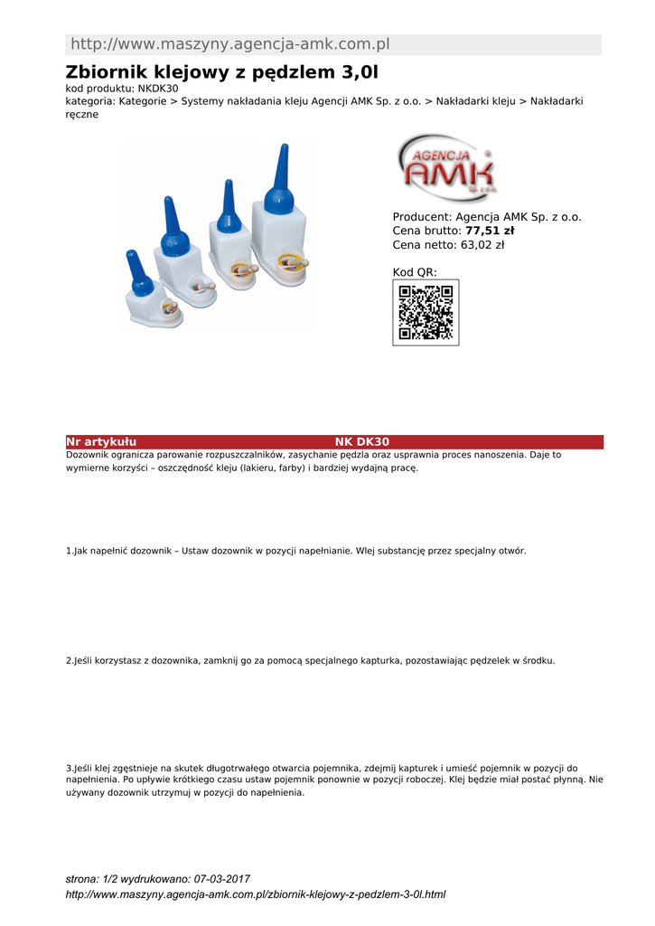 http://www.maszyny.agencja-amk.com.pl Zbiornik klejowy z pędzlem 3,0l kod produktu: NKDK30 kategoria: Kategorie > Systemy nakładania kleju Agencji AMK Sp. z o.o. > Nakładarki kleju > Nakładarki ręczne Producent: Agencja AMK Sp. z o.o. Cena brutto: 77,51 zł Cena netto: 63,02 zł Kod QR: Nr artykułu NK DK30 Dozownik ogranicza parowanie rozpuszczalników, zasychanie pędzla oraz usprawnia proces nanoszenia. Daje to wymierne korzyści – oszczędność kleju (lakieru, farby) i bardziej wydajną pracę. 1.Jak napełnić dozownik – Ustaw dozownik w pozycji napełnianie. Wlej substancję przez specjalny otwór. 2.Jeśli korzystasz z dozownika, zamknij go za pomocą specjalnego kapturka, pozostawiając pędzelek w środku. 3.Jeśli klej zgęstnieje na skutek długotrwałego otwarcia pojemnika, zdejmij kapturek i umieść pojemnik w pozycji do napełnienia. Po upływie krótkiego czasu ustaw pojemnik ponownie w pozycji roboczej. Klej będzie miał postać płynną. Nie używany dozownik utrzymuj w pozycji do napełnienia. strona: 1/2 wydrukowano: 07-03-2017 http://www.maszyny.agencja-amk.com.pl/zbiornik-klejowy-z-pedzlem-3-0l.html 4.W przypadku stosowania parujących czy zapalnych substancji, należy trzymać dozownik z dala od ognia, źródeł światła czy słońca. 5.Nieużywany dozownik przechowujemy hermetycznie zamknięty. strona: 2/2 wydrukowano: 07-03-2017 http://www.maszyny.agencja-amk.com.pl/zbiornik-klejowy-z-pedzlem-3-0l.html