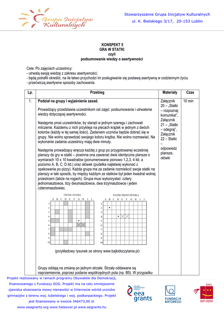 Stowarzyszenie Grupa Inicjatyw Kulturalnych ul. K. Bielskiego 3/17, 20-153 Lublin KONSPEKT 5 GRA W STATKI czyli podsumowanie wiedzy o asertywności Cele: Po zajęciach uczestnicy: - utrwalą swoją wiedzę z zakresu asertywności; - będą potrafili określić, na ile łatwo przychodzi im posługiwanie się postawą asertywną w codziennym życiu - przećwiczą asertywne sposoby zachowania. Lp. 1. Przebieg Podział na grupy i wyjaśnienie zasad. Prowadzący przedstawia uczestnikom cel zajęć: podsumowanie i utrwalenie wiedzy dotyczącej asertywności. Następnie prosi uczestników, by stanęli w jednym szeregu i zachowali milczenie. Każdemu z nich przykleja na plecach krążek w jednym z dwóch kolorów (każdy w tej samej ilości). Zadaniem uczniów będzie dobrać się w grupy. Nie wolno sprawdzać swojego koloru krążka. Nie wolno rozmawiać. Na wykonanie zadania uczestnicy mają dwie minuty. Następnie prowadzący wręcza każdej z grup po przygotowanej wcześniej planszy do gry w statki – powinna ona zawierać dwie identyczne plansze o wymiarach 10 x 10 kwadratów (ponumerowane pionowo 1,2,3, 4 itd. a poziomo A, B, C, D itd.) oraz ołówek (pudełka najłatwiej wykonać z opakowania po pizzy). Każda grupa ma za zadanie rozmieścić swoje statki na planszy w taki sposób, by między każdym ze statków był jeden kwadrat wolnej przestrzeni (także na rogach). Grupa musi wykorzystać: cztery jednomasztowce, trzy dwumasztowce, dwa trzymasztowce i jeden czteromasztowiec. (przykładowy rysunek ze strony www.bajkidoczytania.pl) Grupy oddają na zmianę po jednym strzale. Strzały oddawane są naprzemiennie, poprzez podanie współrzędnych pola (np. B5). W przypadku Projekt realizowany w ramach programu Obywatele dla Demokracji, finansowanego z Funduszy EOG. Projekt ma na celu zmniejszenie zjawiska stosowania mowy nienawiści w Internecie wśród uczniów gimnazjów z terenu woj. lubelskiego i woj. podkarpackiego. Projekt jest finansowany w kwocie 346473,00 zł. www.eeagrants.org www.hateover.pl www.eegrants.hu Materiały Czas Załącznik 20 – „Statki – rozpoznaj komunikat”, Załącznik 21 – „Statki – odegraj”, Załącznik 22 – Statki – odpowiedz plansze, ołówki 10 min Stowarzyszenie Grupa Inicjatyw Kulturalnych ul. K. Bielskiego 3/17, 20-153 Lublin strzału trafionego, grupa kontynuuje strzelanie (czyli swój ruch) aż do momentu chybienia. Zatopienie statku ma miejsce wówczas, gdy grupa odgadnie położenie całego statku. O chybieniu gracz informuje przeciwnika słowem „pudło”, o trafieniu „trafiony ” lub „(trafiony) zatopiony”. Grupa powinna zaznaczać oddane strzały przy pomocy znaku „x” lub kropki. Prowadzący powinien prowadzić własne zapiski, by móc rozstrzygać w przypadku napotkanych trudności. Dodatkowo aby zatopić: - dwumasztowiec – należy rozpoznać, czy odczytany przez prowadzącego komunikat jest asertywny, agresywny czy bierny (załącznik 20 – „Statki – rozpoznaj komunikat”); - trójmasztowiec – należy odpowiedzieć, jak należy asertywnie się zachować w odczytanej przez prowadzącego sytuacji (załącznik 21 - „Statki – odpowiedz”); - czteromasztowiec – należy odegrać scenę wraz z jej asertywnym zakończeniem (załącznik 22 - „Statki – odegraj”). 2. Rozgrywka. 30 min 3. Podsumowanie gry. 5 min Razem: 45 min Projekt realizowany w ramach programu Obywatele dla Demokracji, finansowanego z Funduszy EOG. Projekt ma na celu zmniejszenie zjawiska stosowania mowy nienawiści w Internecie wśród uczniów gimnazjów z terenu woj. lubelskiego i woj. podkarpackiego. Projekt jest finansowany w kwocie 346473,00 zł. www.eeagrants.org www.hateover.pl www.eegrants.hu
