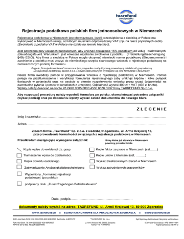 Rejestracja podatkowa polskich firm jednoosobowych w Niemczech Rejestracja podatkowa w Niemczech jest obowiązkowa, jeżeli przedsiębiorca z siedzibą w Polsce ma wykonywać w Niemczech usługi, od których musi tam odprowadzany VAT (np. na rzecz prywatnych osób). (Zwolnienie z podatku VAT w Polsce nie działa na terenie Niemiec). Jest potrzebna przy usługach budowlanych, aby uniknąć obciążenia 15% podatkiem od usług budowlanych (Bauabzugsteuer). Warunkiem jest wówczas uzyskanie zwolnienia z podatku (Freistellungsbescheinigung §48b EStG). Aby firma z siedzibą w Polsce mogła otrzymać niemiecki numer podatkowy (Steuernummer) i zwolnienie z podatku musi złożyć do niemieckiego urzędu skarbowego wniosek o rejestracje podatkową na zamieszczonym poniżej formularzu. Pojęcie „firma jednoosobowa” oznacza w tym przypadku osobę fizyczną prowadzącą działalność gospodarczą. Do rejestracji podatkowej spółek z o.o. i innych osób prawnych wymagane są inne formularze i dokumenty. Nasza firma świadczy pomoc w przygotowaniu wniosku o rejestrację podatkową w Niemczech. Pomoc polega na przetłumaczeniu i weryfikacji formularza rejestracyjnego (aby uniknąć błędów i kilku pułapek tkwiących w pytaniach) oraz na asyście w okresie rozpatrywania wniosku przez urząd (odpowiedzi na ewentualne pytania i pomoc w kontaktach z urzędem). Odpłatność wynosi 400 zł + VAT (492 zł brutto). Wpłaty należy dokonać na konto 78 2490 0005 0000 4530 6876 6537 firmy TAXREFUND Sp.z o.o. Aby rozpocząć procedurę należy wypełnić formularz po polsku, skompletować potrzebne załączniki (wykaz poniżej) oraz po dokonaniu wpłaty wysłać całość dokumentów do naszego biura. ZLECENIE Imię i nazwisko………………………………………………………………………………………………… Adres …………………………………………………………………………………………………………... Zlecam firmie „Taxrefund” Sp. z o.o. z siedzibą w Zgorzelcu, ul. Armii Krajowej 13, przeprowadzenie formalności związanych z rejestracja podatkową w Niemczech. Przedkładam następujące wymagane załączniki: firmy które już działały w Niemczech powinny przesłać także Kopia wpisu do ewidencji dz. gosp. Kopie faktur za prace w Niemczech (szt…….) Tłumaczenie wpisu do działalności. Kopie umów z klientami (szt. ………) Kopia dowodu osobistego Wykaz zrealizowanych zleceń w Niemczech Zaświadczenie Ansässigkeitsbescheinigung Wykaz zatrudnianych pracowników Wypełniony „Formularz rejestracji podatkowej (po polsku) podpisany druk „Zusatzfragebogen Betriebssteuern” Data, podpis………………………………………………. dokumenty należy wysłać na adres: TAXREFUND, ul. Armii Krajowej 13, 59-900 Zgorzelec www.taxrefund.pl :: BIURO RACHUNKOWE DLA PRACUJĄCYCH ZA GRANICĄ EUR: Alior Bank PL36 2490 0005 0000 4600 9046 0523 Swift code: ALBPPLPW PLN: Alior Bank 78 2490 0005 0000 4530 6876 6537 NIP 615-20-42-800, REGON 022040666 "TAXREFUND" Sp. z o.o. ul. Armii Krajowej 13, 59-900 Zgorzelec Telefon +48 75 7719765 :: [email protected] Sąd Rejonowy dla Wrocławia Fabrycznej we Wrocławiu IX Wydział Gospodarczy KRS 0000444954 Kapitał zakładowy: 75.000 zł …………………………………………………………………………………………………………………………………. …………………………………………………………………………………………………………………………………. właściwy urząd skarbowy, adres, kraj - zuständige Steuerbehörde, Anschrift, Staat Dowód rejestracji podatkowej zaświadczenie zagranicznego organu podatkowego Ansässigkeitsbescheinigung Bescheinigung der ausländischen Steuerbehörde Nachweis über steuerliche Erfassung niniejszym zaświadcza się, że hiermit wird bestätigt, dass Imię, nazwisko lub nazwa firmy - Name, Vorname bzw. Firma Adres zamieszkania lub siedziba firmy - Wohnanschrift bzw. Firmensitz Przedmiot działalności gospodarczej - Gegenstand der gewerblichen Tätigkeit jest zarejestrowany w tutejszym urzędzie skarbowym jako: in hiesieger Steuerbehörde ist registriert als Przedsiębiorca Unternehmer Osoba prywatna Privatperson pod następujacym numerem identyfikacji podatkowej unter folgender Steuernummer ...................................................................................... ................................................................................................................................................................................................. ................................................................................................................................................................................................. data, miejscowość - Datum, Ort Podpis / nazwisko i stanowisko służbowe Unterschrift / Name und Dienstbezeichnung (pieczęć słuzbowa / Dienstsiegel)