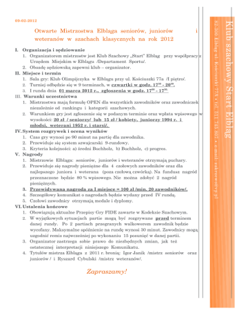 i weteranów w szachach klasycznych na rok 2012 tel. 511 745 807 e-mail: [email protected] Zapraszamy! I. Organizacja i sędziowanie 1. Organizatorem mistrzostw jest Klub Szachowy „Start” Elbląg przy współpracy z Urzędem Miejskim w Elblągu /Departament Sportu/. 2. Obsadę sędziowską zapewni klub – organizator. II. Miejsce i termin 1. Sala gry: Klub Olimpijczyka w Elblągu przy ul. Kościuszki 77a /I piętro/. 2. Turniej odbędzie się w 9 terminach, w czwartki w godz. 1730 - 2030. 3. I runda dnia 01 marca 2012 r., zgłoszenia w godz. 1700 - 1730. III. Warunki uczestnictwa 1. Mistrzostwa mają formułę OPEN dla wszystkich zawodników oraz zawodniczek niezależnie od rankingu i kategorii szachowych. 2. Warunkiem gry jest zgłoszenie się w podanym terminie oraz wpłata wpisowego w wysokości: 20 zł / seniorzy/ lub 15 zł / kobiety, juniorzy 1994 r. i młodsi, weterani 1952 r. i starsi/. IV. System rozgrywek i ocena wyników 1. Czas gry wynosi po 90 minut na partię dla zawodnika. 2. Przewiduje się system szwajcarski 9-rundowy. 3. Kryteria kolejności: a) średni Buchholz, b) Buchholz, c) progres. V. Nagrody 1. Mistrzowie Elbląga: seniorów, juniorów i weteranów otrzymają puchary. 2. Przewiduje się nagrody pieniężne dla 4 czołowych zawodników oraz dla najlepszego juniora i weterana (poza czołową czwórką). Na fundusz nagród przeznaczone będzie 80 % wpisowego. Nie można zdobyć 2 nagród pieniężnych. 3. Przewidywana nagroda za I miejsce = 100 zł /min. 20 zawodników/. 4. Szczegółowy komunikat o nagrodach będzie wydany przed IV rundą. 5. Czołowi zawodnicy otrzymają medale i dyplomy. VI. Ustalenia końcowe 1. Obowiązują aktualne Przepisy Gry FIDE zawarte w Kodeksie Szachowym. 2. W wyjątkowych sytuacjach partie mogą być rozgrywane przed terminem danej rundy. Po 2 partiach przegranych walkowerem zawodnik będzie wycofany. Maksymalne spóźnienie na rundę wynosi 30 minut. Zawodnicy mogą uzgodnić remis najwcześniej po wykonaniu 15 posunięć w danej partii. 3. Organizator zastrzega sobie prawo do niezbędnych zmian, jak też ostatecznej interpretacji niniejszego Komunikatu. 4. Tytułów mistrza Elbląga z 2011 r. bronią: Igor Janik /mistrz seniorów oraz juniorów / i Ryszard Cybulski /mistrz weteranów/. Klub szachowy Start Elbląg Otwarte Mistrzostwa Elbląga seniorów, juniorów 82-300 Elbląg ul. Kościuszki 77A 09-02-2012