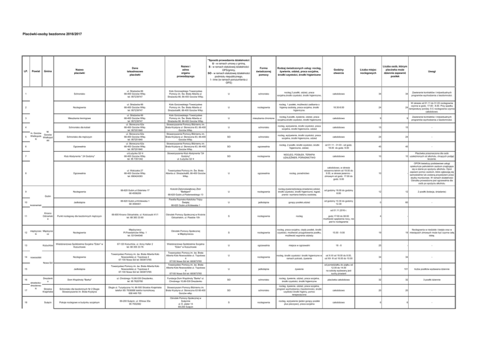 Placówki-osoby bezdomne 2016/2017 Nazwa placówki Dane teleadresowe placówki Nazwa i adres organu prowadzącego "Sposób prowadzenia działalności: U - w ramach umowy z gminą, S - w ramach statutowej działalności OPS/gminy, SO - w ramach statutowej działalności podmiotu niepublicznego, I - inne (w ramach porozumienia z OPS) 1 Schronisko ul. Strażacka 66 66-400 Gorzów Wlkp. tel. 957239747 Koło Gorzowskiego Towarzystwa Pomocy im. Św. Brata Alberta ul. Strażacka 66, 66-400 Gorzów Wlkp. U schronisko nocleg,3 posiłki, odzież, praca socjalna,środki czystości, środki higieniczne, całodobowo 34 34 Zawieranie kontraktów i indywidualnych programów wychodzenia z bezdomności. 2 Noclegownia ul. Strażacka 66 66-400 Gorzów Wlkp. tel. 957239747 Koło Gorzowskiego Towarzystwa Pomocy im. Św. Brata Alberta ul. Strażacka66, 66-400 Gorzów Wlkp. U noclegownia nocleg, 1 posiłek, możliwości zadbania o higienę osobistą, praca socjalna, środki higieniczne. 18.30-8.00 24 24 W okresie od 01.11 do 31.03 noclegownia czynna w godz. 17.00 - 8.00. Przy spadku temperatury poniżej -5 C noclegownia czynna całodobowo. 3 Mieszkania treningowe ul. Strażacka 66 66-400 Gorzów Wlkp. tel. 957239747 Koło Gorzowskiego Towarzystwa Pomocy im. Św. Brata Alberta ul. Strażacka 66, 66-400 Gorzów Wlkp. U mieszkania chronione nocleg,3 posiłki, żywienie, odzież, praca socjalna,środki czystości, środki higieniczne całodobowo 9 9 Zawieranie kontraktów i indywidualnych programów wychodzenia z bezdomności. 4 Schronisko dla kobiet ul. Słoneczna 62a 66-400 Gorzów Wlkp. tel. 957201840 Stowarzyszenie Pomocy Bliźniemu im. Brata Krystyna ul. Słoneczna 63, 66-400 Gorzów Wlkp. U schronisko nocleg, wyżywienie, środki czystości, praca socjalna, środki higieniczne, odzież całodobowo 15 15 - Schronisko dla mężczyzn ul. Słoneczna 62a 66-400 Gorzów Wlkp. tel. 957201840 Stowarzyszenie Pomocy Bliźniemu im. Brata Krystyna ul. Słoneczna 63, 66-400 Gorzów Wlkp. SO schronisko nocleg, wyżywienie, środki czystości, praca socjalna, środki higieniczne, odzież całodobowo 24 24 - 6 Ogrzewalnia ul. Słoneczna 62a 66-400 Gorzów Wlkp. tel. 957201840 Stowarzyszenie Pomocy Bliźniemu im. Brata Krystyna ul. Słoneczna 63, 66-400 Gorzów Wlkp. SO ogrzewalnia nocleg, 2 posiłki, środki czystości, środki higieniczne, odzież, od 01.11 - 31.03 - od godz. 18.00 do godz. 9.00 45 45 - 7 Klub Abstynenta " 24 Godziny" ul.Łużycka 32/ 4 66-400 Gorzów Wlkp. tel. 95 7351342 Stowarzyszenie Klub Abstynenta "24 Godziny" ul. Łużycka 32/ 4 SO noclegownia NOCLEG, POSIŁEK, TERAPIA UZALEŻNIEŃ, PORADNICTWO całodobowo 10 Placówka przeznaczona dla osób 10 uzależnionych od alkoholu, chcących podjąć leczenie. 10 OPON świadczy podstawowe usługi opiekuńcze pełnoletnim osobom znajdujące się w stanie po spożyciu alkoholu. Opon zapewni pomoc osobom, które zgłaszają się samodzielnie lub zostaną przywiezieni przez służby mundurowe. W ramach działalności Ośrodka prowadzona jest ogrzewalnia dla osób po spożyciu alkoholu. LP. 5 Powiat Gmina M. m. Gorzów Gorzów Wielkopols Wielkopol ki ski Forma świadczonej pomocy Rodzaj świadczonych usług: nocleg, żywienie, odzież, praca socjalna, środki czystości, środki higieniczne Godziny otwarcia Liczba osób, którym placówka może dziennie zapewnić posiłek Liczba miejsc noclegowych Uwagi 8 Ogrzewalnia ul. Walczaka 27 66-400 Gorzów Wlkp. tel. 690424383 Towarzystwa Pomocy im. Św. Brata Alberta ul. Strażacka66, 66-400 Gorzów Wlkp. U ogrzewalnia nocleg, poradnictwo całodobowo, w okresie wiosenno-letnim od 19.00 do 9.00, w okresie jesienno zimowym od godz. 17.00 do godz. 9.00 9 Noclegownia 66-620 Gubin,ul.Gdańska 17 68 4558209 Kościół Zielonoświątkowy Zbór "Betlejem" 66-620 Gubin,ul.Paderewskiego 13 U noclegownia nocleg,żywienie(kolacja,śniadanie),odzież, środki czystości, środki higieniczne, kąpiel, pranie i wymiana bielizny osobistej. od godziny 18.00 do godziny 8.00 12 12 2 posiłki (kolacja, śniadanie) Jadłodajnia 66-620 Gubin,ul.Królewska 1 68 3594401 Parafia Rzymsko-Katolicka Trójcy Świętej 66-620 Gubin,ul.Królewska 1 U jadłodajnia gorący posiłek,odzież od godziny 10.30 do godziny 12.30 0 60 - Punkt noclegowy dla bezdomnych mężczyzn 66-600 Krosno Odrzańskie, ul. Kościuszki 41/1 tel. 68 383 33 60 Ośrodek Pomocy Społecznej w Krośnie Odrzańskim, ul. Piastów 10h S noclegownia nocleg godz.17:00 do 08:00 możliwość spędzenia nocy, nie jest to noclegownia 4 - Noclegownia Międzyrzecz Pl.Powstańców Wlkp. 1 tel. 531044548 Ośrodek Pomocy Społecznej w Międzyrzeczu S noclegownia nocleg, praca socjalna, ciepły posiłek, środki czystości, możliwość przygotowania posiłku, możliwość wyprania odzieży 15.00 - 9.00 19 Wielobranżowa Spółdzielnia Socjalna "Eden" w Kożuchowie 67-120 Kożuchów, ul. Anny Haller 2 tel. 68 355 33 76 Wielobranżowa Spółdzielnia Socjalna "Eden" w Kożuchowie U ogrzewalnia miejsce w ogrzewalni 18 - 8 25 - - Noclegownia Towarzystwo Pomocy im. św. Brata Alberta Koło Nowosolskie ul. Topolowa 4 67-100 Nowa Sól tel: 683873765 Towarzystwo Pomocy im. św. Brata Alberta Koło Nowosolskie ul. Topolowa 4 67100 Nowa Sól tel: 683873765 noclegownia nocleg, środki czystości i środki higieniczne w ramach potrzeb, żywienie od X-XI od 18.00 do 8.00, od XII- III od 16.00 do 10.00 34 34 - Jadłodajnia Towarzystwo Pomocy im. św. Brata Alberta Koło Nowosolskie ul. Topolowa 4 67-100 Nowa Sól tel: 683873765 Towarzystwo Pomocy im. św. Brata Alberta Koło Nowosolskie ul. Topolowa 4 67100 Nowa Sól tel: 683873765 U jadłodajnia żywienie od poniedziałku do piątku od 12.00 do 14.00 na sobotę wydawany jest suchy prowiant 0 101 liczba posiłków wydawana dziennie Drezdenk o Dom Wspólnoty "Barka" ul. Chrobrego 10,66-530 Drezdenko, tel. 95 7620780 Fundacja Dom Wspólnoty "Barka" ul. Chrobrego 10,66-530 Drezdenko SO schronisko nocleg, żywienie, odzież, praca socjalna, środki czystości, śro
