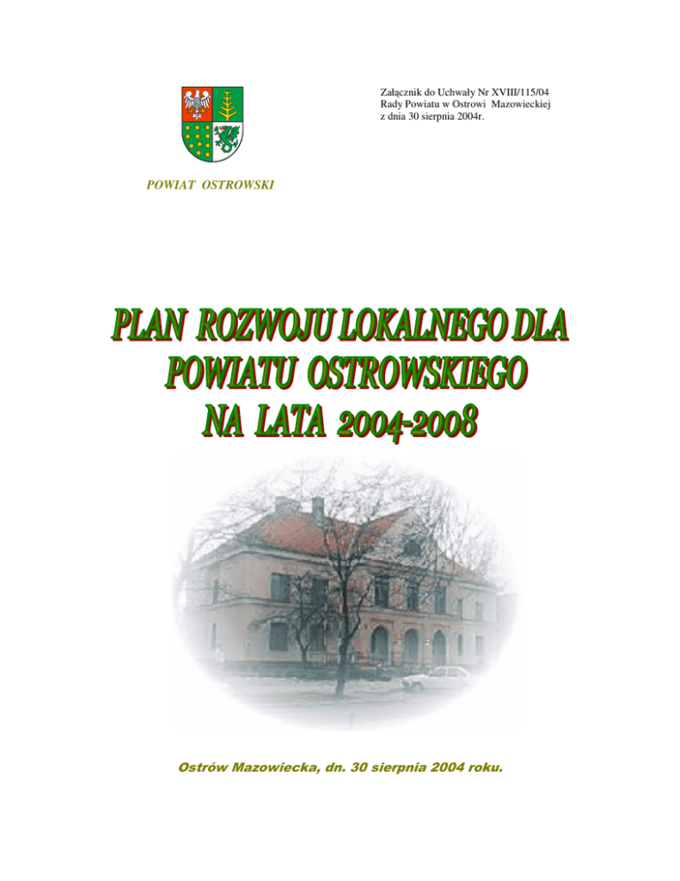 Zał cznik do Uchwały Nr XVIII/115/04 Rady Powiatu w Ostrowi Mazowieckiej z dnia 30 sierpnia 2004r. POWIAT OSTROWSKI PROJEKT Wst p Niniejszy Plan Rozwoju Lokalnego dla Powiatu Ostrowskiego na lata 2004-2008 opracowany został dla stworzenia mo liwo ci decyzyjnych w sprawach podejmowania przedsi wzi inwestycyjnych w zakresie rzeczowym oraz finansowym w dłu szej perspektywie czasowej. Decyzje te pozwol na wcze niejsze podj cie prac przygotowawczych dla projektów inwestycyjnych, które umo liwi pozyskiwanie ródeł finansowych z odpowiednim wyprzedzeniem. Plan Rozwoju Lokalnego został opracowany według wytycznych Zintegrowanego Programu Rozwoju Lokalnego ( działanie 3.1. Obszary wiejskie i 3.2. Obszary podlegaj ce restrukturyzacji). W ramach obu działa do realizacji przewiduje si projekty inwestycyjne zlokalizowane na obszarach wiejskich oraz miast do 20.000 mieszka ców, wynikaj ce z Planu Rozwoju Lokalnego. Przygotowany przez nas dokument, jest dokumentem krocz cym oraz ma charakter poznawczy, pozwalaj cy na rozpoznanie obecnego stanu rozwoju i wyodr bnieniu uwarunkowa sprzyjaj cych jego rozwojowi. 2 I. OBSZAR I CZAS REALIZACJI PLANU ROZWOJU LOKALNEGO Obszar realizacji Planu Rozwoju Lokalnego dla Powiatu Ostrowskiego na lata 20042008 obejmuje swoim zasi giem teren powiatu ostrowskiego, a czas realizacji zostaje uzale niony od okresów programowania. Niniejszy Plan stworzony został metod indukcyjn na podstawie Strategii Rozwoju Powiatu Ostrowskiego i Strategii Gmin oraz na podstawie studiów uwarunkowa i zagospodarowania przestrzennego gmin. Projekty uj te w Planie Rozwoju Lokalnego zostały podzielone na kategorie w zale no ci od zakresu jego obejmowania. S to: 1. Infrastruktura techniczna 2. Infrastruktura społeczna 3. Infrastruktura kulturalna II. CHARASKTERYSTYKA OBECNEJ – GOSPODARCZEJ POWIATU OSTROWSKIEGO SYTUACJI SPOŁECZNO 1. Poło enie geograficzne, powierzchnia, ludno Powiat Ostrowski le y na terenie Mi dzyrzecza Łom y skiego mi dzy dolinami Narwi i Bugu. Jest poło ony w rodkowo – wschodniej cz ci województwa mazowieckiego na granicy z województwem podlaskim. Od północy s siaduje z powiatem ostroł ckim, łom y skim i zambrowskim; od wschodu z powiatem wysokomazowieckim; od południa z powiatem sokołowskim i w growskim; od zachodu z powiatem wyszkowskim. W skład powiatu ostrowskiego wchodzi 11 jednostek samorz du, terytorialnego w tym: miasto Ostrów Maz., miasto i gmina Brok oraz gminy: Małkinia Górna, Ostrów Maz., Stary Luboty i W sewo z byłego województwa ostroł ckiego, Andrzejewo, Boguty Pianki, Nur, Szulborze Wielkie i Zar by Ko cielne z byłego województwa łom y skiego. Obecnie powiat ostrowski, pod wzgl dem zajmowanej powierzchni jest drugi co do wielko ci w byłym województwie ostroł ckim. Ogólna powierzchnia powiatu wynosi 1 218 km2, z czego procentowo: Andrzejewo 9,7% Boguty Pianki 7,3% Brok 9% Małkinia Górna 11% Nur 7,9% Ostrów Mazowiecka – miasto 1,8% Ostrów Mazowiecka – gmina 23,3% Stary Luboty 9% Szulborze Wielkie 3,9% W sewo 9,8% Zar by Ko cielne 7,3% 3 Spo ród wszystkich miast i gmin powiatu ostrowskiego najwi kszy udział w ogólnej powierzchni powiatu stanowi gmina Ostrów Mazowiecka (23,3%), natomiast najmniejszy udział stanowi miasto Ostrów Mazowiecka, który wynosi 1,8% ogólnej powierzchni powiatu. Tabela nr 1. Sie osadnicza powiatu – stycze 2004 r. Gmina/miasto Powierzchnia w km2 Andrzejewo 118,64 Boguty Pianki 89,13 Brok 110,21 Małkinia Górna 134,08 Nur 95,8 Ostrów Mazowiecka – miasto 22,1 Ostrów Mazowiecka – gmina 284 Stary Luboty 109,16 Szulborze Wielkie 47,6 W sewo 119 Zar by Ko cielne 88,9 Powiat 1 218 ródło: Urz dy Gmin i Miast w powiecie ostrowskim Liczba miejscowo ci 35 wsi, w tym 30 stołectw 56 wsi, w tym 28 stołectw 1 miasto, 5 wsi, w tym 4 stołectwa 27 wsi, w tym 26 stołectw 26 wsi, w tym 21 stołectw 1 miasto 46 wsi, w tym 41 stołectw 27 wsi, w tym 25 stołectw 17 wsi, w tym 17 stołectw 32 wsi, w tym 31 stołectw 33 wsi, w tym 31 stołectw 2 miasta, 304 wsi, w tym 254 stołectw Powiat ostrowski liczy 78 539 osób. G sto zaludnienia wynosi 64 osoby na 1/km2 i jest zbli ona do redniej ogólnej s siednich powiatów. Tabela nr 2. Struktura zaludnienia w powiecie ostrowskim w latach 1999-2004 Gmina/miasto G sto zaludnienia na 2002r 1999 2000 2001 Ogółem Ogółem Ogółem Ogółem 4 785 3 183 2 888 12 749 3 782 23 097 13 383 4 197 2 086 4 924 4 127 79 201 4 767 3 157 2 900 12 695 3 763 23 267 13 322 4 186 2 074 4 896 4 084 79 111 Andrzejewo 30,79 4 838 4 795 Boguty Pianki 35,40 3 246 3 248 Brok 26,31 2 888 2 868 Małkinia Górna 94,17 12 964 12 838 Nur 36,89 3 865 3 821 Ostrów Maz. – m 1052,8 22 911 23 020 Ostrów Maz. – g 53,71 13 435 13 404 Stary Luboty 38,31 4 315 4 220 Szulborze Wlk 43,57 2 090 2 091 W sewo 41,14 5 006 4 957 Zar by Ko c. 45,90 4 175 4 160 Powiat 136,3 79 733 79422 ródło: Urz dy Gmin i Miast w powiecie ostrowskim 2002 2003 Ogółem Stycze 2004 Ogołem 4 753 3 105 2 953 12 697 3 693 23 220 13 253 4 146 2 030 4 858 4 053 78 761 4 753 3 105 2 953 12 697 3 471 23 220 13 253 4 146 2 030 4 858 4 053 78 539 W roku 2003 w miastach zamieszkiwało 26173 osób, co stanowi 33% ogółu ludno ci w powiecie, natomiast ludno zamieszkuj ca miasto Ostrów Maz. stanowi prawie 90% ludno ci miejskiej. Na przełomie ostatnich 4 lat nast pił nieznaczny spadek liczby ludno ci o 0,78%. 2. rodowisko przyrodnicze 2.1. Jako powietrza Główne ródła zanieczyszcze powietrza zlokalizowane s w Ostrowi Maz. i Małkini. Na terenie pozostałych gmin wyst puj lokalne małe ródła o niewielkiej emisji 4 zanieczyszcze do powietrza. S to takie obiekty, jak: piekarnie, kotłownie centralnego ogrzewania w obiektach u yteczno ci publicznej (przychodnie zdrowia, szkoły, małe zakłady usługowe itp.) oraz kotłownie indywidualnych budynków mieszkalnych. ródła te w miejscach zag szczonej zabudowy (miejscowo ci o zwartej zabudowie) mog by stosunkowo uci liwe dla otoczenia w okresie grzewczym, gdy prz
