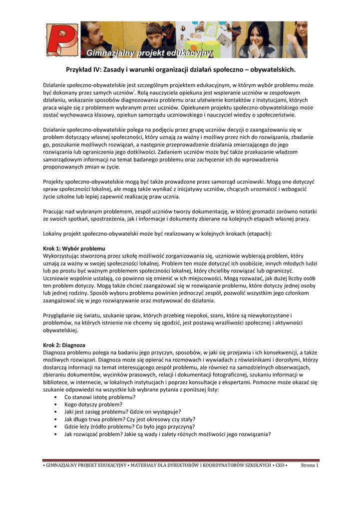 Przykład IV: Zasady i warunki organizacji działao społeczno – obywatelskich. Działanie społeczno-obywatelskie jest szczególnym projektem edukacyjnym, w którym wybór problemu może i byd dokonany przez samych uczniów . Rolą nauczyciela opiekuna jest wspieranie uczniów w zespołowym działaniu, wskazanie sposobów diagnozowania problemu oraz ułatwienie kontaktów z instytucjami, których praca wiąże się z problemem wybranym przez uczniów. Opiekunem projektu społeczno-obywatelskiego może zostad wychowawca klasowy, opiekun samorządu uczniowskiego i nauczyciel wiedzy o społeczeostwie. Działanie społeczno-obywatelskie polega na podjęciu przez grupę uczniów decyzji o zaangażowaniu się w problem dotyczący własnej społeczności, który uznają za ważny i możliwy przez nich do rozwiązania, zbadanie go, poszukanie możliwych rozwiązao, a następnie przeprowadzenie działania zmierzającego do jego rozwiązania lub ograniczenia jego dotkliwości. Zadaniem uczniów może byd także przekazanie władzom samorządowym informacji na temat badanego problemu oraz zachęcenie ich do wprowadzenia proponowanych zmian w życie. Projekty społeczno-obywatelskie mogą byd także prowadzone przez samorząd uczniowski. Mogą one dotyczyd spraw społeczności lokalnej, ale mogą także wynikad z inicjatywy uczniów, chcących urozmaicid i wzbogacid życie szkolne lub lepiej zapewnid realizację praw ucznia. Pracując nad wybranym problemem, zespół uczniów tworzy dokumentację, w której gromadzi zarówno notatki ze swoich spotkao, spostrzeżenia, jak i informacje i dokumenty zbierane na kolejnych etapach własnej pracy. Lokalny projekt społeczno-obywatelski może byd realizowany w kolejnych krokach (etapach): Krok 1: Wybór problemu Wykorzystując stworzoną przez szkołę możliwośd zorganizowania się, uczniowie wybierają problem, który uznają za ważny w swojej społeczności lokalnej. Problem ten może dotyczyd ich osobiście, innych młodych ludzi lub po prostu byd ważnym problemem społeczności lokalnej, który chcieliby rozwiązad lub ograniczyd. Uczniowie wspólnie ustalają, co powinno się zmienid w ich miejscowości. Mogą rozważad, jak dużej liczby osób ten problem dotyczy. Mogą także chcied zaangażowad się w rozwiązanie problemu, które dotyczy jednej osoby lub jednej rodziny. Sposób wyboru problemu powinien jednoczyd zespół, pozwolid wszystkim jego członkom zaangażowad się w jego rozwiązywanie oraz motywowad do działania. Przyglądanie się światu, szukanie spraw, których przebieg niepokoi, szans, które są niewykorzystane i problemów, na których istnienie nie chcemy się zgodzid, jest postawą wrażliwości społecznej i aktywności obywatelskiej. Krok 2: Diagnoza Diagnoza problemu polega na badaniu jego przyczyn, sposobów, w jaki się przejawia i ich konsekwencji, a także możliwych rozwiązao. Diagnoza może się opierad na rozmowach i wywiadach z rówieśnikami i dorosłymi, którzy dostarczą informacji na temat interesującego zespół problemu, ale również na samodzielnych obserwacjach, zbieraniu dokumentów, wycinków prasowych, relacji i dokumentacji fotograficznej, szukaniu informacji w bibliotece, w internecie, w lokalnych instytucjach i poprzez konsultacje z ekspertami. Pomocne może okazad się szukanie odpowiedzi na wszystkie lub wybrane pytania z poniższej listy: • Co stanowi istotę problemu? • Kogo dotyczy problem? • Jaki jest zasięg problemu? Gdzie on występuje? • Jak długo trwa problem? Czy jest okresowy czy stały? • Gdzie leży źródło problemu? Co było jego przyczyną? • Jak rozwiązad problem? Jakie są wady i zalety różnych możliwości jego rozwiązania? ⦁ GIMNAZJALNY PROJEKT EDUKACYJNY ⦁ MATERIAŁY DLA DYREKTORÓW I KOORDYNATORÓW SZKOLNYCH ⦁ CEO ⦁ Strona 1 Określeniu działao, których zespół uczniów chce się podjąd, będzie służyło rozpoznanie możliwych sposobów rozwiązania problemu. Przyda się np. zebranie informacji, jak ten sam lub podobny problem rozwiązuje się w innych miejscowościach, a może też w innych krajach? Krok 3: Wyznaczenie celu działao i opracowanie rozwiązania problemu Po zakooczeniu diagnozy uczniowie w formie dyskusji analizują uzyskane informacje i decydują, co chcą w swojej społeczności zmienid, poprawid, w jaki sposób ją wzbogacid. Wybierają też sposób, w jaki chcą, aby rozpoznany problem został rozwiązany lub, co częściej jest możliwe, ograniczony. Starają się wybrad cel lub cele swojego działania, które są konkretne i realne, czyli w zasięgu ich możliwości, a zarazem na tyle dla nich ważne i atrakcyjne, by budziły chęd działania. Uczniowie mogą chcied wpłynąd na dorosłych lub na służby publiczne, aby inaczej działały. Mogą też chcied sami podjąd działanie rozwiązujące rozpoznany problem lub zmniejszające jego dotkliwośd. Bardzo rzadko udaje się całkowicie usunąd poważny problem. Jednak jasne określenie realnego celu działania (np. zwrócenie uwagi mieszkaoców na dany problem) sprawi, że po zakooczeniu projektu uczniowie będą mieli poczucie sukcesu i chęd do dalszego zaangażowania, a nie przekonanie o porażce. Po wyznaczeniu celów uczniowie przystępują do opracowania własnego planu działao. Przygotowują podział zadao w zespole, harmonogram, wybierają moment, kiedy zakooczą własne przedsięwzięcie. Dzieląc zadania pomiędzy członków zespołu, starają się wszystkim przypisad zadania, za które będą odpowiedzialni oraz ustalają, kto kogo będzie wspierał, kto komu pomagał. Uczniowie wiedzą, że projekt realizowany zespołowo wymaga wzajemnej pomocy w realizacji indywidualnych zadao. Uczniowie z pomocą nauczyciela przygotowują harmonogram – tabelę, do której wpisują zadania cząstkowe, osoby odpowiedzialne i wspierające, a także sposób działania, potrzebne materiały i zasoby oraz terminy. Krok 4: Szukamy sojuszników Sukcesowi w realizacji projekt
