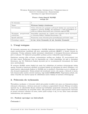 Wydział Elektrotechniki, Informatyki i Telekomunikacji Instytut Informatyki i Elektroniki Instrukcja do zajęć laboratoryjnych Praca z bazą danych MySQL wersja 2.0 Nr ćwiczenia: 7 Temat: Wybrane funkcje wbudowane Cel ćwiczenia: Celem ćwiczenia jest poznanie wybranych funkcji oraz operatorów dostępnych w serwerze MySQL. Ich znajomość w wielu przypadkach pozwala na większą elastyczność przy tworzeniu zapytań SQL. Wymagane przygotowanie teoretyczne: Samodzilne zapoznanie się z opisem oraz sposobem użycia używanych w ćwiczeniu funkcji. Najlepiej korzystając z [3]. Sposób zaliczenia: Pozytywna ocena ćwiczenia przez prowadzącego pod koniec zajęć. Prowadzący zajęcia: dr inż. Artur Gramacki, dr inż. Jarosław Gramacki 1. Uwagi wstępne W ćwiczeniu zapoznasz się z dostępnymi w MySQL funkcjami wbudowanymi. Zagadnienie zostanie przedstawione (podobnie jak przy omawianiu polecenie SELECT) w formie ćwiczeń do wykonania. Twoim zadaniem będzie natomiast odnalezienie w dostępnej literaturze informacji jak to wykonać. W większości przypadków podamy pewne wskazówki naprowadzające. Omówione zostaną tylko wybrane, najważniejsze według nas, funkcje. W rzeczywistości jest ich dużo więcej. Zachęcamy więc do zapoznania się z nimi odnajdując ich opis w dostępnej literaturze, np. [3]. Niektórych funkcji używałeś już we wcześniejszych ćwiczeniach, być może nieco nieświadomie. W serwerze MySQL nazwa funkcji nie może być oddzielona od nawiasu otwierającego żadną spacją. Pozwala to parserowi odróżnić wywołanie funkcji od odwołania do tabeli i kolumny o tej samej nazwie, jaką posiada funkcja (w MySQL jest to możliwe!). Dozwolone są za to odstępy po obu stronach argumentów. Można jednak tak uruchomić serwer, aby spacje, o których tu mowa były dopuszczalne (należy ustawić zmienną -sql-mode=IGNORE SPACE). Sugerujemy jednak, aby mimo wszystko nie używać spacji do oddzielania nazwy funkcji od nawiasu otwierającego. 2. Polecenia do wykonania Warunkiem uzyskania w ćwiczeniu takich jak poniżej wyników jest praca na demonstracyjnym schemacie relacyjnym, o którym mowa jest w jednym z poprzednich ćwiczeń. Dlatego też należy upewnić się, że odpowiedni skrypt wykonał się bezbłędnie (poprawnie utworzyły się wszystkie tabele oraz załadowały się wszystkie dane). Dla pewności warto przed rozpoczęciem ćwiczenia po prostu utworzyć schemat od nowa, nawet jeżeli wydaje ci się, że ten, który masz aktualnie zainstalowany jest poprawny. 2.1. Funkcje operujące na łańcuchach Ćwiczenie 1 Przygotowali: dr inż. Artur Gramacki, dr inż. Jarosław Gramacki 1 W trakcie porównywania łańcuchów MySQL nie uwzględnia wielkości liter. Przykładowo poniższe polecenie zwróci jeden rekord, mimo że nazwisko pracownika jest napisane bez dbałości o zachowanie wielkości liter: mysql> SELECT last_name, salary FROM emp WHERE last_name LIKE ’noZAki’; +-----------+---------+ | last_name | salary | +-----------+---------+ | Nozaki | 1200.00 | +-----------+---------+ 1 row in set (0.00 sec) Należy zmodyfikować powyższe zapytanie SQL tak, aby wielkość liter była honorowana. Ponadto należy odnaleźć w dokumentacji informację jak można zdefiniować kolumnę łańcuchową (CHAR, VARCHAR TINYTEXT, TEXT, MEDIUMTEXT, LONGTEXT), aby na trwałe wymusić uwzględnianie wielkości liter. Utworzyć następnie przykładową tabelę oraz sprawdzić „nieczułość” na wielkość liter. Ćwiczenie 2 Wyświetlić dane o pracowniku. Użyć funkcji CONCAT. Jako wynik powinniśmy otrzymać: +--------------------+ | Pracownik Ngao | +--------------------+ | -->LaDoris-Ngao<-- | +--------------------+ 1 row in set (0.00 sec) Ćwiczenie 3 Wyświetlić dane o pracowniku, których nazwiska zaczynają się na literę D. Zwróć uwagę, że wyświetlany tekst został uzupełniony do 20 znaków (policz to) sekwencją znaków #*. Należy użyć funkcji RPAD. Czym różni się w działaniu funkcja LPAD? Jako wynik powinniśmy otrzymać: +----------------------+ | Pracownicy | +----------------------+ | Dumas#*#*#*#*#*#*#*# | | Dancs#*#*#*#*#*#*#*# | +----------------------+ 2 rows in set (0.01 sec) Ćwiczenie 4 Wyświetlić nazwy regionów (tabela region). W drugiej kolumnie wyświetlono tylko 3 znaki z nazwy poczynając od 2. znaku. Użyć funkcji SUBSTR. Jako wynik powinniśmy otrzymać: +----------------------+-------------------------------+ | name | Nazwa regionu - 3 znaki od 2. | +----------------------+-------------------------------+ | Africa / Middle East | fri | | Asia | sia | | Europe | uro | | North America | ort | | South America | out | +----------------------+-------------------------------+ 5 rows in set (0.00 sec) Przygotowali: dr inż. Artur Gramacki, dr inż. Jarosław Gramacki 2 Ćwiczenie 5 Wyświetlić dane o pracownikach, których nazwiska są dłuższe niż 6 znaków. Wyświetlić długość nazwisk i imion tych pracowników i wynik posortować wg. długości nazwiska w porządku od największej do najmniejszej. Jako wynik powinniśmy otrzymać: +------------+-----------------+--------------+------------------+ | first_name | Długość imienia | last_name | Długość nazwiska | +------------+-----------------+--------------+------------------+ | Mark | 4 | Quick-To-See | 12 | | Carmen | 6 | Velasquez | 9 | | Antoinette | 10 | Catchpole | 9 | | Alexander | 9 | Markarian | 9 | | Midori | 6 | Nagayama | 8 | | Audry | 5 | Ropeburn | 8 | | Molly | 5 | Urguhart | 8 | | Sylvie | 6 | Schwartz | 8 | | Yasmin | 6 | Sedeghi | 7 | +------------+-----------------+--------------+------------------+ 9 rows in set (0.00 sec) Ćwiczenie 6 Wyświetlić nazwy regionów (tabela region). W drugiej kolumnie wszystkie litery a zostały zamienione na X. Użyć funkcji REPLACE. Jako wynik powinniśmy otrzymać: +----------------------+-------------------------+ | name | name2 | +----------------------+-------------------------+ | Africa / Middle 