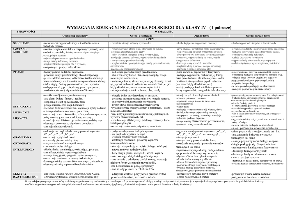WYMAGANIA EDUKACYJNE Z JĘZYKA POLSKIEGO DLA KLASY IV - ( I półrocze) SPRAWNOŚCI WYMAGANIA Ocena: dopuszczający Ocena: dostateczny UCZEŃ Ocena: dobry Ocena: bardzo dobry SLUCHANIE -słucha uważnie wypowiedzi innych, tekstów literackich, poetyckich, poleceń - rozróżnia intencje nadawcy wypowiedzi - słucha krytycznie wypowiedzi nadawcy - słucha wypowiedzi innych i wskazuje błędy CZYTANIE MÓWIENIE - uważnie czyta cicho tekst i rozpoznaje: prawdę fałsz - mówi zrozumiale, krótko, na temat, używa ubogiego - rozumie czytany głośno tekst, odpowiada na pytania -dostrzega charakterystyczne cechy - mówi wyraźnie, na temat, ale nie wyczerpująco, -nawiązuje kontakt z odbiorcą, wypowiada własne zdanie, - stosuje zasady przedstawiania się - wygłasza teksty z pamięci stosując zasady przestankowania, akcentowania -zna sposoby porozumiewania się - czyta płynnie, uwzględnia znaki interpunkcyjne - wypowiada się na temat przeczytanego tekstu - dba o precyzję w mówieniu, stosuje różnorodne słownictwo, wypowiada się na temat, ocenia postępowanie bohaterów -dostrzega sensy wyrażeń i zwrotów - wygłasza teksty z pamięci stosując modulację - recytując z pamięci moduluje głos - płynnie czyta teksty i odkrywa przenośne znaczenia -posługuje się cytatami, uzasadnia własne zdanie, - ocenia postępowanie bohaterów -posiada duży zasób słownictwa - wypowiada się elokwentnie, wyczerpująco - nadaje artystyczny wyraz recytowanym tekstom - - tworzy pytania do tekstu, odpowiada - prowadzi zeszyt przedmiotowy, dba o kompozycję - pisze czytelnie, na temat, odtwórczo, krótko, eliminuje potok składniowy, ma trudności we wprowadzaniu dialogu w tekst ciągły, ćwiczy poprawność ort., int. wyrazów - redaguje notatkę, przepis, dialog, plan, opis postaci, przedmiotu, obrazu ( używa minimum 70 słów) - na bieżąco prowadzi zeszyt przedmiotowy - dba o właściwy kształt liter, stosuje akapity, wstęp, rozwinięcie, zakończenie, - zachowuje formę, ale nie wszystkie jej elementy, temat ujęty powierzchownie, odtwórczo, zdania krótkie, częste błędy składniowe, ale zachowana logika treści, - stosuje rodzaje notatek: schemat, plan, tabelę -pisze starannie, poprawnie w łączy litery - redaguje wypowiedź, zachowuje jej formy, pisze prace twórcze, ale schematyczne, unika powtórzeń, stosuje zdania pojed. i złożone ( nieliczne błędy składniowe, ort.) - notuje, redaguje krótkie i dłuższe poznane formy wypowiedzi, uwzględnia ich elementy - prace wyróżnia estetyka, przejrzystość zapisu, - bezbłędnie posługuje się poznanymi formami wyp. -redaguje prace twórcze, oryginalne, bogate w precyzyjne słownictwo, poprawną składnię, ortografię, interpunkcję - w razie potrzeby posługuje się słownikami - redaguje poprawnie plan szczegółowy - określa nastrój utworu, osobę mówiącą - określa świat przedstawiony w utworze, - stosuje związki frazeologiczne w zdaniach - rozumie przenośne znaczenia -poprawnie buduje zdania ze związkami frazeologicznymi -tworzy baśń, -posługuje się terminem nastrój wiersza, dzieła - świadomie stosuje odpowiedną narrację - zna pojęcia: synonimy, antonimy, stosuje je -wskazuje podmiot liryczny, -stosuje wyrazy bliskoznaczne, przeciwstawne, - posługuje się poprawnie związkami frazeologicznymi - buduje zdania używając poprawnie przenośnych znaczeń związków frazeologicznych - określa funkcję głoski i -w opowiadaniu, poprawnie stosując narrację, - uzasadnia wypowiedź cytatami z tekstu - używa bogatego słownictwa - wie, z jakich słowników korzystać, jak wzbogacać wypowiedź - wyjaśnia różnicę między autorem a narratorem i języka, pełnym zdaniem - odpowiada poprawnie na pytania do tekstu -stosuje zasady kulturalnej rozmowy - recytuje 2 teksty z pamięci, dba o wymowę - rozpoznaje : gesty, znaki, słowa PISANIE - zna elem. świata fantast. i realist., - rozpoznaje tekst opowiadania, baśń, KSZTAŁCENIE LITERACKIE I JĘYKOWE GRAMATYKA ORTOGRAFIA INTERPUNKCJA - podaje miejsce, czas akcji, bohaterów -odczytuje dosłowne znaczenia, wyszukuje cytaty na temat -wskazuje dosłowne znaczenia, pouczenie, - rozpoznaje wiersz, komunikat, refren, nadawcę rym, wers, osobę mówiącą, narratora, odbiorcę, zwrotkę , -wyszukuje wyr. bliskozn., przeciwstawne, rodzinę wyr. - dostrzega, porównania, ożywienia, uosobienia - zna najważniejsze słowniki - wskazuje na przykładach zasady pisowni wyrazów z ,,ó”, ,,u”, ,,rz”, ,,ż”, ,,h”, ,,ch” - rozpoznaje wyjątki od zasad -zna zasady pisowni wielką literą -korzysta ze słownika ortograficznego - zna zasady zapisu dialogu -układa zdania: oznajmujące, rozkazujące., pytające. - zna alfabet, układa wyrazy wg alfabetu -różnicuje litery, głoski., spółgłoski., sylaby, samogłoski., - rozpoznaje odmienne cz. mowy i odmienia je -dostrzega różnicę czasowników osobowych, nieosobow. - dostrzega różnicę w pisowni bezokoliczników LEKTURY (CZYTELNICTWO) - zna teksty lektury: Pinokio, Akademia Pana Kleksa, - opowiada wydarzenia, wskazuje czas, miejsce akcji - dostrzega przenośne znaczenia słów, określa narrację, - zna cechy baśni, rozpoznaje opowiadanie - tworzy słowa bliskoznaczne, przeciwstawne -wyjaśnia różnicę między autorem a narratorem, i osobą mówiącą, adresatem -wie, kiedy i jak korzystać ze słownika j. polskiego, sł. wyrazów bliskoznacznych, ort. - zna katalogi: alfabetyczny, tytułowy, rzeczowy, kartę katalogową książki, -rozpoznaje porównania, ożywienia, uosobienia - podaje zasady pisowni trudnych wyrazów - zna przykłady wyjątków od reguł - wskazuje przykłady nazw własnych - dostrzega znaczenie i pisownię wyrazów brzmiących tak samo - stosuje interpunkcję w zapisie dialogu, zdań poj. - używa różnych rodzajów zdań, - liczy litery i głoski, samogłoski, dzieli wyrazy - wie do czego służy katalog alfabetyczny - zna pytania o odmienne części mowy, wskazuje niektóre 