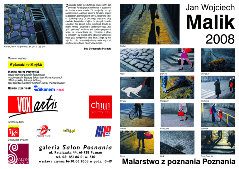 oznaƒski malarz od d∏u˝szego czasu patrzy nam pod nogi. Penetruje poznaƒskie ulice w poszukiwaniu Êladów, a mo˝e znaków. Zatrzymuje si´ i pochyla nad kamieniem, go∏´biem, cieniem, damskimi stopami na obcasach, psem gryzàcym smycz, koszem na Êmieci i Êciekowà kratkà. Co ciekawego znajduje na ulicy, chodniku, kraw´˝niku, przejÊciu dla pieszych, kawa∏ku schodów? Ano pewnie rodzaj zamyÊlenia. Chwil´ namys∏u, refleksji i skupienia w codziennym biegu. Jego „patrz pod nogi” wcale nie jest bowiem przyziemne, wcale nie przeciwstawia si´ „chodzeniu z g∏owà w chmurach”. W tej jego ziemi odbija si´ wszak du˝o nieba: pada na nià s∏oƒce, kapie deszcz. Nagle si´ okazuje, ˝e z do∏u, z malarskiej sutereny, widaç wi´cej ni˝ mog∏oby si´ wydawaç na pierwszy rzut oka. P Jan Wojciech Malik 2008 Torba Kana∏, akryl na p∏ótnie, 84 cm x 122 cm Ewa Obr´bowska-Piasecka Mecenasi wystawy Marian Marek Przybylski prezes Instytutu Edukacji Europejskiej wspó∏w∏aÊciciel Wy˝szej Szko∏y Nauk Humanistycznych i Wielkopolskiej Telewizji Kablowej, by∏y wydawca i redaktor naczelny „G∏osu Wielkopolskiego” Ptak Bianco Smycz 2 Smycz Pielgrzym Zaduma Rower Gwiazda Bariera Pizza Bruk Przechodnie Roman Szperliƒski Patroni medialni Organizator wystawy g a l e r i a S a l o n Po s n a n i a ul. Ratajczaka 44, 61-728 Poznaƒ tel. 061 851 86 01 w. 630 wystawa czynna 16-30.06.2008 w godz. 10–19 Malarstwo z poznania Poznania Tor, akryl na p∏ótnie, 180 cm x 280 cm Jana Wojciecha Malika – sceny z ˝ycia zbiorowego alarstwo Jana Wojciecha Malika zatoczy∏o pewnego typu ko∏o. Ale jak w klasycznej opowieÊci nie mo˝na powróciç do miejsca, z którego si´ wysz∏o, mo˝na jedynie uwzgl´dniajàc ca∏a przebytà drog´ – iÊç dalej. Wszystkie baraki realnego socjalizmu by∏y podobne – ró˝ni∏a je tylko sztuka. Odr´bne by∏o te˝ m∏ode polskie malarstwo komentujàce PRL-owskà rzeczywistoÊç pe∏niàce rol´ spo∏ecznej publicystyki. Âwietnie ukaza∏a to wystawa „Obraz ˝ycia” w 2007 roku w Gnieênieƒskim Muzeum Poczàtków Paƒstwa Polskiego, gdzie obecne by∏y prace Jana Wojciecha Malika. W tych˝e latach 70-ych pojawi∏a si´ polska odmiana fotorealizmu, i specyficzna odmiana „swojskiej” nowej figuracji – nawiàzujàcej do Francisa Bacona i zarazem do poetyckiej odmiany popartu. W tej kwestii – malarstwo Jana Wojciecha Malika, okaza∏o si´ zjawiskiem osobnym, wyprzedzajàcym swà epok´. Artysta w pewnych aspektach obrazowania i techniki by∏ bardziej radykalny od swych kolegów. Zaczà∏ malowaç sceny z rodzinnych zdj´ç; osoby w ró˝nym wieku, podczas wypoczynku, przeja˝d˝ki ∏ódkà, spaceru, codziennych i trywialnych zda∏oby si´ czynnoÊci. Przedstawiane nie hiperrealistycznie, a raczej plakatowo w konwencji specyfiki PRL-owskich kolorowych monide∏. Powtarzajàc koncepcje Malika – to samo zacz´li robiç w „stajni” Zderzaka w latach 90. i na poczàtku XXI wieku; Maciej Maciejowski, Marek Firek i Wilhelm Sasnal czy Rafa∏ Jakubowicz wraz z ca∏à grupà naÊladowców. W 1976 roku Jan Wojciech Malik pokazuje na konkursie malarskim imienia Jana Spychalskiego malowane akrylem p∏ótno „Uroki” przedstawiajàce anteny telewizyjne na dachach domów, otoczenie oraz wn´trza PRL-owskich mieszkaƒ. Obraz ten stanowi∏ wtedy pewien „zgrzyt” w kontekÊcie prac „metaforycznych a˝ do bólu” wi´kszoÊci uczestników wystawy. I tak jest do lat 80. W roku 1977 – w czasie za∏amania si´ gierkowskiego snu, namalowana przez artyst´ scena „Ta ∏ódê p∏ynie do raju”, ∏àczàca w sobie poprzez ironicznà poetyk´, konwencje; rodzinnego wspomnienia i propagandowego plakatu, przedstawiajàca dziewczyn´ na plastikowej ∏ódce stanowi pewnego typu symbolicznà cezur´ i memento zarazem. T∏o dla g∏ównej postaci to leÊny podmiejski pejza˝ i opalajàcy si´ m∏odzi ludzie. Praca ta zdobywa III nagrod´ w Konkursie im. Jana Spychalskiego. W czasie „dominacji” malarskich wizji Stanis∏awa MaÊluszczaka – z jednej strony – i realistycznie z∏owrogich obrazów innych polskich artystów – z drugiej, obraz Jana Wojciecha jako ikona zyskuje kapitalnà ambiwalentnà konotacj´. Z jednej strony ukazuje pozornà idyll´, a z drugiej uÊwiadamia nam, ˝e ca∏a PRL-owska rzeczywistoÊç nieuchronnie zmierza do upadku i te same sytuacje odrodzà si´ ju˝ w innej epoce – w innym kontekÊcie. M Ale czasy po roku 1981 nastajà mroczne i w obrazach Jana Wojciecha Malika czarne t∏o ju˝ ten stan antycypuje. Na tym˝e pojawiajà si´ wyrwane jakby z kontekstu przedmioty, np. czerwona ceg∏a ironicznie odnoszàca si´ do niespe∏nionych marzeƒ socrealizmu i do stylistyki kontekstu przedmiotu wynik∏ej, z „zara˝enia” popartem a potem konceptualizmem. Dalszym krokiem artysty jest cykl autoportretów w zaskakujàcych pozach i ukazanych pod nieoczekiwanymi kàtami w czerwonych czapkach, a nast´pnie twarze artysty w zbli˝eniach. Tutaj Êwiadomie Jan Wojciech Malik demonstruje malarskà struktur´ w detalu. Widaç Êlady p´dzla i poszerzona zostaje paleta barw. Przewa˝ajà jednak˝e szaroÊci, a w nich pojawiajà si´ ˝ó∏te i bia∏e – pozornie przypadkowe plamy. I poprzez to malarstwo gestu Jan Wojciech Malik przechodzi do abstrakcji, pozornie przestrzennej. Ca∏y czas jednak˝e – równolegle z tymi cyklami powstajà obrazy „rodzajowe”. Jan Wojciech nie rezygnuje z komentowania codziennoÊci. Tu wspomnieç nale˝y o namalowanych wczeÊniej – swego czasu „Aktorach”. Fotorealistycznych portretach poznaƒskich twórców teatru (i nie tylko, bo artysta do∏àcza do tego zestawy swój autoportret w tej˝e konwencji). Te obrazy to potrójne Êwiadectwo czasów. Póz, ubioru i zachowaƒ. Bardziej wiarygodne od pozowanych fotografii. Domenà fotografii jest z regu∏y stereotyp, a malarstwa – archetyp i mity. Ale i jedno i drugie ma do spe∏nienia istotnà misje