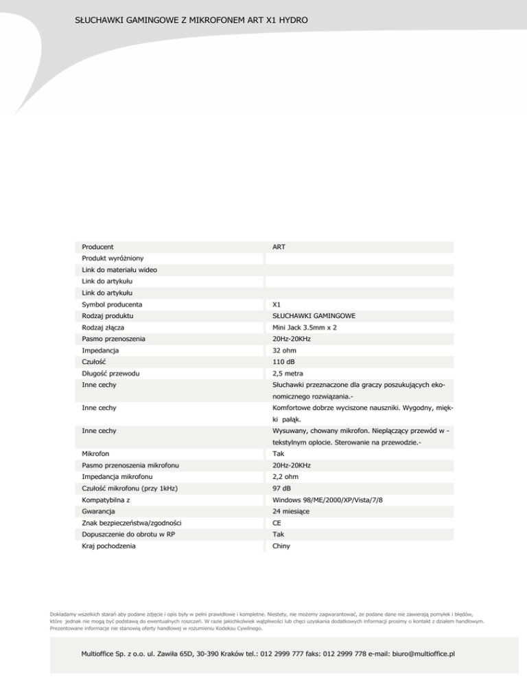 SŁUCHAWKI GAMINGOWE Z MIKROFONEM ART X1 HYDRO Producent ART Produkt wyróżniony Link do materiału wideo Link do artykułu Link do artykułu Symbol producenta X1 Rodzaj produktu SŁUCHAWKI GAMINGOWE Rodzaj złącza Mini Jack 3.5mm x 2 Pasmo przenoszenia 20Hz-20KHz Impedancja 32 ohm Czułość 110 dB Długość przewodu 2,5 metra Inne cechy Słuchawki przeznaczone dla graczy poszukujących ekonomicznego rozwiązania.- Inne cechy Komfortowe dobrze wyciszone nauszniki. Wygodny, miękki pałąk. Inne cechy Wysuwany, chowany mikrofon. Nieplączący przewód w tekstylnym oplocie. Sterowanie na przewodzie.- Mikrofon Tak Pasmo przenoszenia mikrofonu 20Hz-20KHz Impedancja mikrofonu 2,2 ohm Czułość mikrofonu (przy 1kHz) 97 dB Kompatybilna z Windows 98/ME/2000/XP/Vista/7/8 Gwarancja 24 miesiące Znak bezpieczeństwa/zgodności CE Dopuszczenie do obrotu w RP Tak Kraj pochodzenia Chiny Dokładamy wszelkich starań aby podane zdjęcie i opis były w pełni prawidłowe i kompletne. Niestety, nie możemy zagwarantować, że podane dane nie zawierają pomyłek i błędów, które jednak nie mogą być podstawą do ewentualnych roszczeń. W razie jakichkolwiek wątpliwości lub chęci uzyskania dodatkowych informacji prosimy o kontakt z działem handlowym. Prezentowane informacje nie stanowią oferty handlowej w rozumieniu Kodeksu Cywilnego. Multioffice Sp. z o.o. ul. Zawiła 65D, 30-390 Kraków tel.: 012 2999 777 faks: 012 2999 778 e-mail: [email protected]