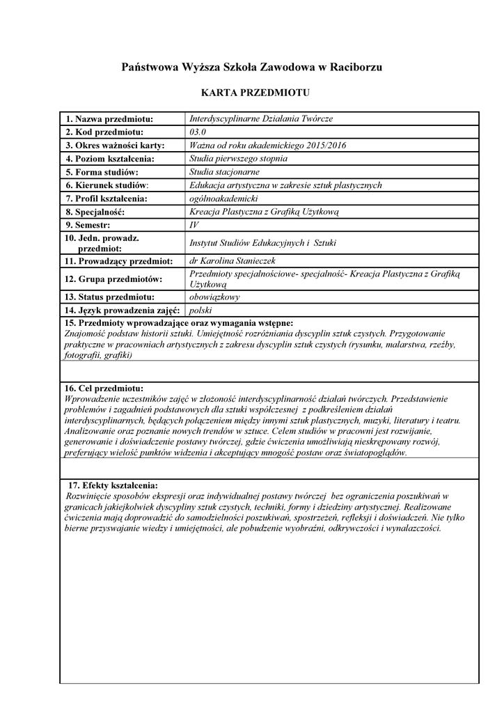 Państwowa Wyższa Szkoła Zawodowa w Raciborzu KARTA PRZEDMIOTU 1. Nazwa przedmiotu: 2. Kod przedmiotu: 3. Okres ważności karty: 4. Poziom kształcenia: 5. Forma studiów: 6. Kierunek studiów: 7. Profil kształcenia: 8. Specjalność: 9. Semestr: 10. Jedn. prowadz. przedmiot: 11. Prowadzący przedmiot: Interdyscyplinarne Działania Twórcze 03.0 Ważna od roku akademickiego 2015/2016 Studia pierwszego stopnia Studia stacjonarne Edukacja artystyczna w zakresie sztuk plastycznych ogólnoakademicki Kreacja Plastyczna z Grafiką Użytkową IV Instytut Studiów Edukacyjnych i Sztuki dr Karolina Stanieczek Przedmioty specjalnościowe- specjalność- Kreacja Plastyczna z Grafiką 12. Grupa przedmiotów: Użytkową 13. Status przedmiotu: obowiązkowy 14. Język prowadzenia zajęć: polski 15. Przedmioty wprowadzające oraz wymagania wstępne: Znajomość podstaw historii sztuki. Umiejętność rozróżniania dyscyplin sztuk czystych. Przygotowanie praktyczne w pracowniach artystycznych z zakresu dyscyplin sztuk czystych (rysunku, malarstwa, rzeźby, fotografii, grafiki) 16. Cel przedmiotu: Wprowadzenie uczestników zajęć w złożoność interdyscyplinarność działań twórczych. Przedstawienie problemów i zagadnień podstawowych dla sztuki współczesnej z podkreśleniem działań interdyscyplinarnych, będących połączeniem między innymi sztuk plastycznych, muzyki, literatury i teatru. Analizowanie oraz poznanie nowych trendów w sztuce. Celem studiów w pracowni jest rozwijanie, generowanie i doświadczenie postawy twórczej, gdzie ćwiczenia umożliwiają nieskrępowany rozwój, preferujący wielość punktów widzenia i akceptujący mnogość postaw oraz światopoglądów. 17. Efekty kształcenia: Rozwinięcie sposobów ekspresji oraz indywidualnej postawy twórczej bez ograniczenia poszukiwań w granicach jakiejkolwiek dyscypliny sztuk czystych, techniki, formy i dziedziny artystycznej. Realizowane ćwiczenia mają doprowadzić do samodzielności poszukiwań, spostrzeżeń, refleksji i doświadczeń. Nie tylko bierne przyswajanie wiedzy i umiejętności, ale pobudzenie wyobraźni, odkrywczości i wynalazczości. Ozn. Metody realizacji modułów kształcenia Opis efektu kształcenia Ma podstawową wiedzę dotyczącą wykonania prac artystycznych związanych z ich kierunkiem studiów i wybranej specjalności, Posiada wiedzę dotyczącą środków ekspresji i umiejętności warsztatowych pokrewnych dyscyplin sztuki. W Definiuje rozwój poszczególnych dyscyplin artystycznych w dziejach sztuki oraz zna publikacje związane z tematem. Orientuje się w zakresie powiązanej z technologiami stosowanymi w sztuce. Metody weryfikacji zakładanych efektów kształcenia Forma prowadze nia zajęć Odniesienie do efektów dla kierunku studiów K_W01 Miniwykłady, rozmowy dydaktyczne, ćwiczenia praktyczne Praca semestralnazestaw ćwiczeń K_W02 Pracownia artystyczna Korekta prac K_W04 K_W06 Ma świadomość zależności pomiędzy teoretycznymi i praktycznymi elementami studiów. Wykazuje się umiejętnością wnikliwej i świadomej percepcji. K_U01 Potrafi tworzyć i realizować własne wizje artystyczne oraz posiada umiejętności potrzebne do ich wyrażenia. Umie w sposób świadomy użyć narzędzi tradycyjnego warsztatu artystycznego w wybranych terytoriach działalności artystycznej jak i również użyć właściwej nowoczesnej techniki (np. techniki cyfrowej) do realizacji pracy artystycznej. U Dysponuje umiejętnościami realizacji prac plastycznych eksperymentowania w Posiada zdolność do współpracy z innymi osobami w ramach prac zespołowych (także o charakterze interdyscyplinarnym) K_U03 Miniwykłady, rozmowy dydaktyczne, ćwiczenia praktyczne Praca semestralnazestaw ćwiczeń K_U04 Pracownia artystyczna Korekta prac K_U05 K_U06 K_U07 Posiada umiejętność swobodnej wypowiedzi (ustnej i pisemnej) na temat dziedzin działalności artystycznej. K_U08 Dysponuje umiejętnością realizacji prezentacji publicznej. K_U09 Ma potrzebne wykształcenie do uczenia w zakresie edukacji artystycznej. K_U10 W różnych sytuacjach jest zdolny do efektywnego wykorzystania zdolności elastycznego myślenia, adaptowania się do nowych i zmieniających się okoliczności. K_Ks06 Potrafi obiektywnie ocenić własna prace. Potrafi być krytyczny wobec siebie i innych. K K_U02 Wykazuje się umiejętnościami efektywnego porozumiewania się oraz egzystowania w społeczeństwie, co w szczególności dotyczy pracy zespołowej w kręgu wspólnych projektów i działań. Wykazujecie umiejętnościami efektywnego komunikowania się i życia w społeczeństwie przy użyciu nowych technologii informacyjnych Miniwykłady, rozmowy dydaktyczne, ćwiczenia praktyczne Praca semestralnazestaw ćwiczeń Korekta prac K_Ks07 Pracownia artystyczna K_Ks08 K_Ks10 K_Ks 14 18. Formy i wymiar zajęć: W: Stacjonarne Ćw: Pracownia artystyczna (ćwiczenia)- 45 godz. Niestacjonarne W: Ćw: Pracownia artystyczna (ćwiczenia) 19. Treści kształcenia: Program przedmiotu zakłada indywidualne podejście do studenta i pobudzenie do podejmowania samodzielnych decyzjotwórczych poprzez kształcenie umiejętności podejmowania właściwych hierarchizacji środków. Studenci będą pracowali indywidualnie oraz w mniejszych grupach. Działania będą dokumentowane, co będzie stanowiło ważną część każdego zadania. Projekty będą poprzedzane korektami indywidualnymi i zbiorowymi Szczegółowy program zajęć Tematyka zajęć - wykłady L p. Liczba godzin ST NST Łączna liczba godzin - wykłady Tematyka zajęć - ćwiczenia L p. 1. 2. Wprowadzenie, omówienie tematyki zajęć Mini wykład konwersatoryjny na temat ruchów interdyscyplinarnych w sztuce 1 2 3. Wykonanie kolażu artystycznego poprzedzone mini wykładem na temat historii kolażu jako techniki artystycznej 6 4. Wykonanie brikolażu poprzedzone mini wykładem na temat dadaizmu i surrealizmu 9 5. Wykonanie instalacji przestrzennej poprzedzone mini wykładem oraz prez