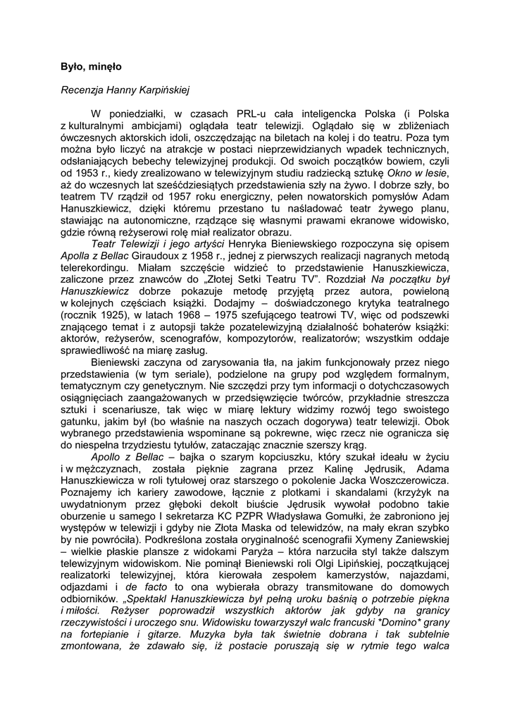 Było, minęło Recenzja Hanny Karpińskiej W poniedziałki, w czasach PRL-u cała inteligencka Polska (i Polska z kulturalnymi ambicjami) oglądała teatr telewizji. Oglądało się w zbliżeniach ówczesnych aktorskich idoli, oszczędzając na biletach na kolej i do teatru. Poza tym można było liczyć na atrakcje w postaci nieprzewidzianych wpadek technicznych, odsłaniających bebechy telewizyjnej produkcji. Od swoich początków bowiem, czyli od 1953 r., kiedy zrealizowano w telewizyjnym studiu radziecką sztukę Okno w lesie, aż do wczesnych lat sześćdziesiątych przedstawienia szły na żywo. I dobrze szły, bo teatrem TV rządził od 1957 roku energiczny, pełen nowatorskich pomysłów Adam Hanuszkiewicz, dzięki któremu przestano tu naśladować teatr żywego planu, stawiając na autonomiczne, rządzące się własnymi prawami ekranowe widowisko, gdzie równą reżyserowi rolę miał realizator obrazu. Teatr Telewizji i jego artyści Henryka Bieniewskiego rozpoczyna się opisem Apolla z Bellac Giraudoux z 1958 r., jednej z pierwszych realizacji nagranych metodą telerekordingu. Miałam szczęście widzieć to przedstawienie Hanuszkiewicza, zaliczone przez znawców do „Złotej Setki Teatru TV”. Rozdział Na początku był Hanuszkiewicz dobrze pokazuje metodę przyjętą przez autora, powieloną w kolejnych częściach książki. Dodajmy – doświadczonego krytyka teatralnego (rocznik 1925), w latach 1968 – 1975 szefującego teatrowi TV, więc od podszewki znającego temat i z autopsji także pozatelewizyjną działalność bohaterów książki: aktorów, reżyserów, scenografów, kompozytorów, realizatorów; wszystkim oddaje sprawiedliwość na miarę zasług. Bieniewski zaczyna od zarysowania tła, na jakim funkcjonowały przez niego przedstawienia (w tym seriale), podzielone na grupy pod względem formalnym, tematycznym czy genetycznym. Nie szczędzi przy tym informacji o dotychczasowych osiągnięciach zaangażowanych w przedsięwzięcie twórców, przykładnie streszcza sztuki i scenariusze, tak więc w miarę lektury widzimy rozwój tego swoistego gatunku, jakim był (bo właśnie na naszych oczach dogorywa) teatr telewizji. Obok wybranego przedstawienia wspominane są pokrewne, więc rzecz nie ogranicza się do niespełna trzydziestu tytułów, zataczając znacznie szerszy krąg. Apollo z Bellac – bajka o szarym kopciuszku, który szukał ideału w życiu i w mężczyznach, została pięknie zagrana przez Kalinę Jędrusik, Adama Hanuszkiewicza w roli tytułowej oraz starszego o pokolenie Jacka Woszczerowicza. Poznajemy ich kariery zawodowe, łącznie z plotkami i skandalami (krzyżyk na uwydatnionym przez głęboki dekolt biuście Jędrusik wywołał podobno takie oburzenie u samego I sekretarza KC PZPR Władysława Gomułki, że zabroniono jej występów w telewizji i gdyby nie Złota Maska od telewidzów, na mały ekran szybko by nie powróciła). Podkreślona została oryginalność scenografii Xymeny Zaniewskiej – wielkie płaskie plansze z widokami Paryża – która narzuciła styl także dalszym telewizyjnym widowiskom. Nie pominął Bieniewski roli Olgi Lipińskiej, początkującej realizatorki telewizyjnej, która kierowała zespołem kamerzystów, najazdami, odjazdami i de facto to ona wybierała obrazy transmitowane do domowych odbiorników. „Spektakl Hanuszkiewicza był pełną uroku baśnią o potrzebie piękna i miłości. Reżyser poprowadził wszystkich aktorów jak gdyby na granicy rzeczywistości i uroczego snu. Widowisku towarzyszył walc francuski *Domino* grany na fortepianie i gitarze. Muzyka była tak świetnie dobrana i tak subtelnie zmontowana, że zdawało się, iż postacie poruszają się w rytmie tego walca z lekkością i salonową elegancją”. Nie mogę na szczęście powiedzieć: szkoda, że państwo tego nie widzieli, bo państwo mogą to dzieło obejrzeć, choćby na kasetach w Bibliotece Narodowej lub nabyć na własność w infosklepie.tv czy empiku. (Choć początkujący recenzent stwierdził po emisji w 2007 r., iż jest to spektakl „głupi i niespieszny”). Henryk Bieniewski nie trzyma się kurczowo Złotej Setki. Wedle gustu wybrał najbardziej reprezentatywne przedstawienia z rozmaitych gatunków i takie, które stały się wzorcem na przyszłość, jak choćby Teatr Faktu zapoczątkowany Epilogiem norymberskim Jerzego Antczaka (reaktywowano go na fali postubeckich rozliczeń w ostatnich latach). A było z czego, bo nagrano i zarchiwizowano ich przeszło cztery tysiące. Mamy więc opis legendarnych już seriali: Pana Tadeusza, Dziewcząt z Nowolipek i Stawki większej niż życie – bo był to serial Teatru Sensacji, zanim historię dzielnego agenta Klossa przerobiono na powtarzaną dziś wersję filmową. Mamy światową klasykę autorstwa Szekspira, Brechta czy Moliera, mamy rozliczenia z okresem międzywojennym, nierzadko stanowiącym wygodną metaforę społeczno – politycznych stosunków współczesnych, jest teatr absurdu (tu autor niezbyt „czuje” temat, ale oddaje sprawiedliwość poszukiwaniom Mrożka, Ionesco i – z młodszych – Lidii Alejko). Przyjemnie poczytać i przypomnieć sobie tak wybitne spektakle jak Chłopcy czy Drewniany talerz z kreacjami Kazimierza Opalińskiego, Stalina z koncertowym duetem Łomnicki – Trela, Bigda idzie z fantastycznym Januszem Gajosem, Noc listopadową z Nowickim i Budzisz – Krzyżanowską, sztukę w realizacji Wajdy, osadzoną w plenerach Łazienek, czy Mistrza Skowrońskiego w reżyserii Jerzego Antczaka z niesłychanie przejmującym Januszem Wareckim. Aż się wzruszyłam, bo przecież to nie same laurki, nie tylko dawnych wspomnień czar, ale świadectwo przemytniczej walki twórców o prawdę i sztukę przez duże „S”, którą starali się uprawiać pomimo przygniatającego jarzma politycznych koncesji. Tu Bieniewski porzuca niekiedy ton rzewnej gawędy na rzecz złośliwych przypomnień „jak było”. „Gdyby odbywało się plenum KC poś