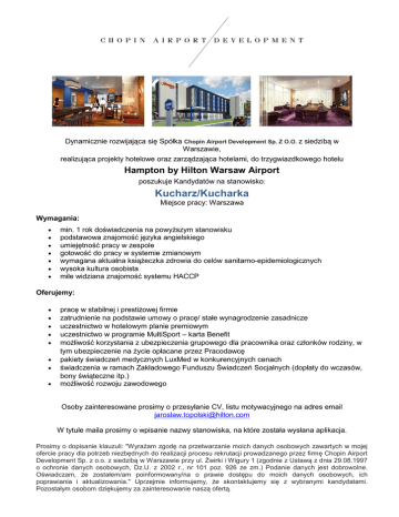 Dynamicznie rozwijająca się Spółka Chopin Airport Development Sp. Z O.O. z siedzibą w Warszawie, realizująca projekty hotelowe oraz zarządzająca hotelami, do trzygwiazdkowego hotelu Hampton by Hilton Warsaw Airport poszukuje Kandydatów na stanowisko: Kucharz/Kucharka Miejsce pracy: Warszawa Wymagania: min. 1 rok doświadczenia na powyższym stanowisku podstawowa znajomość języka angielskiego umiejętność pracy w zespole gotowość do pracy w systemie zmianowym wymagana aktualna książeczka zdrowia do celów sanitarno-epidemiologicznych wysoka kultura osobista mile widziana znajomość systemu HACCP Oferujemy: pracę w stabilnej i prestiżowej firmie zatrudnienie na podstawie umowy o pracę/ stałe wynagrodzenie zasadnicze uczestnictwo w hotelowym planie premiowym uczestnictwo w programie MultiSport – karta Benefit możliwość korzystania z ubezpieczenia grupowego dla pracownika oraz członków rodziny, w tym ubezpieczenie na życie opłacane przez Pracodawcę pakiety świadczeń medycznych LuxMed w konkurencyjnych cenach świadczenia w ramach Zakładowego Funduszu Świadczeń Socjalnych (dopłaty do wczasów, bony świąteczne itp.) możliwość rozwoju zawodowego Osoby zainteresowane prosimy o przesyłanie CV, listu motywacyjnego na adres email [email protected] W tytule maila prosimy o wpisanie nazwy stanowiska, na które została wysłana aplikacja. Prosimy o dopisanie klauzuli: "Wyrażam zgodę na przetwarzanie moich danych osobowych zawartych w mojej ofercie pracy dla potrzeb niezbędnych do realizacji procesu rekrutacji prowadzanego przez firmę Chopin Airport Development Sp. z o.o. z siedzibą w Warszawie przy ul. Żwirki i Wigury 1 (zgodnie z Ustawą z dnia 29.08.1997 o ochronie danych osobowych, Dz.U. z 2002 r., nr 101 poz. 926 ze zm.) Podanie danych jest dobrowolne. Oświadczam, że zostałem/am poinformowany/na o prawie dostępu do moich danych osobowych, ich poprawiania i aktualizowania." Uprzejmie informujemy, że skontaktujemy się z wybranymi kandydatami. Pozostałym osobom dziękujemy za zainteresowanie naszą ofertą.