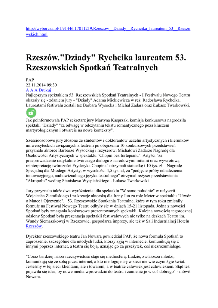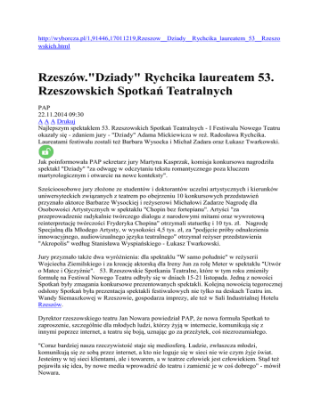 http://wyborcza.pl/1,91446,17011219,Rzeszow__Dziady__Rychcika_laureatem_53__Rzeszo wskich.html Rzeszów."Dziady" Rychcika laureatem 53. Rzeszowskich Spotkań Teatralnych PAP 22.11.2014 09:30 A A A Drukuj Najlepszym spektaklem 53. Rzeszowskich Spotkań Teatralnych - I Festiwalu Nowego Teatru okazały się - zdaniem jury - "Dziady" Adama Mickiewicza w reż. Radosława Rychcika. Laureatami festiwalu zostali też Barbara Wysocka i Michał Zadara oraz Łukasz Twarkowski. Jak poinformowała PAP sekretarz jury Martyna Kasprzak, komisja konkursowa nagrodziła spektakl "Dziady" "za odwagę w odczytaniu tekstu romantycznego poza kluczem martyrologicznym i otwarcie na nowe konteksty". Sześcioosobowe jury złożone ze studentów i doktorantów uczelni artystycznych i kierunków uniwersyteckich związanych z teatrem po obejrzeniu 10 konkursowych przedstawień przyznało aktorce Barbarze Wysockiej i reżyserowi Michałowi Zadarze Nagrodę dla Osobowości Artystycznych w spektaklu "Chopin bez fortepianu". Artyści "za przeprowadzenie radykalnie twórczego dialogu z narodowymi mitami oraz wywrotową reinterpretację twórczości Fryderyka Chopina" otrzymali statuetkę i 10 tys. zł. Nagrodę Specjalną dla Młodego Artysty, w wysokości 4,5 tys. zł, za "podjęcie próby odnalezienia innowacyjnego, audiowizualnego języka teatralnego" otrzymał reżyser przedstawienia "Akropolis" według Stanisława Wyspiańskiego - Łukasz Twarkowski. Jury przyznało także dwa wyróżnienia: dla spektaklu "W samo południe" w reżyserii Wojciecha Ziemilskiego i za kreację aktorską dla Ireny Jun za rolę Meter w spektaklu "Utwór o Matce i Ojczyźnie". 53. Rzeszowskie Spotkania Teatralne, które w tym roku zmieniły formułę na Festiwal Nowego Teatru odbyły się w dniach 15-21 listopada. Jedną z nowości Spotkań były zmagania konkursowe prezentowanych spektakli. Kolejną nowością tegorocznej odsłony Spotkań była prezentacja spektakli festiwalowych nie tylko na deskach Teatru im. Wandy Siemaszkowej w Rzeszowie, gospodarza imprezy, ale też w Sali Industrialnej Hotelu Rzeszów. Dyrektor rzeszowskiego teatru Jan Nowara powiedział PAP, że nowa formuła Spotkań to zaproszenie, szczególnie dla młodych ludzi, którzy żyją w internecie, komunikują się z innymi poprzez internet, a teatru się boją, uznając go za przeżytek, coś niezrozumiałego. "Coraz bardziej nasza rzeczywistość staje się mediosferą. Ludzie, zwłaszcza młodzi, komunikują się ze sobą przez internet, a kto nie loguje się w sieci nie wie czym żyje świat. Jesteśmy w tej sieci klientami, ale i towarem, a w teatrze człowiek jest człowiekiem. Stąd też pojawiła się idea, by nowe media wprowadzić do teatru i zamienić je w coś dobrego" - mówił Nowara. W czasie siedmiu festiwalowych dni zaprezentowano 10 przedstawień z Krakowa, Warszawy, Poznania, Wrocławia, Szczecina, Wałbrzycha i Rzeszowa. Zdaniem Nowary są to najciekawsze realizacje teatralne w Polsce, które wyreżyserowała czołówka reżyserów młodego pokolenia, m.in. Jakub Falkowski, Weronika Szczawińska, Radosław Rychcik, Michał Zadara, Markus Oehrn. W programie Spotkań znalazły się np. remiksy, spektakl-koncert, wideoteatr, performance. Festiwalowa publiczność mogła obejrzeć, obok nagrodzonych przez jurorów przedstawień, aż trzy spektakle Komuny Warszawa: "Paradise Now? Re//mix Living Theatre", w zbiorowej reżyserii; "Bohaterowie przyszłości", reż. Markus hrn i "Teren badań: Jeżycjada", reż. Weronika Szczawińska. Ten ostatni spektakl został przygotowany wraz z Centrum Kultury Zamek w Poznaniu. Widzowie obejrzeli też spektakl inaugurujący festiwal "Stara kobieta wysiaduje" Tadeusza Różewicza w wykonaniu Teatru im. Wandy Siemaszkowej w Rzeszowie, w reżyserii Jakuba Falkowskiego oraz przedstawienie "Umwuka" w reżyserii Jana Naturskiego według "Dziś narysujemy śmierć" Wojciecha Tochmana, w wykonaniu artystów Teatru Muzycznego Capitol we Wrocławiu. Pokazom konkursowym towarzyszyły różne działania artystyczne m.in. czytania performatywne nowych sztuk, spotkania z twórcami. Nowa formuła Rzeszowskich Spotkań Teatralnych - Festiwal Nowego Teatru zastąpiła dotychczasowy Festiwal Scenografów i Kostiumografów RST VizuArt, który odbywał się przez ostatnie dwa lata. Pomysłodawcą poprzedniej formuły był ówczesny dyrektor rzeszowskiego teatru Remigiusz Caban. Cały tekst: http://wyborcza.pl/1,91446,17011219,Rzeszow__Dziady__Rychcika_laureatem_53__Rzeszo wskich.html#ixzz3K04TvYjT