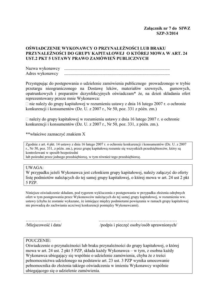 Załącznik nr 7 do SIWZ SZP-3/2014 OŚWIADCZENIE WYKONAWCY O PRZYNALEŻNOŚCI LUB BRAKU PRZYNALEŻNOŚCI DO GRUPY KAPITAŁOWEJ O KTÓREJ MOWA W ART. 24 UST.2 PKT 5 USTAWY PRAWO ZAMÓWIEŃ PUBLICZNYCH Nazwa wykonawcy ................................................................................................. Adres wykonawcy ................................................................................................. Przystępując do postępowania o udzielenie zamówienia publicznego prowadzonego w trybie przetargu nieograniczonego na Dostawę leków, materiałów szewnych, gumowych, opatrunkowych i preparatów dezynfekcyjnych oświadczam* że, na dzień składania ofert reprezentowany przeze mnie Wykonawca: nie należy do grupy kapitałowej w rozumieniu ustawy z dnia 16 lutego 2007 r. o ochronie konkurencji i konsumentów (Dz. U. z 2007 r., Nr 50, poz. 331 z późn. zm.) należy do grupy kapitałowej w rozumieniu ustawy z dnia 16 lutego 2007 r. o ochronie konkurencji i konsumentów (Dz. U. z 2007 r., Nr 50, poz. 331, z późn. zm.). **właściwe zaznaczyć znakiem X Zgodnie z art. 4 pkt. 14 ustawy z dnia 16 lutego 2007 r. o ochronie konkurencji i konsumentów (Dz. U. z 2007 r., Nr 50, poz. 331, z późn. zm.), przez grupę kapitałową rozumie się wszystkich przedsiębiorców, który są kontrolowani w sposób bezpośredni lub pośredni przez jednego przedsiębiorcę, w tym również tego przedsiębiorcę. UWAGA: W przypadku jeżeli Wykonawca jest członkiem grupy kapitałowej, należy załączyć do oferty listę podmiotów należących do tej samej grupy kapitałowej, o której mowa w art. 24 ust 2 pkt 5 PZP. Niniejsze oświadczenie składam, pod rygorem wykluczenia z postępowania w przypadku złożenia odrębnych ofert w tym postępowaniu przez Wykonawców należących do tej samej grupy kapitałowej, w rozumieniu ww. ustawy (chyba że zostanie wykazane, że istniejące między podmiotami powiązania w ramach grupy kapitałowej nie prowadzą do zachwiania uczciwej konkurencji pomiędzy Wykonawcami). …………………… /Miejscowość i data/ ……………………………………………… /podpis i pieczęć osoby/osób uprawnionych/ POUCZENIE: Oświadczenie o przynależności lub braku przynależności do grupy kapitałowej, o której mowa w art. 24 ust. 2 pkt 5 PZP, składa każdy Wykonawca – w tym, z osobna każdy Wykonawca ubiegający się wspólnie o udzielenie zamówienia, chyba że z treści pełnomocnictwa udzielonego na podstawie art. 23 ust. 3 PZP wynika umocowanie pełnomocnika do złożenia takiego oświadczenia w imieniu Wykonawcy wspólnie ubiegającego się o udzielenie zamówienia.