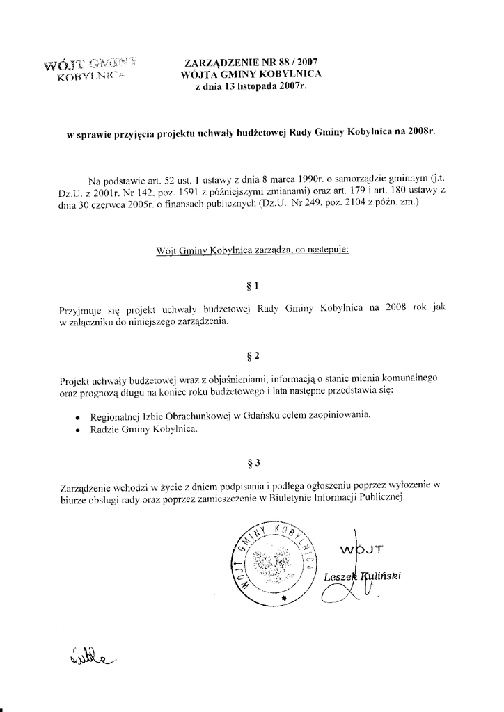 w sprawie przyigcia projektu uchwaly bud2etowejRady Gminy Kobylnica na 2008r'