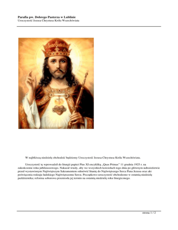 Parafia pw. Dobrego Pasterza w Lublinie Uroczystość Jezusa Chrystusa Króla Wszechświata W najbliższą niedzielę obchodzić będziemy Uroczystość Jezusa Chrystusa Króla Wszechświata. Uroczystość tę wprowadził do liturgii papież Pius XI encykliką „Quas Primas” 11 grudnia 1925 r. na zakończenie roku jubileuszowego. Nakazał wtedy, aby we wszystkich kościołach tego dnia po głównym nabożeństwie przed wystawionym Najświętszym Sakramentem odmówić litanię do Najświętszego Serca Pana Jezusa oraz akt poświęcenia rodzaju ludzkiego Najświętszemu Sercu. Początkowo uroczystość obchodzono w ostatnią niedzielę października; reforma soborowa przeniosła jej termin na ostatnią niedzielę roku liturgicznego. strona 1 / 2 Parafia pw. Dobrego Pasterza w Lublinie Uroczystość Jezusa Chrystusa Króla Wszechświata Uroczystość ta ma nam uświadomić, że Chrystus jest Królem całego stworzenia - wszechświata. Jego panowanie nie wynika z jakichś dokonań, z wybrania czy z wywalczenia tej godności. On jest Królem, bo jest Bogiem-Człowiekiem, Stworzycielem i Odkupicielem. Z tego właśnie tytułu ma absolutną władzę. Bóg nie tylko stworzył świat, ale ciągle go stwarza i nim włada. Królestwo Jezusa jest czymś zupełnie innym od wszystkich królestw ziemskich. Dotyczy ono wszystkich narodów, wszystkich miejsc i wszystkich czasów. Ono już istnieje w Kościele, choć jeszcze nie zostało do końca wypełnione. Dlatego właśnie w codziennej modlitwie, którą zostawił nam sam Chrystus, wołamy z nadzieją: Przyjdź królestwo Twoje! Chociaż Chrystus nigdy nie nosił korony królewskiej, nie trzymał w ręku berła i nie zasiadał na tronie królewskim, tytuł Króla najzupełniej Mu się należy i to w zakresie, jakim nie dysponował żaden władca świata. Władcy ziemscy nabywają tytuł królewski przez dziedziczenie, nominację i podbój. Wszystkie trzy tytuły dają Chrystusowi pełne prawo do korony i najwyższej władzy. Jako człowiek, w swej ludzkiej naturze, pochodził on przecież w prostej linii od króla Izraela, Dawida. Wykazują to Ewangeliści, podając Jego rodowód (Mt 1, 5-16; Łk 3, 23-38). W narodzie wybranym ta prawda była tak pospolicie znana, że powszechnie nazywano Go Synem Dawida (Mt 22, 41-46; Mk 12, 35-37; Łk 1, 27. 32; 20, 41-44; 2 Tm 2, 8; Ap 22, 16). Tak więc z krwi i dziedziczenia Chrystus miał prawo do tytułu Króla. Chrystus jest ponadto Synem Bożym, naturą równy Bogu, drugą Osobą Trójcy Przenajświętszej. Jako taki jest Panem nieba i ziemi, Panem najwyższym i absolutnym, wobec którego wszelkie królestwa ziemskie są nieporównywalne. Aby to powszechne władztwo Jezusa podkreślić, liturgia dodała do tytułu "Król" dopełniacz "Wszechświata". strona 2 / 2