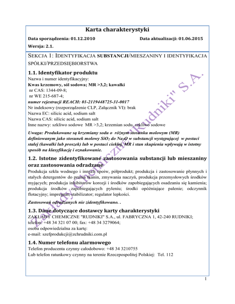 Karta charakterystyki Data sporządzenia: 01.12.2010 Data aktualizacji: 01.06.2015 Wersja: 2.1. SEKCJA 1: IDENTYFIKACJA SUBSTANCJI/MIESZANINY I IDENTYFIKACJA SPÓŁKI/PRZEDSIĘBIORSTWA 1.1. Identyfikator produktu Nazwa i numer identyfikacyjny: Kwas krzemowy, sól sodowa; MR >3,2; kawałki nr CAS: 1344-09-8; nr WE 215-687-4; numer rejestracji REACH: 01-2119448725-31-0017 Nr indeksowy (rozporządzenie CLP, Załącznik VI): brak Nazwa EC: silicic acid, sodium salt Nazwa CAS: silicic acid, sodium salt Inne nazwy: szkliwo sodowe MR >3,2; krzemian sodu, szkliwo sodowe Uwaga: Produkowane są krzemiany sodu o różnym stosunku molowym (MR) definiowanym jako stosunek molowy SiO2 do Na2O w substancji występującej w postaci stałej (kawałki lub proszek) lub w postaci ciekłej. MR i stan skupienia wpływają w istotny sposób na klasyfikację i oznakowanie. 1.2. Istotne zidentyfikowane zastosowania substancji lub mieszaniny oraz zastosowania odradzane Produkcja szkła wodnego i innych spoiw, półprodukt; produkcja i zastosowanie płynnych i stałych detergentów do prania tkanin, zmywania naczyń, produkcja przemysłowych środków myjących; produkcja inhibitorów korozji i środków zapobiegających osadzaniu się kamienia; produkcja środków zapobiegających pyleniu; środki opóźniające palenie; odczynnik flotacyjny; impregnat; stabilizator; regulator lepkości. Zastosowań odradzanych nie zidentyfikowano. . 1.3. Dane dotyczące dostawcy karty charakterystyki ZAKŁADY CHEMICZNE "RUDNIKI" S.A., ul. FABRYCZNA 1, 42-240 RUDNIKI; telefon: +48 34 321 07 00; fax: +48 34 3279064; osoba odpowiedzialna za kartę: e-mail: [email protected] 1.4. Numer telefonu alarmowego Telefon producenta czynny całodobowo: +48 34 3210755 Lub telefon ratunkowy czynny na terenie Rzeczpospolitej Polskiej: Tel. 112 1 SEKCJA 2: IDENTYFIKACJA ZAGROŻEŃ 2.1. Klasyfikacja substancji lub mieszaniny Substancja nie sklasyfikowana 2.2 Elementy oznakowania Substancja nie wymaga oznakowania 2.3. Inne zagrożenia Substancja nie spełnia kryteriów PBT lub vPvB zgodnie z załącznikiem XIII REACH. SEKCJA 3: SKŁAD/INFORMACJA O SKŁADNIKACH 3.1. Substancje Nazwa chemiczna: Kwas krzemowy, sól sodowa o module MR >3,2 Zawartość substancji czystej: 99%(Na2O+SiO2), Powszechnie stosowana nazwa własna: szkliwo sodowe o module >3,2 Nazwa EC: silicic acid , sodium salt, nr EC: 215-687-4 Nazwa CAS: silicic acid , sodium salt; nr CAS: 1344-09-8; Nazwa IUPAC sodium hydroxy(oxo)silanolate Inne nazwy: krzemian sodu Wzór chemiczny: Na2O. nO2Si Opis substancji: Substancja nieorganiczna typu UVCB. Jest kompozycją oligomerów anionów krzemianowych SiO4 połączonych z kationami sodu. Budowa strukturalna substancji i jej właściwości są zależne od stosunku molowego SiO2 do Na2O nazywanego inaczej modułem molowym MR. Opisywany produkt o MR >3,2 charakteryzują zawartości (dla stężenia 100% substancji Na2O. nO2Si) MR Zawartość SiO2 Zawartość Na2O >3,2 >67% < 33% Opis zanieczyszczeń: Zanieczyszczenia występują w ilości poniżej 1% masowych i nie mają wpływu na klasyfikację substancji. Są to naturalne tlenki metali będących zanieczyszczeniem piasku kwarcowego (surowca), np. tlenki: glinu, wapnia, tytanu, magnezu, żelaza itp. oraz NaCl i Na2SO4. . SEKCJA 4: ŚRODKI PIERWSZEJ POMOCY 4.1. Opis środków pierwszej pomocy Substancja nie jest niebezpieczna dla ludzi. Należy unikać kontaktu z nieosłonięta skórą lub oczami. W PRZYPADKU DOSTANIA SIĘ SUBSTANCJI DO OCZU: Usunąć mechanicznie. Ostrożnie płukać wodą przez co najmniej 10 minut. Wyjąć soczewki kontaktowe, jeżeli są i można je łatwo usunąć. Zapewnić pomoc lekarza okulisty. W PRZYPADKU KONTATKU ZE SKÓRĄ Spłukać skórę pod strumieniem wody lub prysznicem. W PRZYPADKU POŁKNIĘCIA wypłukać usta, nie wywoływać wymiotów. PO WDYCHANIU pyłu substancji w przypadku złego samopoczucia wyprowadzić na 2 świeże powietrze. 4.2. Najważniejsze ostre i opóźnione objawy oraz skutki narażenia Substancja stała, słabo rozpuszczalna w wodzie. Na powierzchni może się wytwarzać warstwa rozpuszczalnego, alkalicznego Na2CO3 na skutek kontaktu z CO2 z powietrza. Kontakt ze skórą może powodować niegroźne podrażnienia. Przypadkowe wprowadzenie substancji do oka grozi podrażnieniem oka. Połknięcie substancji powoduje uszkodzenie śluzówki. 4.3. Wskazania dotyczące wszelkiej natychmiastowej lekarskiej i szczególnego postępowania z poszkodowanym pomocy W przypadku przedostania się substancji do oczu i nie ustąpienia podrażnienia lub zaczerwienienia oczu po przemyciu dużą ilością wody należy natychmiast udzielić poszkodowanemu pomocy lekarza okulisty. Każdorazowo, w przypadku korzystania z pomocy lekarskiej zaleca się przedstawić udzielającemu pomocy niniejszą kartę charakterystyki. SEKCJA 5: POSTĘPOWANIE W PRZYPADKU POŻARU 5.1. Środki gaśnicze Substancja niepalna i nie podtrzymująca palenia. W przypadku zaistnienia pożaru stosować środki odpowiednie dla materiałów znajdujących się w pobliżu. Brak danych o środkach nie zalecanych przy gaszeniu pożaru. 5.2. Szczególne zagrożenia związane z substancją lub mieszaniną Substancja stała, niepalna, niewybuchowa. Reaguje ze stężonym kwasem fluorowodorowym. 5.3. Informacje dla straży pożarnej Należy unikać bezpośredniego kontaktu z nieosłonięta skórą i z oczami. Substancja słabo rozpuszczalna w wodzie, alkaliczna. Unikać przedostania się do wód powierzchniowych lub gruntowych. SEKCJA 6: POSTĘPOWANIE W PRZYPADKU NIEZAMIERZONEGO UWOLNIENIA DO ŚRODOWISKA 6.1. Indywidualne środki ostrożności, sprzęt ochronne i procedury w sytuacjach awaryjnych Unikać kontaktu ze skórą i oczami. Nakładać odzież ochronną ogólnego stosowania i rękawice drelichowe lub gumowe. Zanieczyszczoną odzież zdjąć i wyprać przed ponownym użyciem. 6.2. Środki ostrożności w zakresie ochrony środowiska Unikać przedostawania się produktu do kanalizacji, wód powierzc