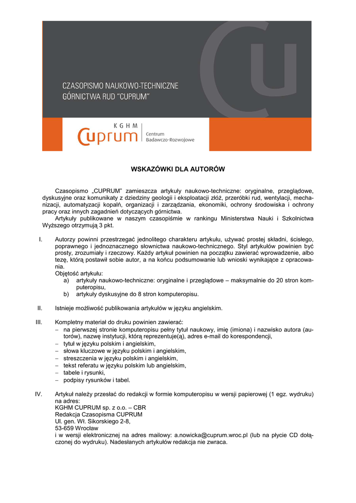 WSKAZÓWKI DLA AUTORÓW Czasopismo „CUPRUM” zamieszcza artykuły naukowo-techniczne: oryginalne, przeglądowe, dyskusyjne oraz komunikaty z dziedziny geologii i eksploatacji złóŜ, przeróbki rud, wentylacji, mechanizacji, automatyzacji kopalń, organizacji i zarządzania, ekonomiki, ochrony środowiska i ochrony pracy oraz innych zagadnień dotyczących górnictwa. Artykuły publikowane w naszym czasopiśmie w rankingu Ministerstwa Nauki i Szkolnictwa WyŜszego otrzymują 3 pkt. I. Autorzy powinni przestrzegać jednolitego charakteru artykułu, uŜywać prostej składni, ścisłego, poprawnego i jednoznacznego słownictwa naukowo-technicznego. Styl artykułów powinien być prosty, zrozumiały i rzeczowy. KaŜdy artykuł powinien na początku zawierać wprowadzenie, albo tezę, którą postawił sobie autor, a na końcu podsumowanie lub wnioski wynikające z opracowania. Objętość artykułu: a) artykuły naukowo-techniczne: oryginalne i przeglądowe – maksymalnie do 20 stron komputeropisu, b) artykuły dyskusyjne do 8 stron komputeropisu. II. Istnieje moŜliwość publikowania artykułów w języku angielskim. III. Kompletny materiał do druku powinien zawierać: − na pierwszej stronie komputeropisu pełny tytuł naukowy, imię (imiona) i nazwisko autora (autorów), nazwę instytucji, którą reprezentuje(ą), adres e-mail do korespondencji, − tytuł w języku polskim i angielskim, − słowa kluczowe w języku polskim i angielskim, − streszczenia w języku polskim i angielskim, − tekst referatu w języku polskim lub angielskim, − tabele i rysunki, − podpisy rysunków i tabel. IV. Artykuł naleŜy przesłać do redakcji w formie komputeropisu w wersji papierowej (1 egz. wydruku) na adres: KGHM CUPRUM sp. z o.o. – CBR Redakcja Czasopisma CUPRUM Ul. gen. Wł. Sikorskiego 2-8, 53-659 Wrocław i w wersji elektronicznej na adres mailowy: [email protected] (lub na płycie CD dołączonej do wydruku). Nadesłanych artykułów redakcja nie zwraca. WSKAZÓWKI EDYTORSKIE 1) Tekst zasadniczy naleŜy przygotować wykorzystując edytor Word for Windows, czcionka Arial 10 pkt. 2) Pod tytułem w języku polskim (czcionka Arial 14 pkt., pogrubiona), naleŜy zamieścić słowa kluczowe oraz krótkie (maksymalnie 10 wierszy) streszczenie w języku polskim. Czcionka Arial 9 pkt., kursywa. 3) NaleŜy takŜe zamieścić tytuł artykułu w j. angielskim (czcionka Arial 12 pkt. pogrubiona) oraz słowa kluczowe i krótkie streszczenie w j. angielskim (czcionka Arial 9 pkt. kursywa). 4) Układ treści powinien być przejrzysty, zwarty i podzielony na części. 5) Przy podziale tekstu na rozdziały i podrozdziały naleŜy stosować numerację cyfrową wielorzędową: rozdziały – 1, 2, ... ; podrozdziały pierwszego stopnia – 1.1, 1.2, ..., 2.1, 2.2, ...; podrozdziały drugiego stopnia – 1.1.1, 1.1.2, ..., 1.2.1, 1.2.2, ... Czcionka Arial 11 pkt., pogrubiona. 6) Rysunki, fotografie i tabele naleŜy numerować od 1 do n w obrębie całego artykułu. Rysunki, schematy, fotografie (w postaci nadającej się do reprodukcji) powinny być zamieszczone w treści komputeropisu, w miejscu, gdzie są one opisane w tekście. KaŜdy z nich powinien być na dole oznaczony kolejnym numerem wraz z opisem przedstawionej na nim treści, np., „Rys. 2. Schemat pola eksploatacyjnego”. Czcionka Arial 9 pkt. 7) Na rysunki i tabele w tekście naleŜy powoływać się w nawiasach półokrągłych, np. (rys. 3), (tab. 4), a na źródła literaturowe, zestawione na końcu artykułu, w nawiasach kwadratowych, np. [12]. 8) Wzory matematyczne naleŜy umieszczać w oddzielnych wierszach tekstu, podając numer ujęty w nawiasy okrągłe na prawym marginesie. 9) Jednostki fizyczne powinny być wyznaczone według ogólnie przyjętych norm międzynarodowych (układ SI) i podawane w nawiasach. 10) Wykaz najistotniejszych źródeł literaturowych naleŜy podać na końcu artykułu w porządku alfabetycznym (z oznaczeniem „Bibliografia”), w postaci kolejnych punktów w nawiasach kwadratowych. W trakcie wpisywania tekstu prosimy o przestrzeganie następujących zasad: − nie naleŜy kończyć poszczególnych wierszy klawiszem ENTER, − nie stosować wcięć akapitowych za pomocą tabulatora czy spacji, − nie dzielić ręcznie wyrazów, − nie justować poszczególnych linii akapitu za pomocą klawisza spacji, − nie rozspacjowywać wyrazów (np. t y t u ł).